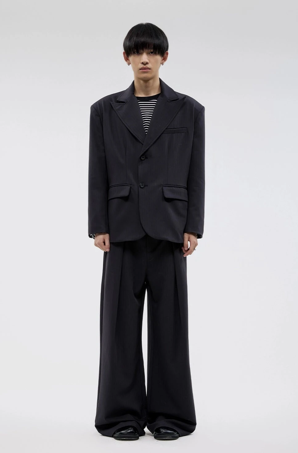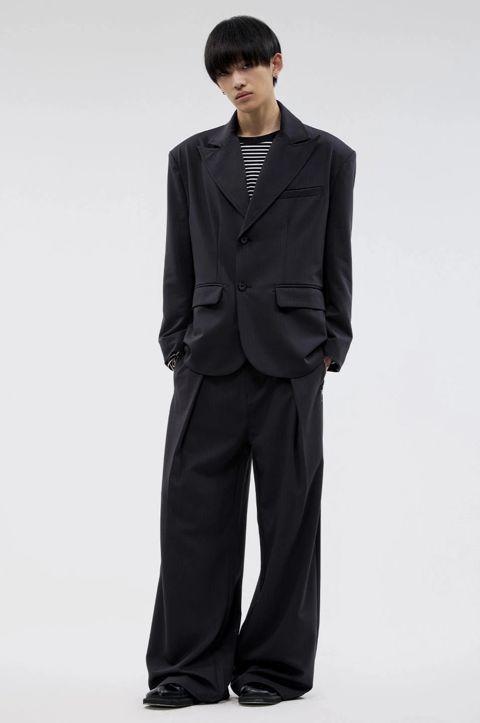 The structured pinstripe design, paired with wide pleats, creates a striking silhouette that balances relaxed tailoring with a polished finish. Crafted from lightweight yet durable fabric, these trousers deliver maximum comfort without sacrificing style. Subtle pleats flow into the wide-leg cut, offering freedom of movement while maintaining a sharp, elevated look.