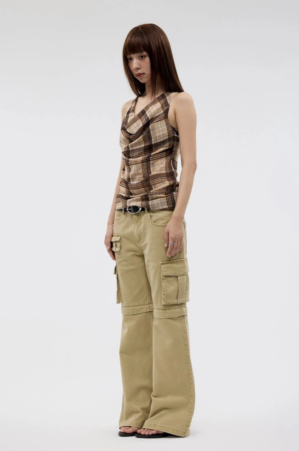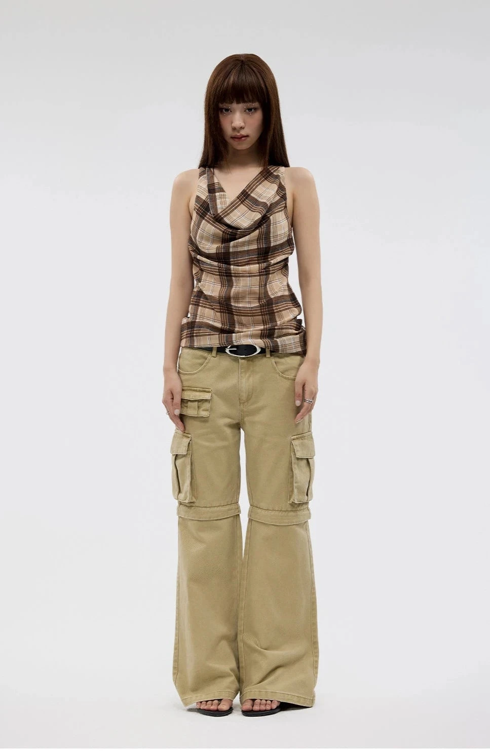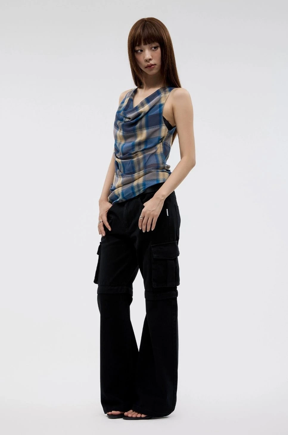 Strike a balance between timeless style and modern flair with our Plaid Cowl Neck Sleeveless Top.