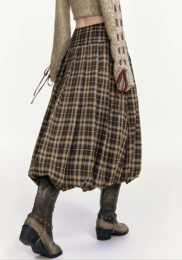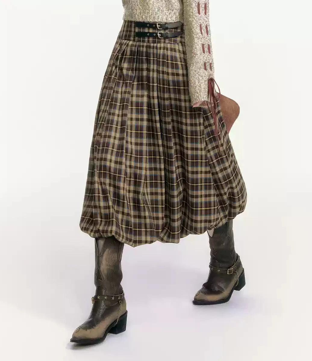 Effortlessly structured yet subtly undone, this pleated plaid balloon midi skirt brings a modern edge to a classic silhouette.