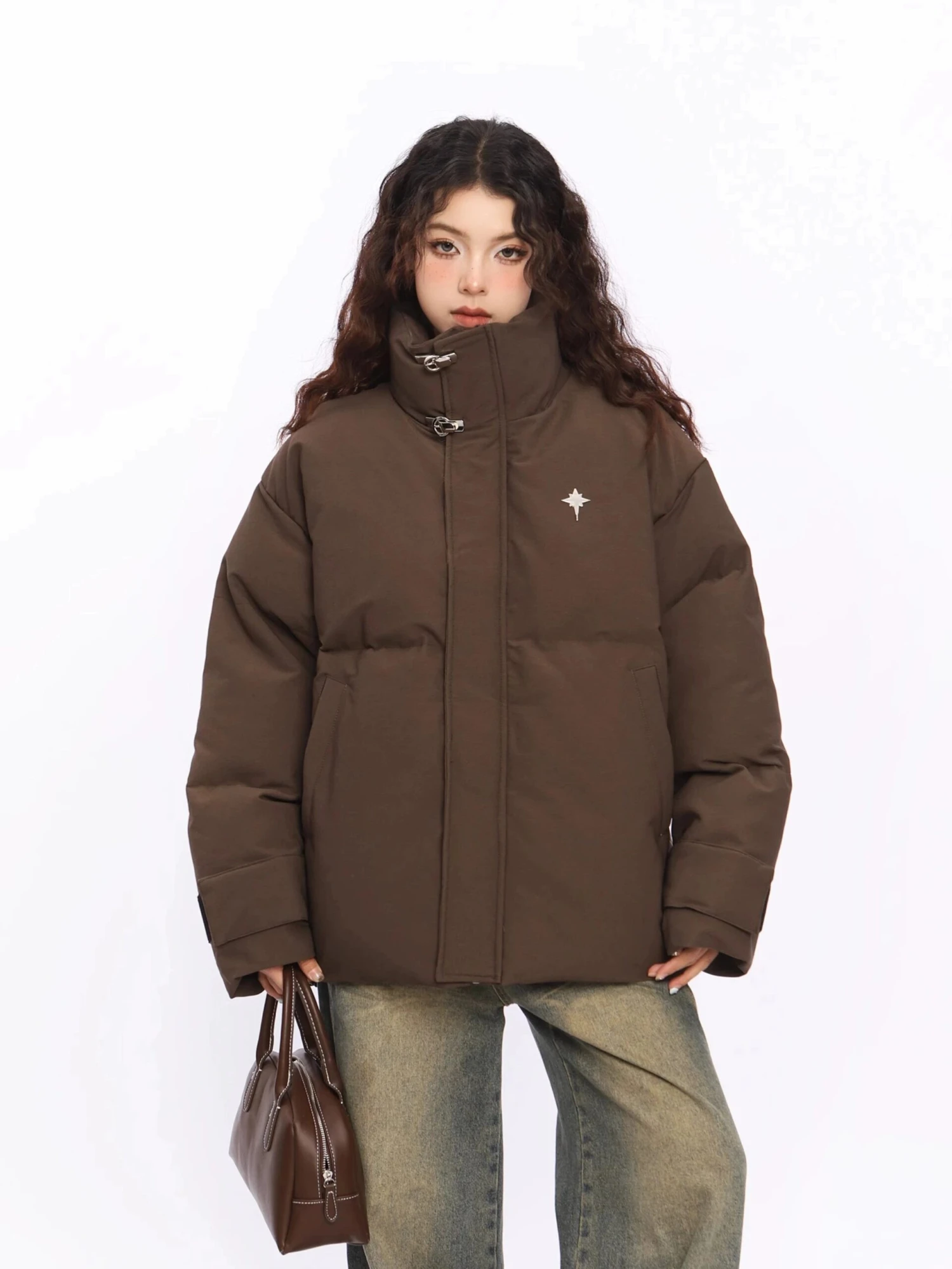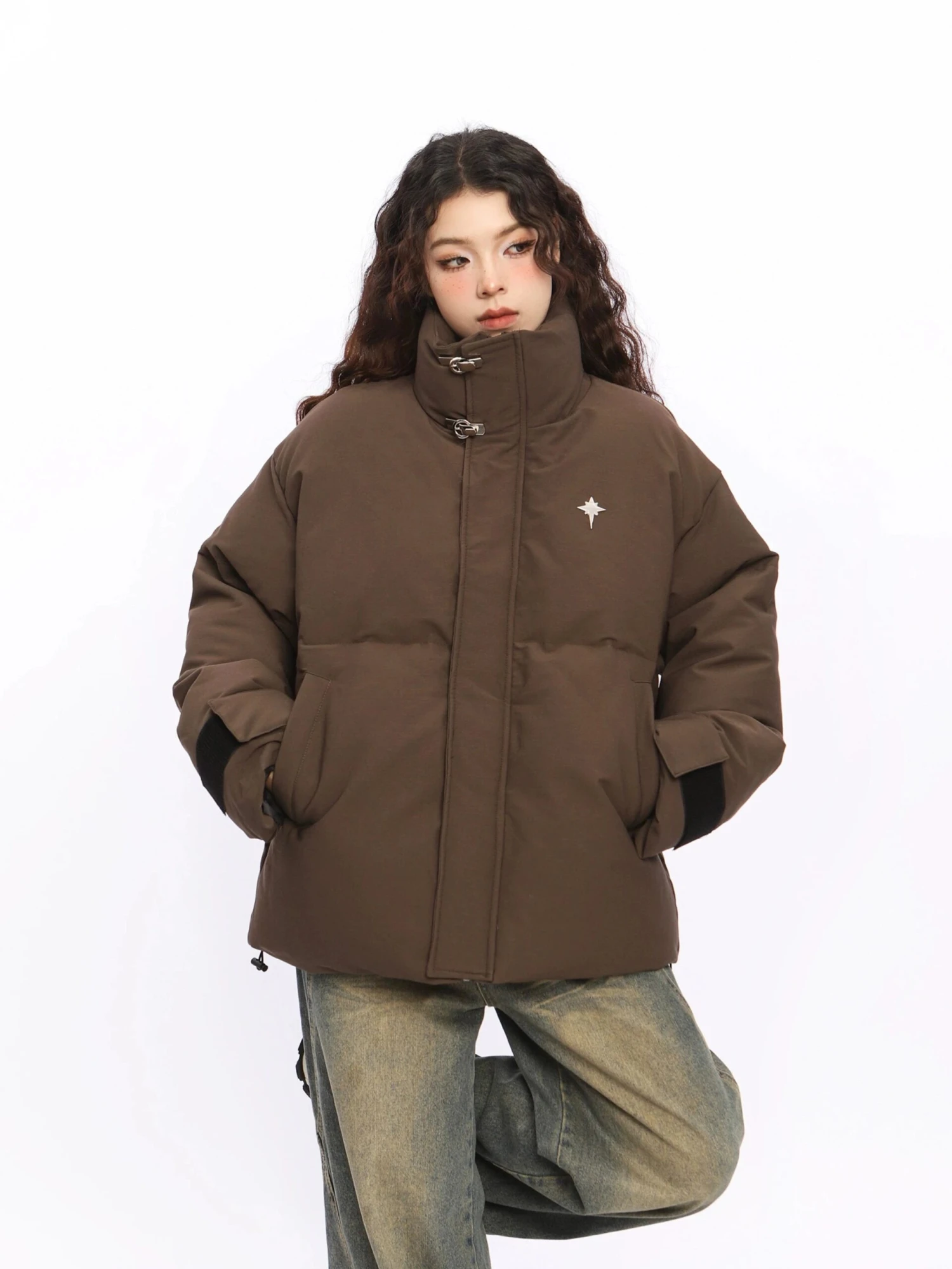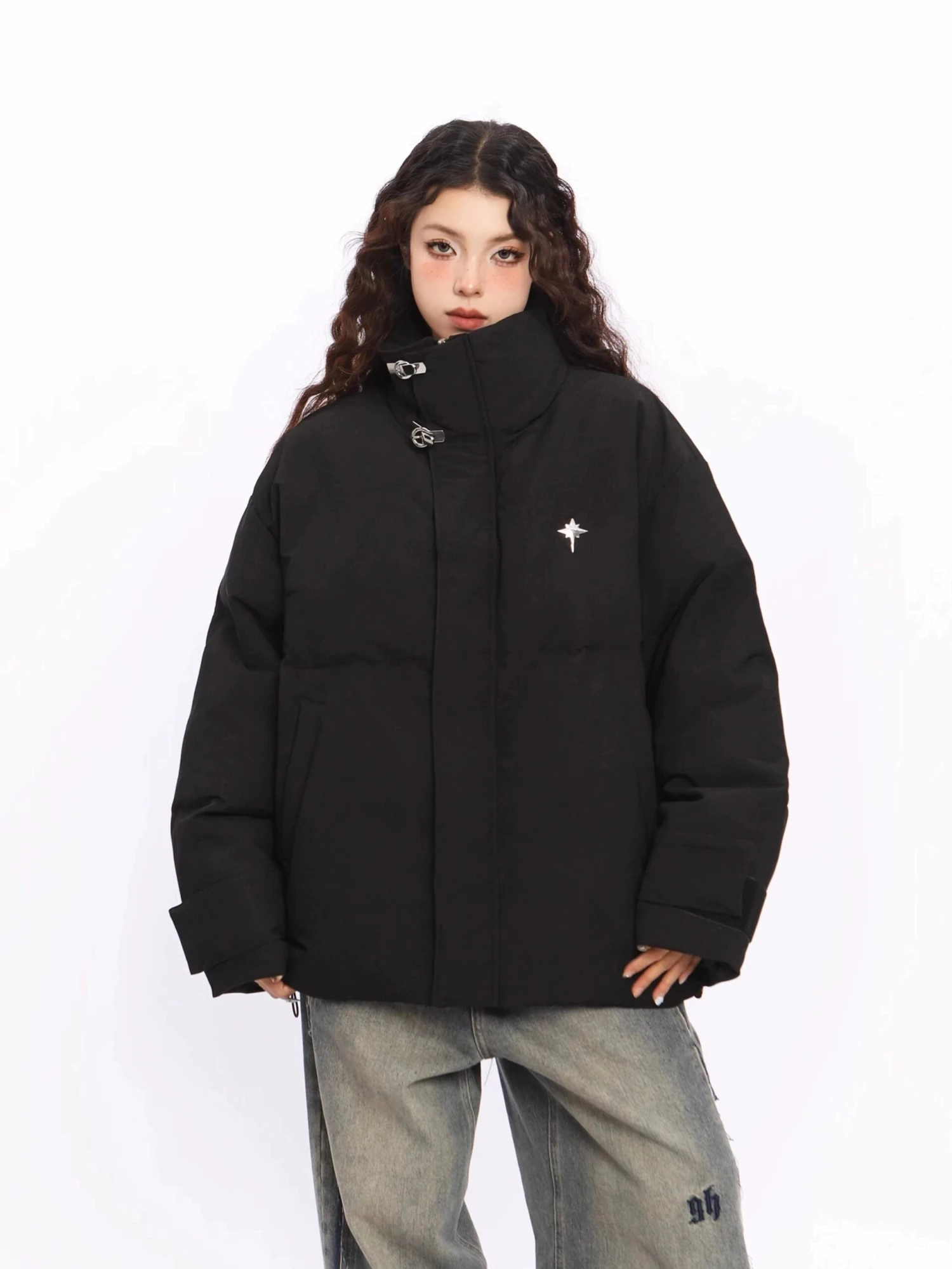 Embrace the winter with sophistication in this Puffer Jacket with High Collar Buckles Detail.