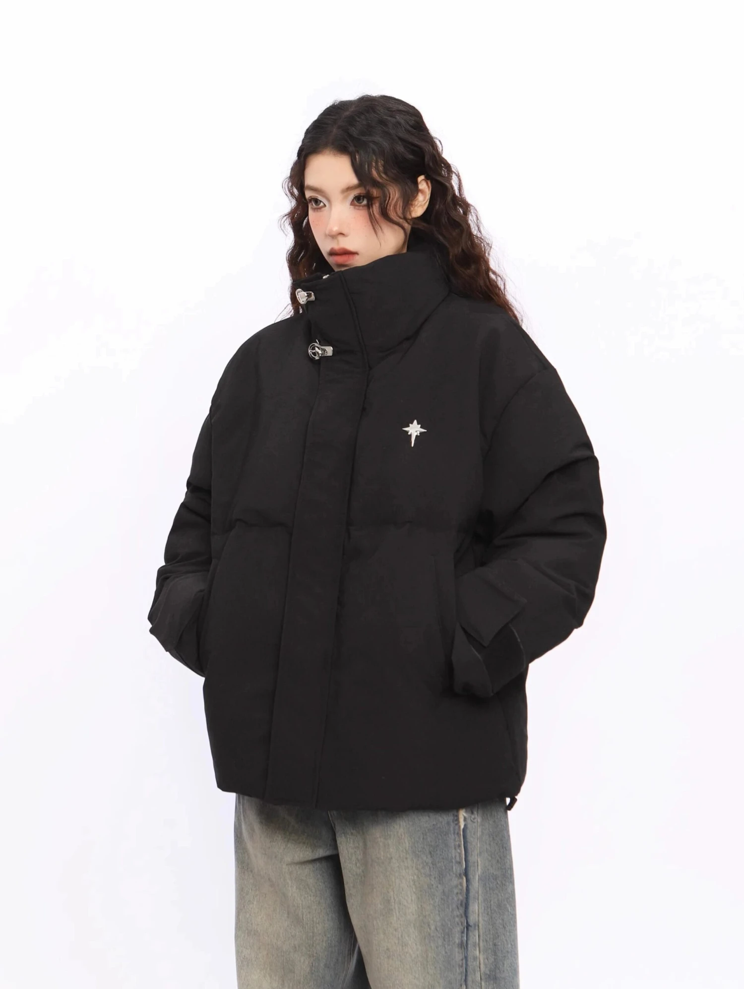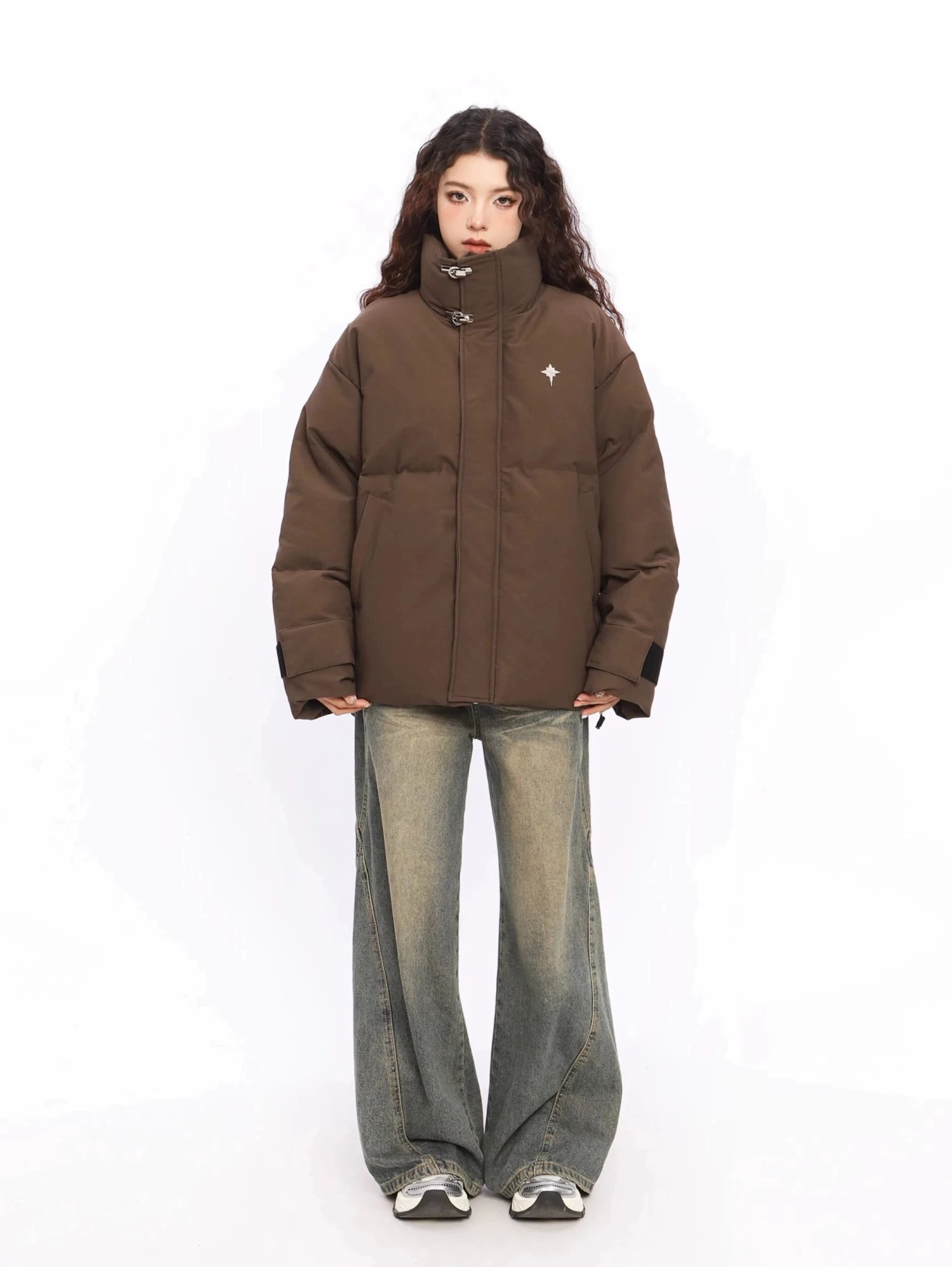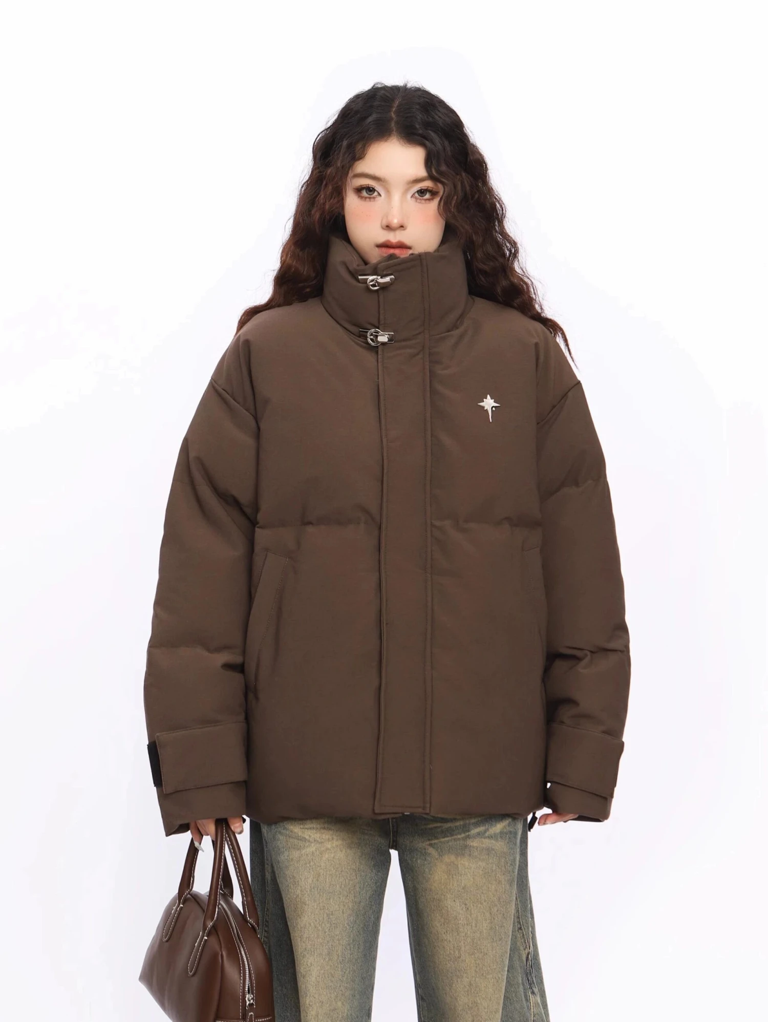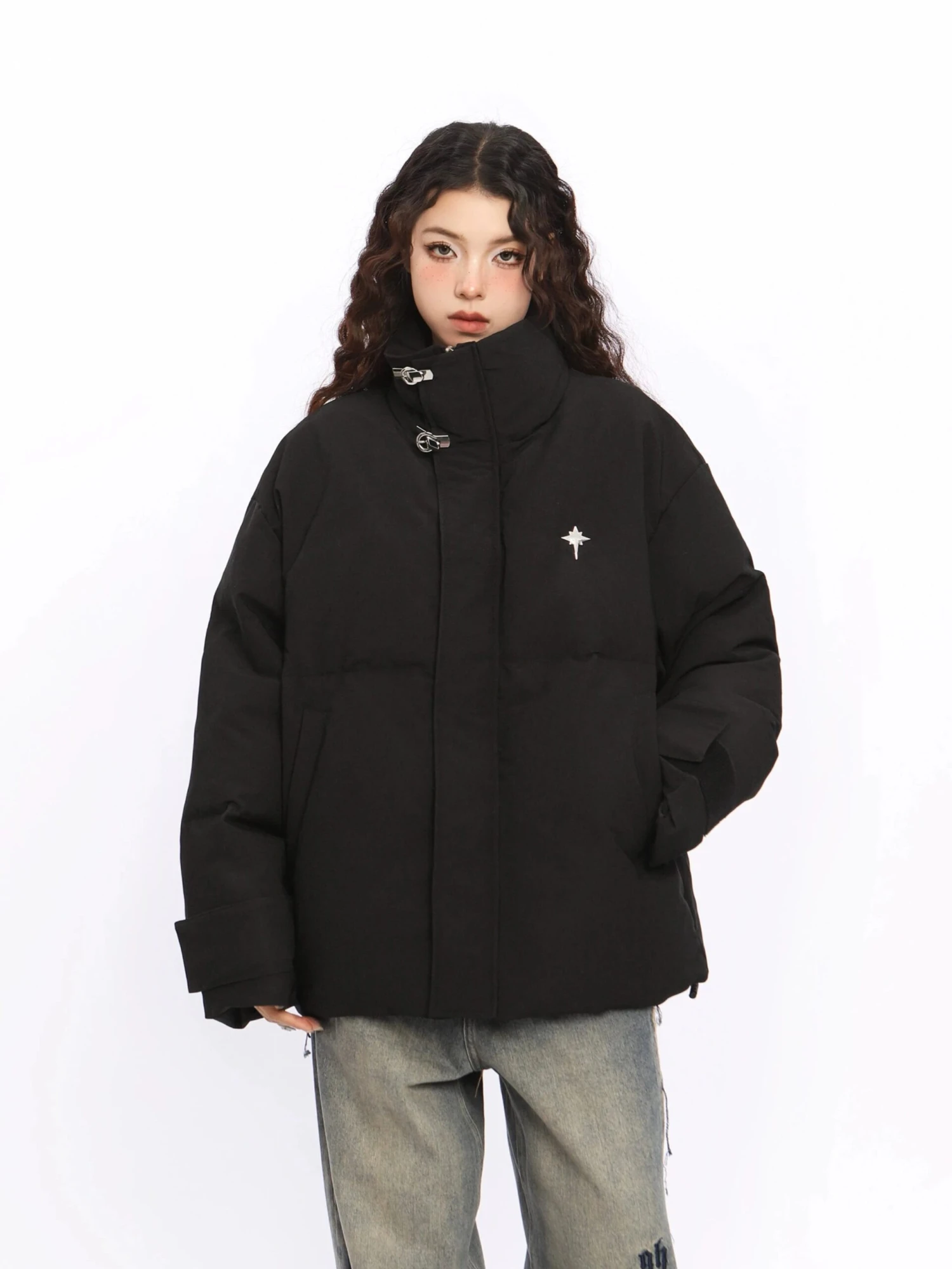 Embrace the winter with sophistication in this Puffer Jacket with High Collar Buckles Detail.