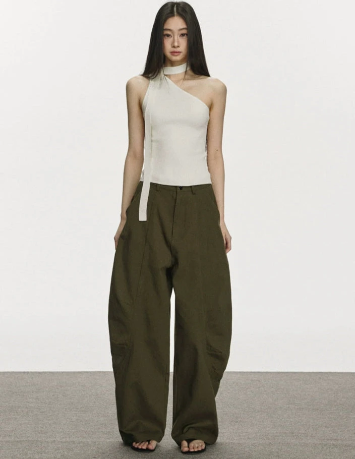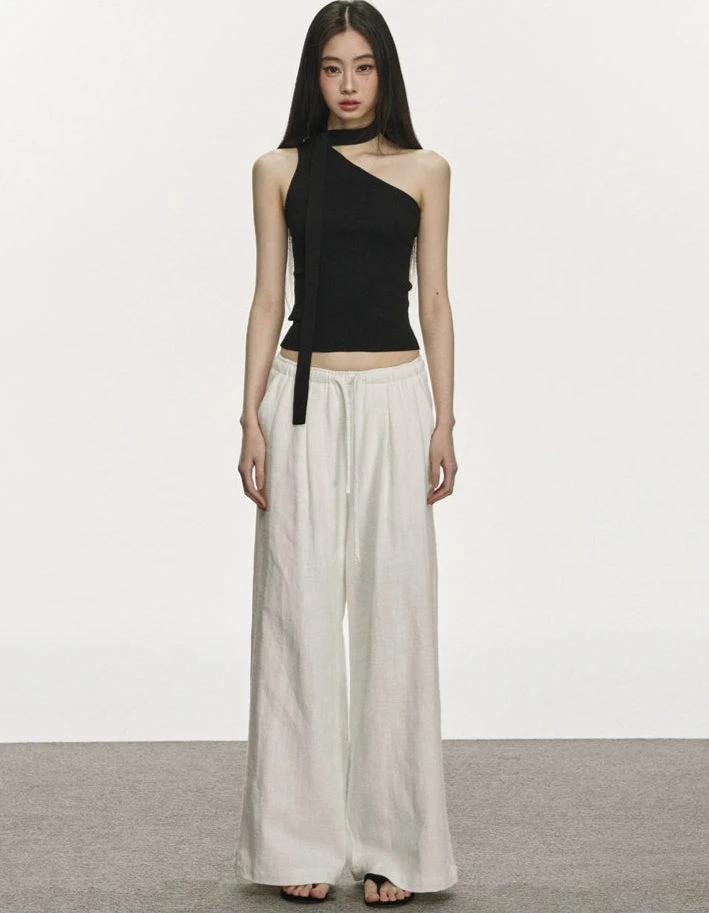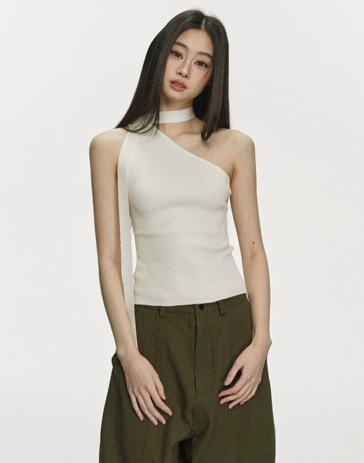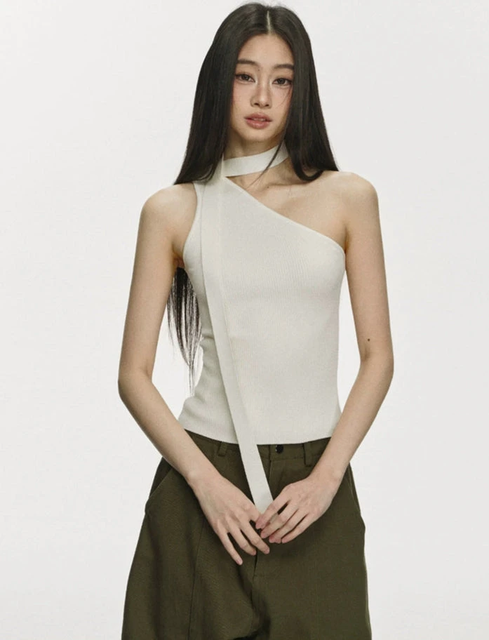Its minimal but pointed design adds just enough edge without trying too hard. Crafted from a soft, stretchy knit, the fabric holds close to the body while staying lightweight and breathable. The ribbed texture offers subtle structure, and the scarf tie lends a styled finish—whether left loose, tied off, or tucked.