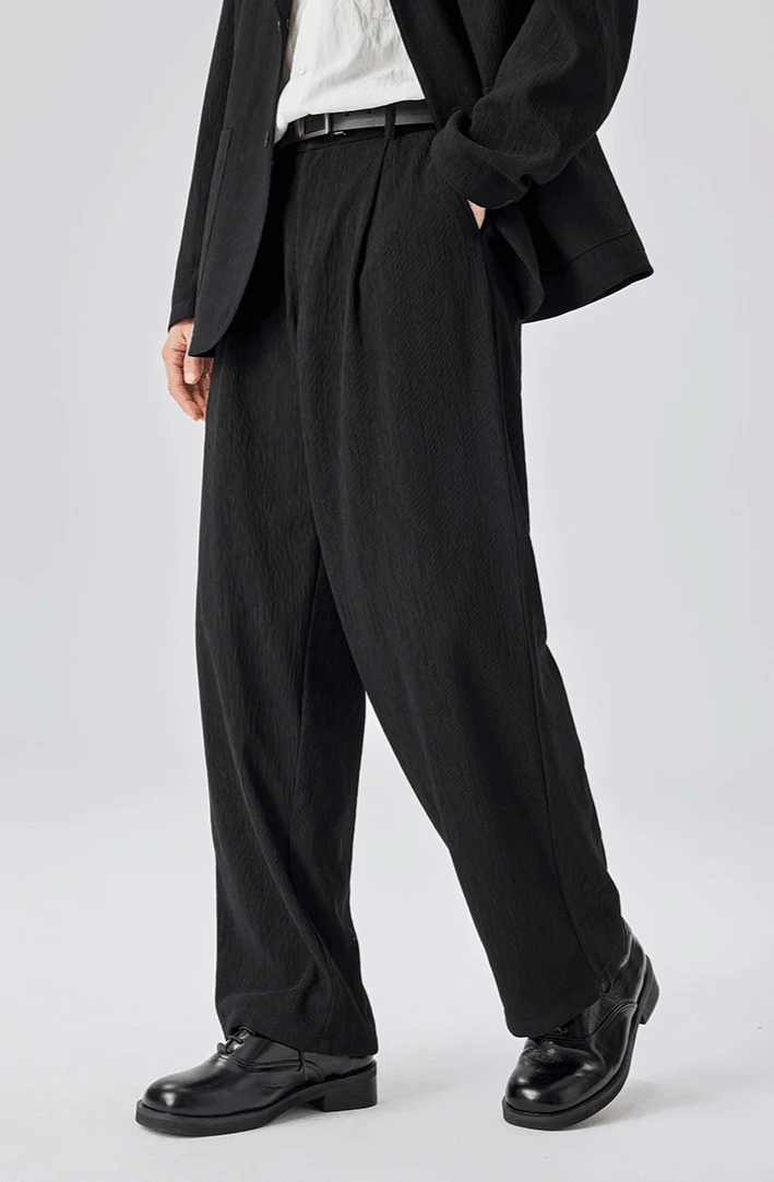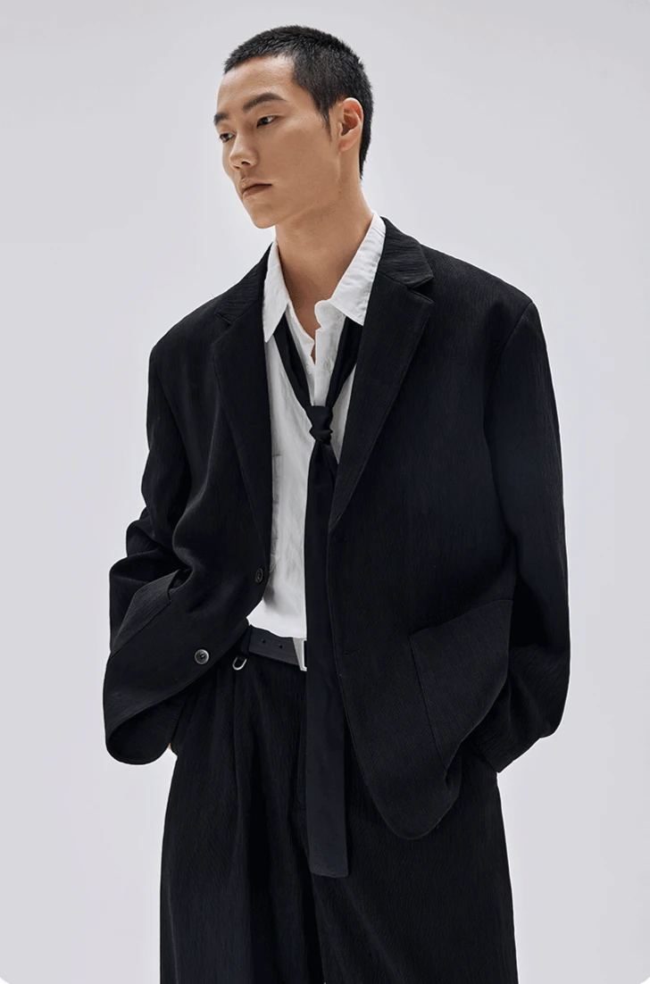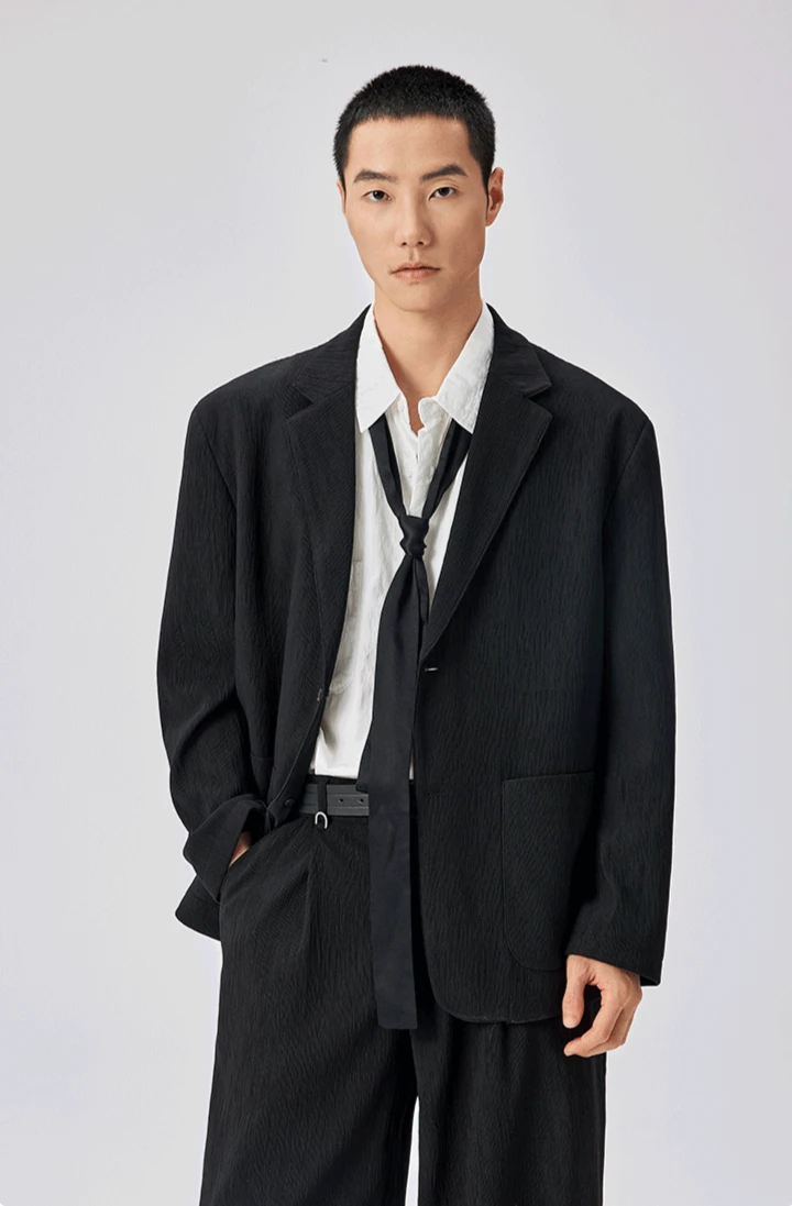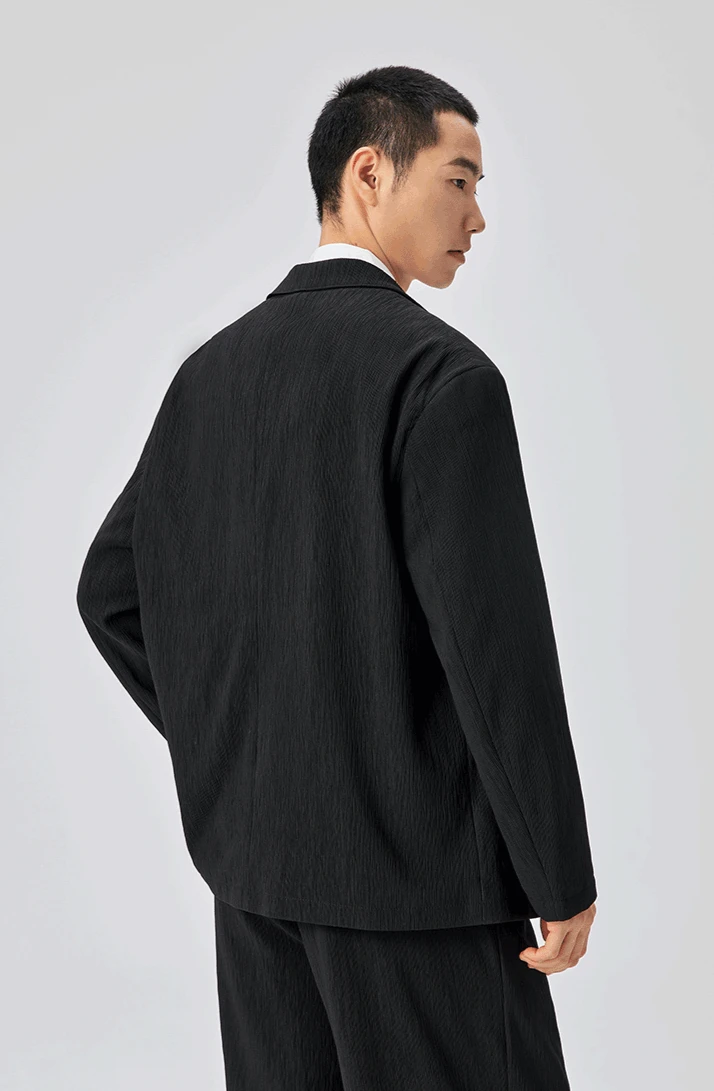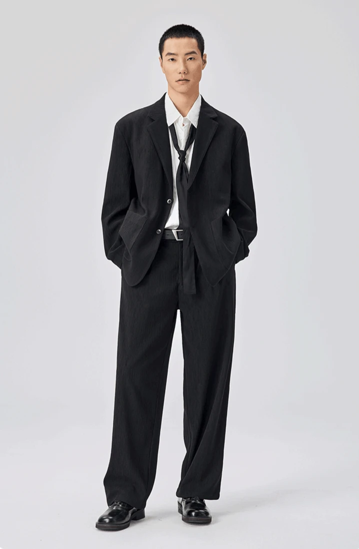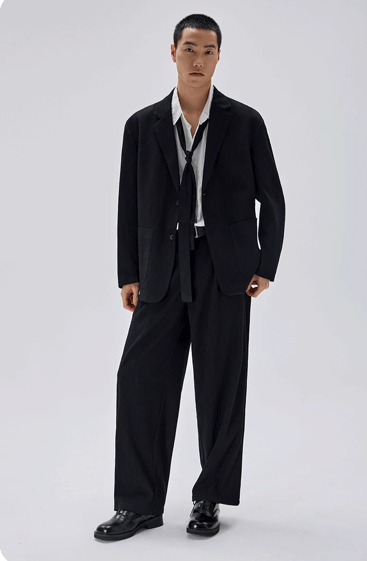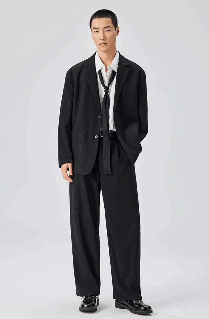 Crafted from a structured yet breathable polyester with a bark-like textured surface, the blazer and wide-leg trousers offer all-day comfort while maintaining form. The clean two-button closure, no-slit back, and spacious tailoring speak to a confident, unfussy sense of style.