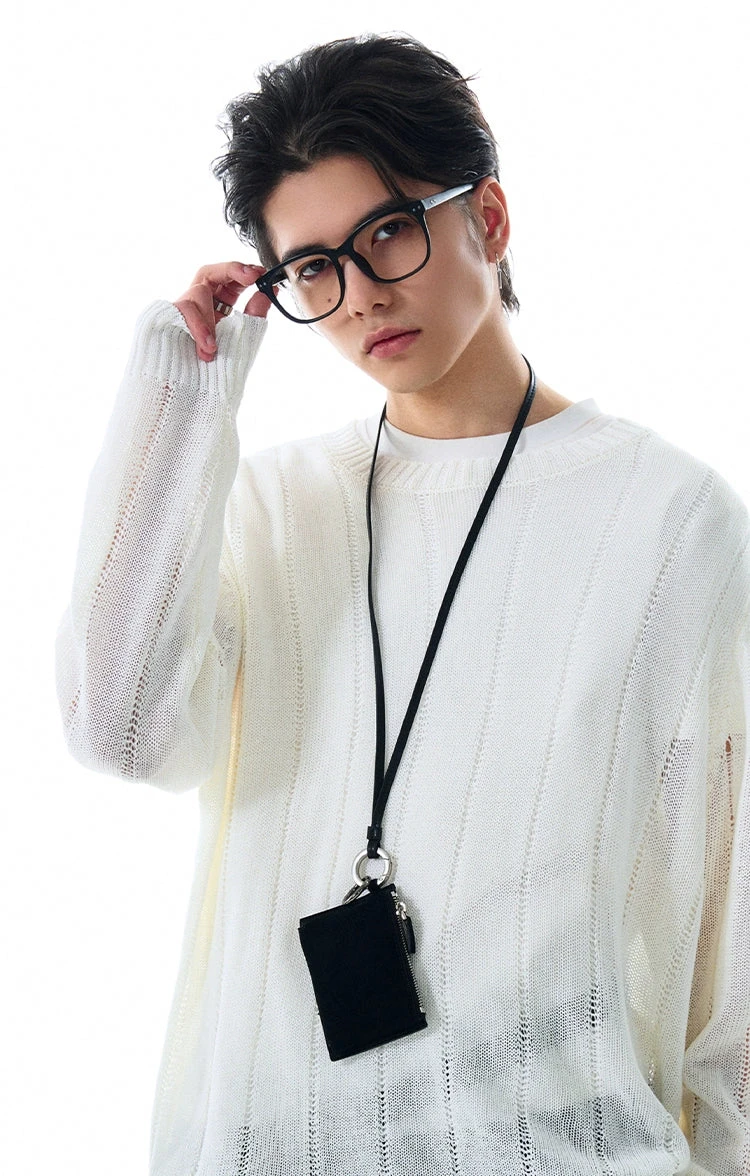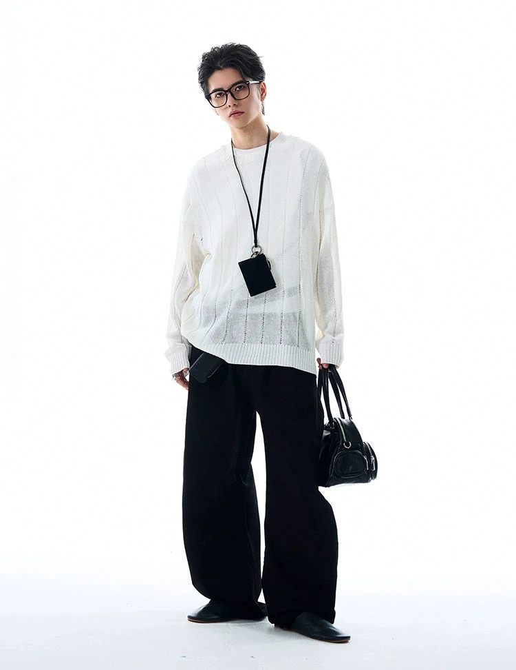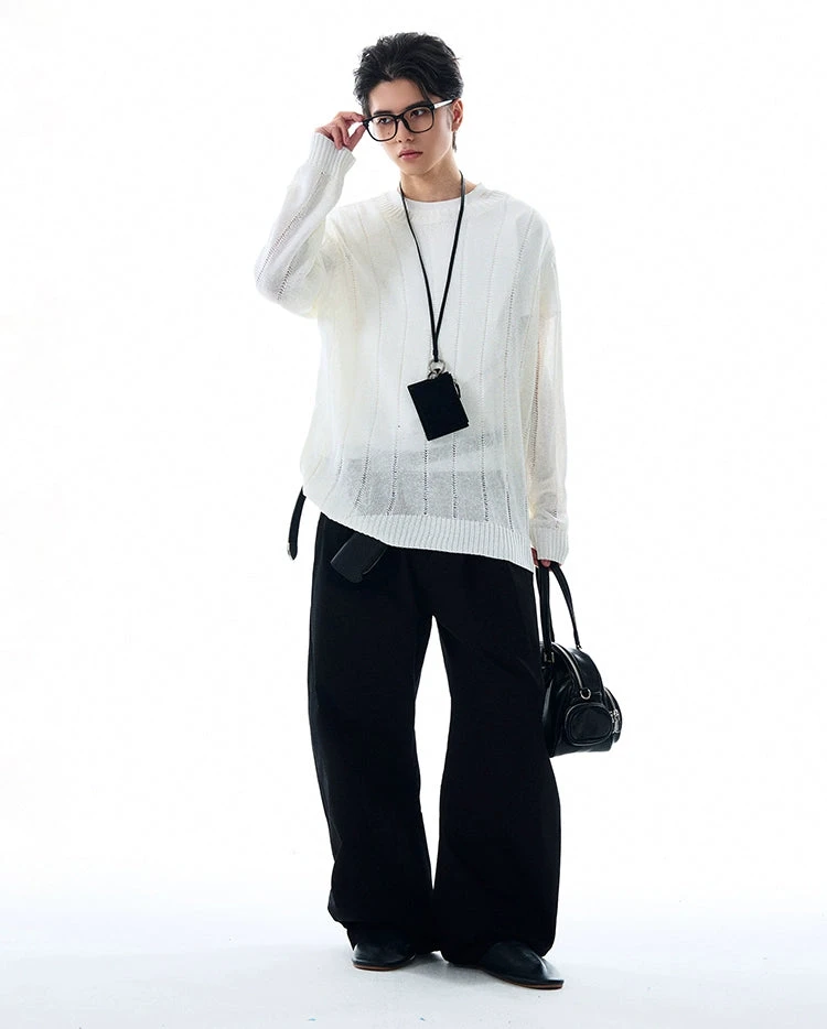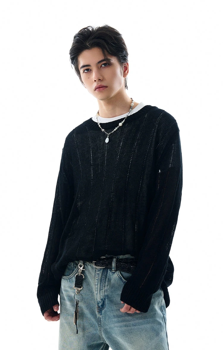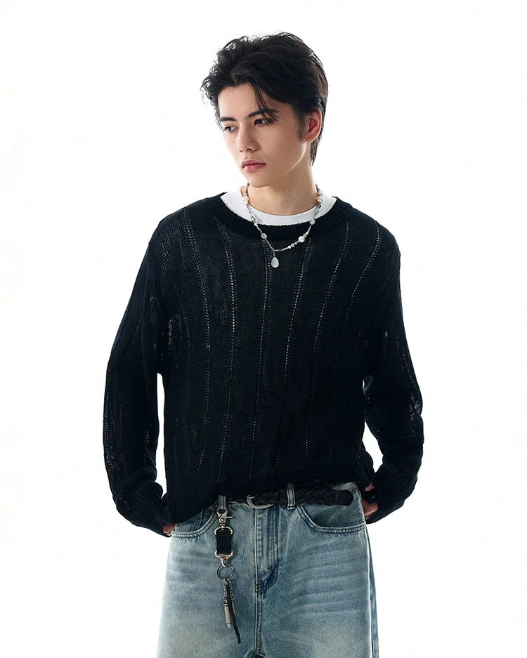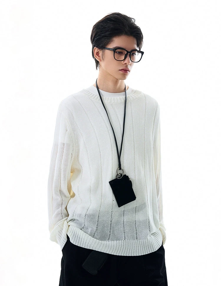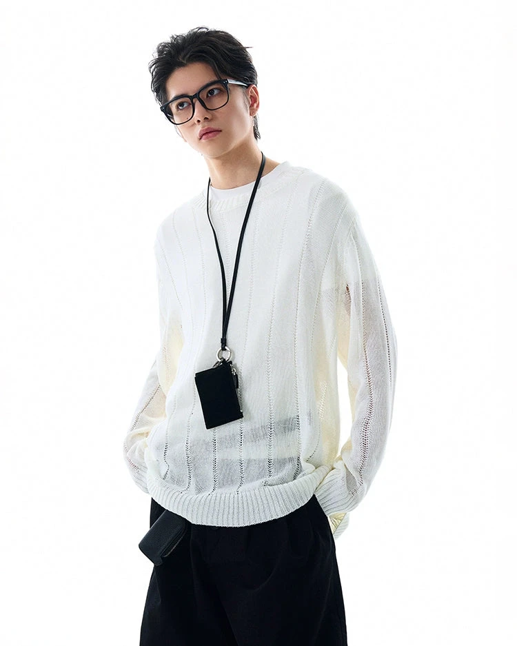 Crafted with an open-knit weave, the fabric is semi-sheer and lightweight, giving it a fluid drape and breathable comfort without sacrificing structure. The vertical textured stitching adds depth and a clean visual line, while ribbed trims at the cuffs and hem provide a finished look and balanced fit.