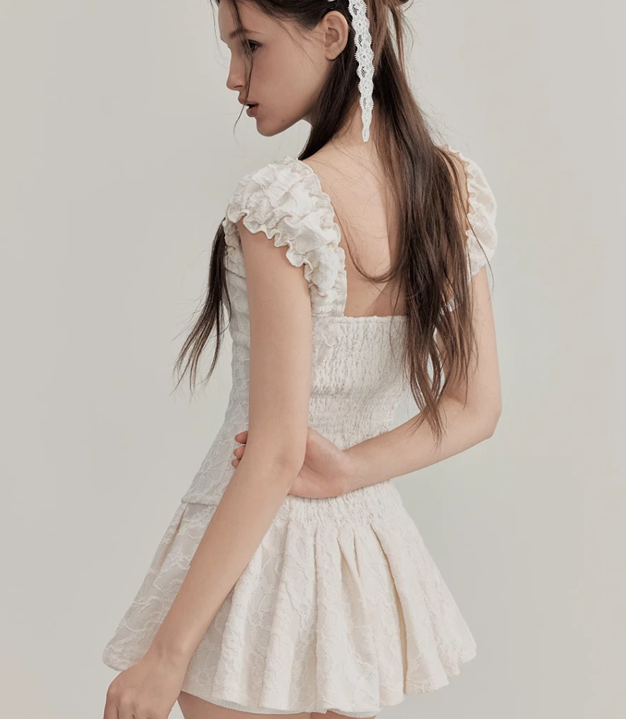 It’s crafted with soft jacquard lace that hugs your shape while still letting you move freely. The one-shoulder neckline and sculpted waist add structure, while the flared pleated hem keeps things playful.