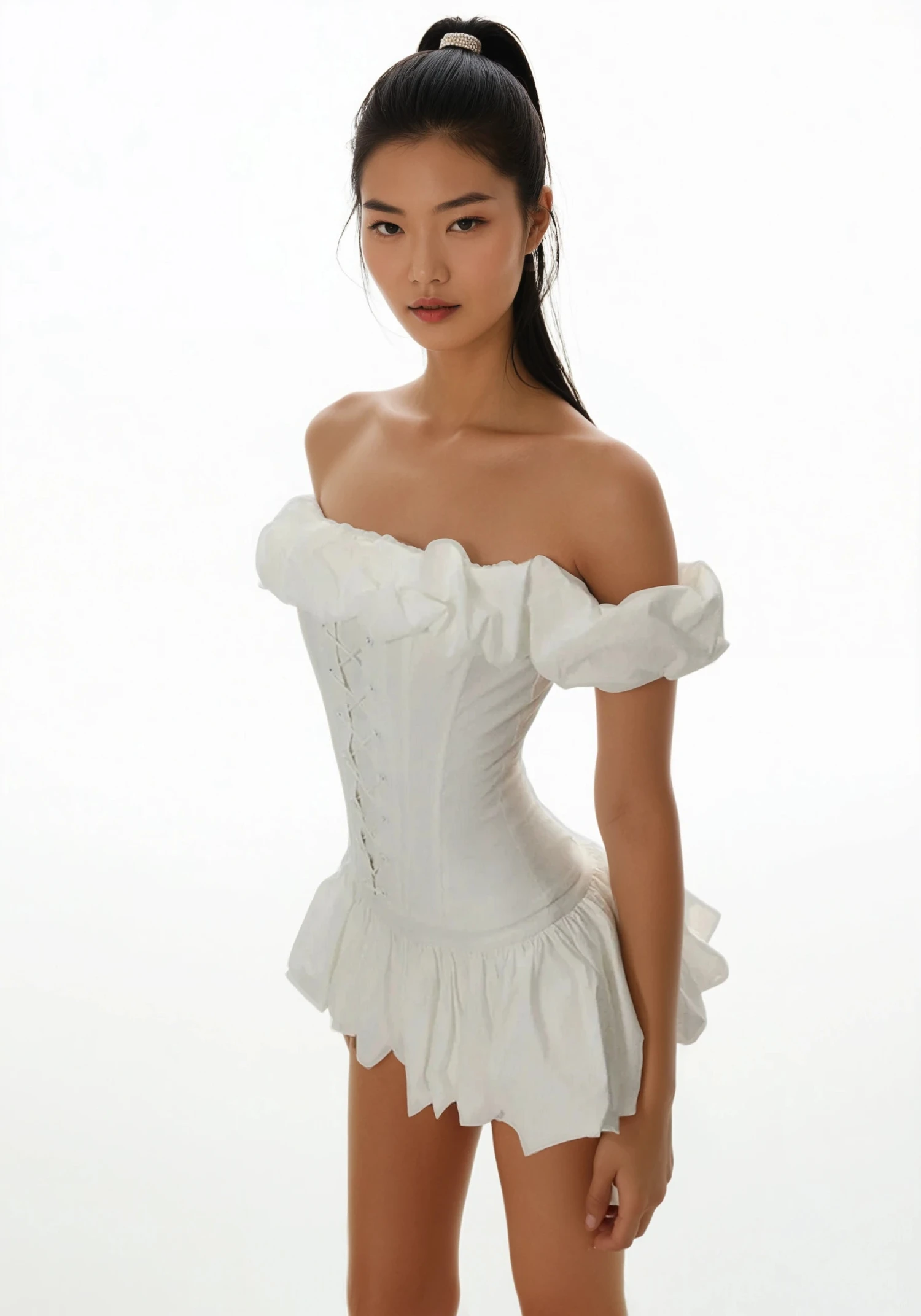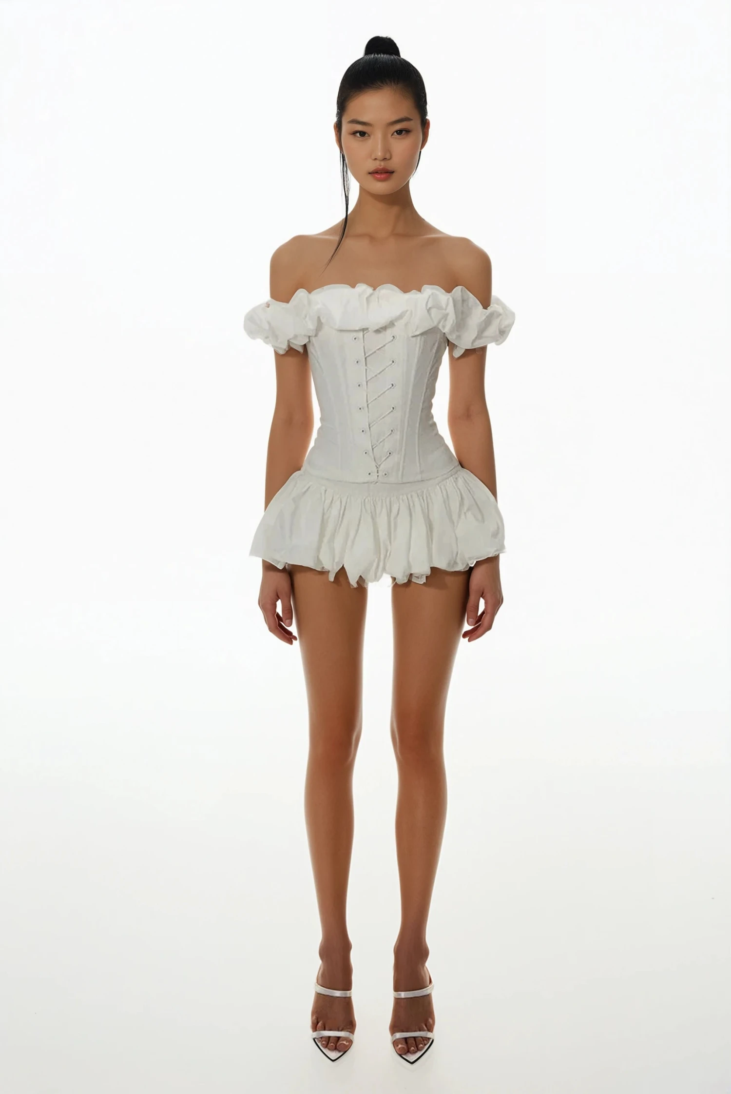 The structured bodice and ultra-short silhouette instantly elevate your look while keeping things playful and confident. Crafted from a soft cotton-nylon blend with just the right amount of stretch, the corset top sculpts with boning details and a lace-up front, while the exaggerated off-shoulder ruffle adds a bold touch.