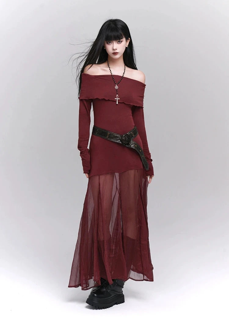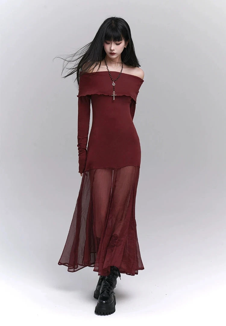 Embrace a touch of drama with our Ruffle Off-Shoulder Sheer Skirt Maxi Dress, perfect for making a statement at any event.