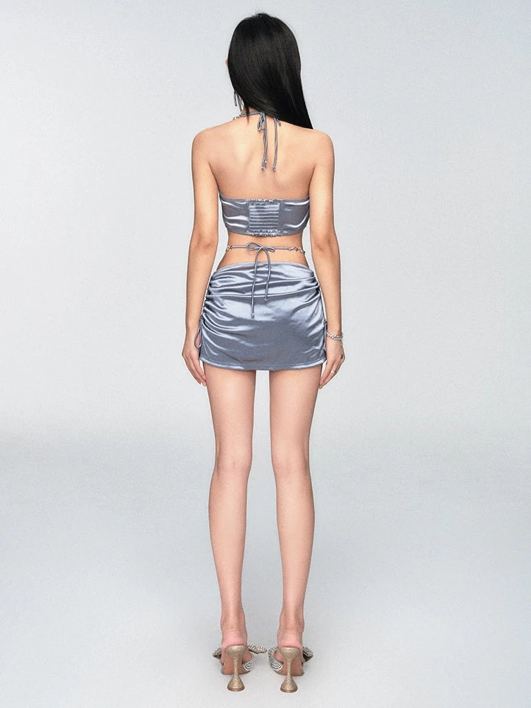 Crafted with a lustrous satin sheen, the halter neck top features a wireless bra with cups for comfortable support, coupled with a coordinating sarong skirt that exudes a sultry yet elegant vibe. The silver color amplifies the set’s trendy and chic look, ensuring you stand out with a touch of glamour whether you’re lounging by the pool or enjoying a sun-kissed day at the beach.
