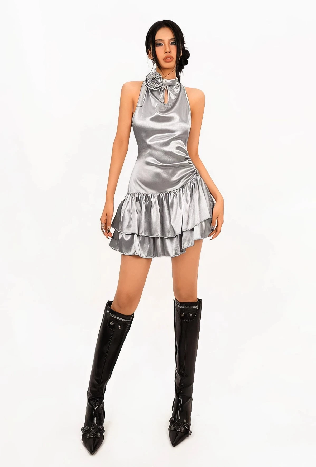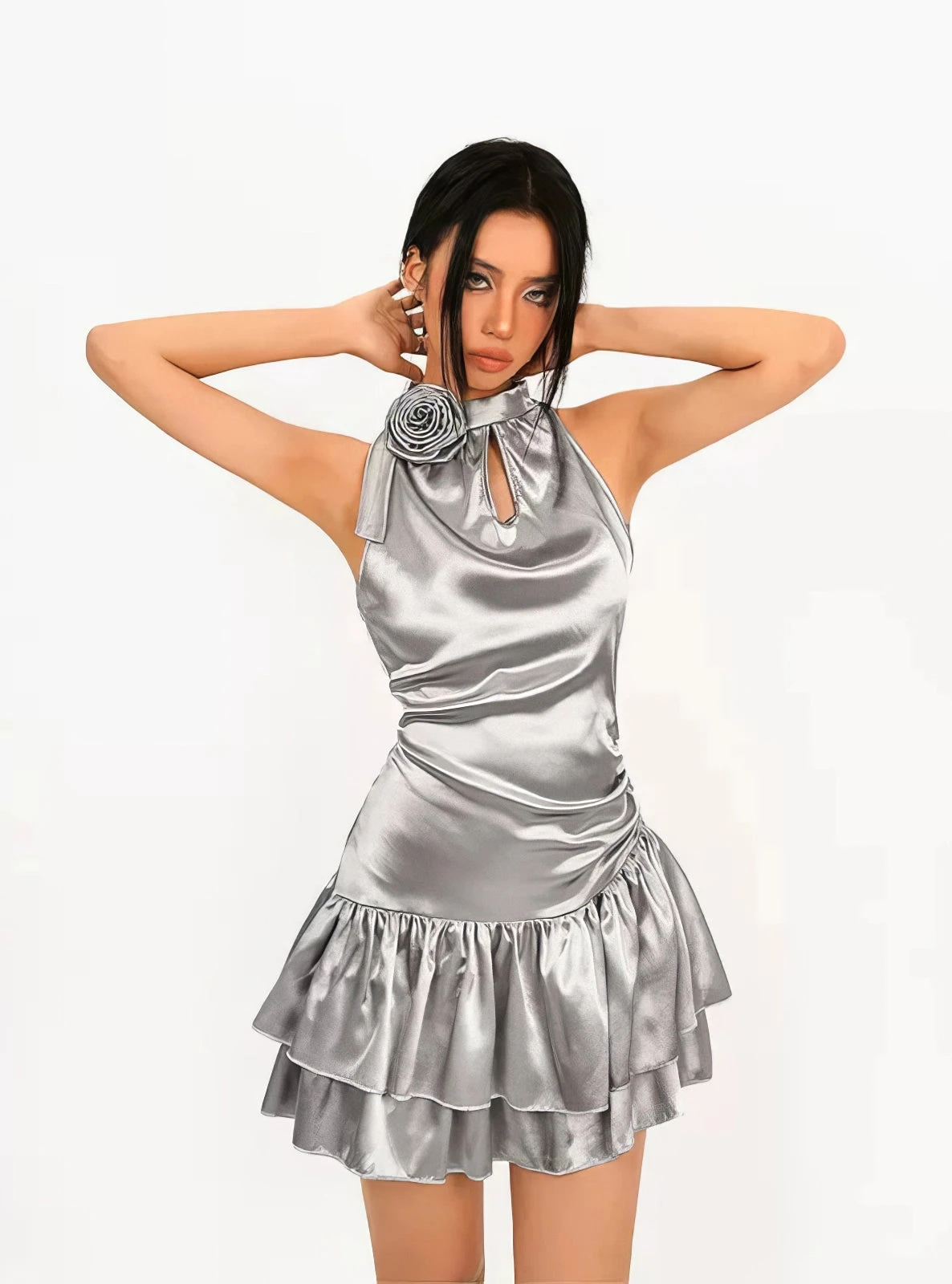 Embrace elegance with a playful twist in this Satin Halter Neck Dress with Rose Detail and Ruffle Hem.