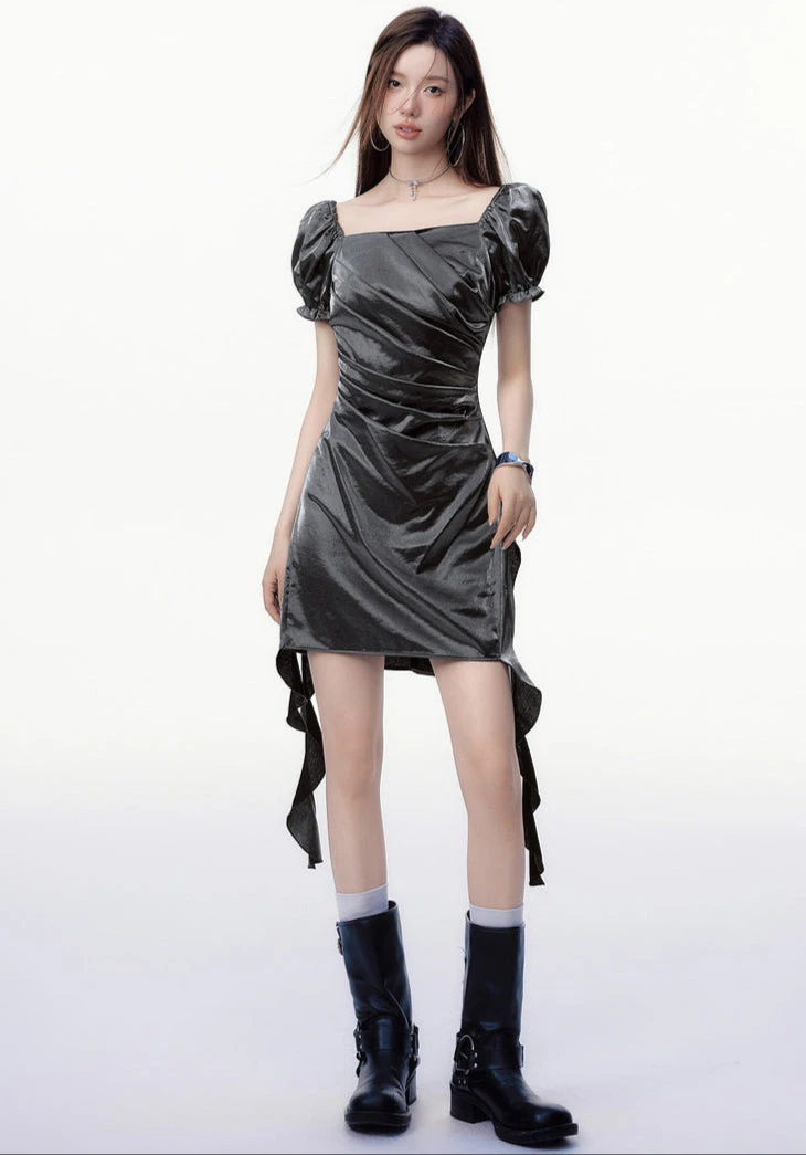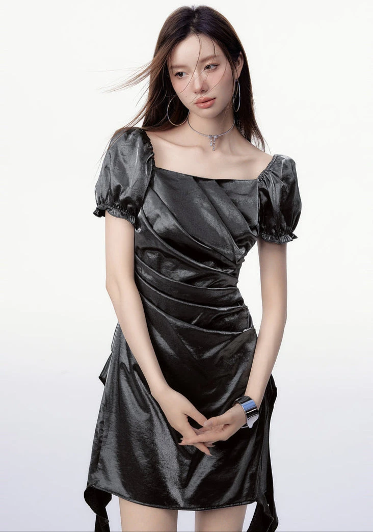 Edgy yet effortless, this satin puff sleeve mini dress plays with contrasts—soft draping meets sharp structure.