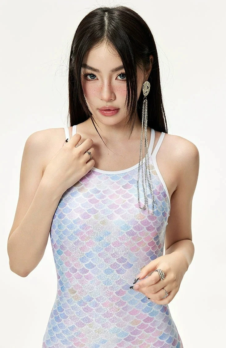 Make a splash with the Scoop Neck Mermaid Scale Print One-Piece Swimsuit, a stunning piece that blends fantasy with beachwear elegance.