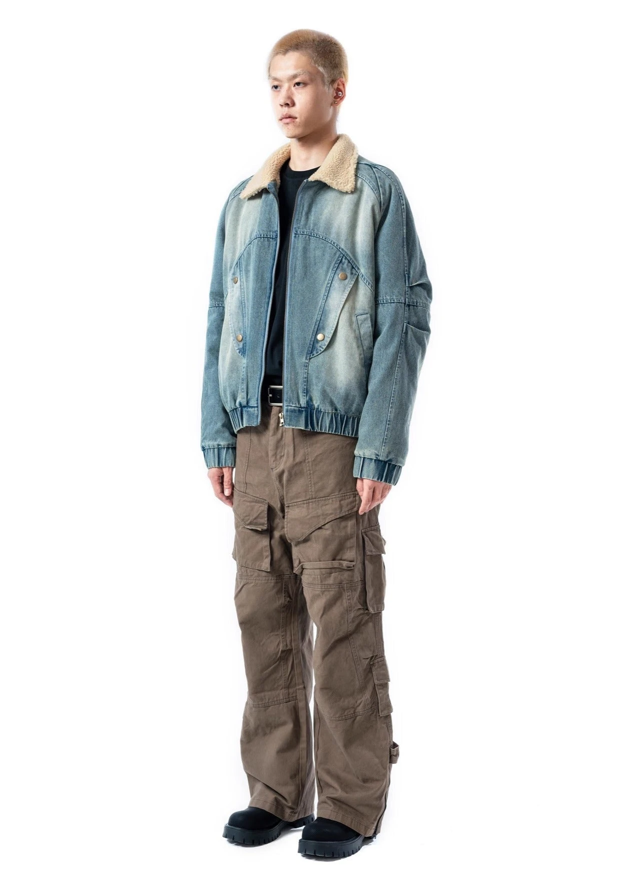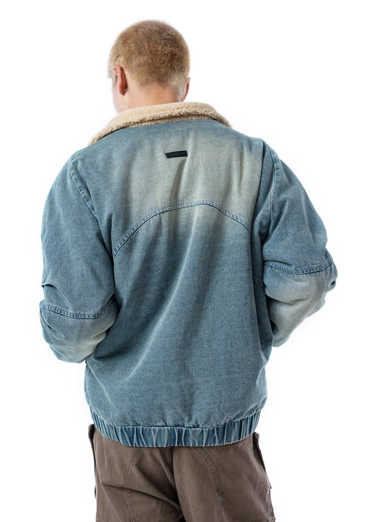 Crafted from heavy-washed denim with a distinct faded effect, it brings a vintage edge while maintaining modern utility. The oversized fit and deconstructed paneling give it a relaxed streetwear appeal, while stud details and a structured shearling collar add a dose of intentional refinement. The plush sherpa lining ensures insulation without bulk, making it a solid choice for layering over hoodies or lightweight knits.