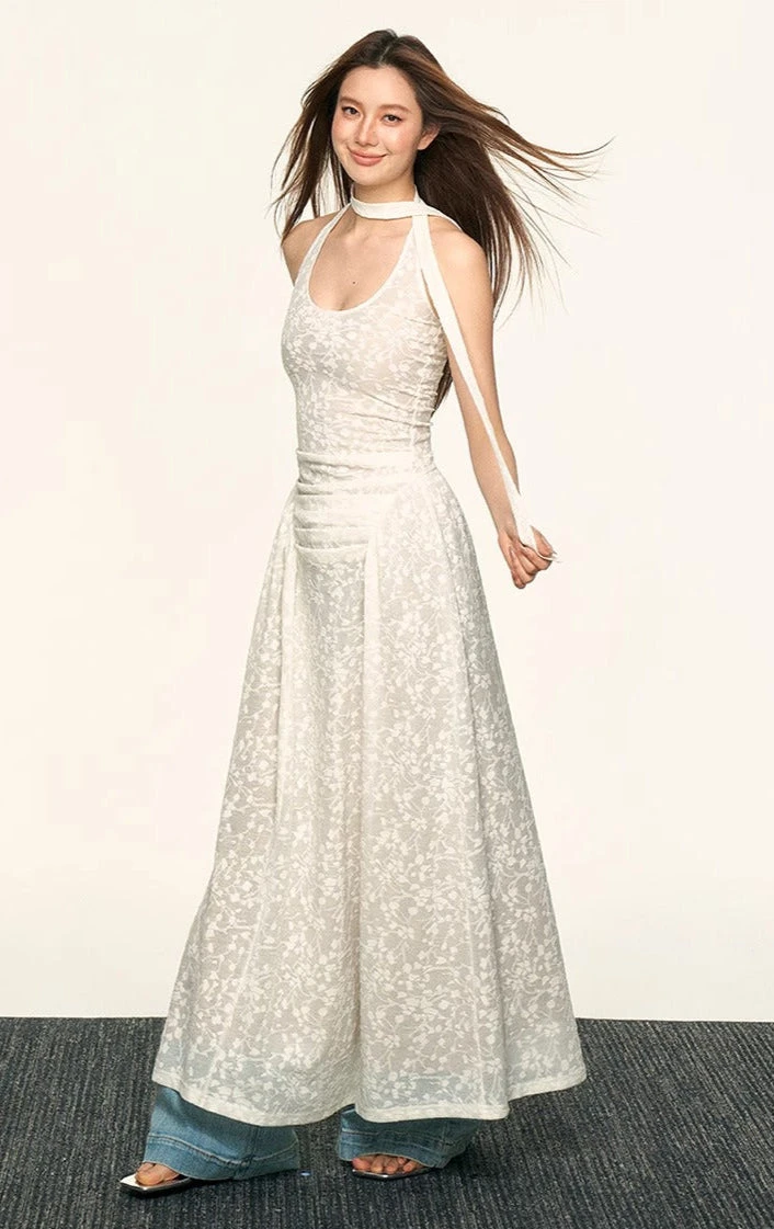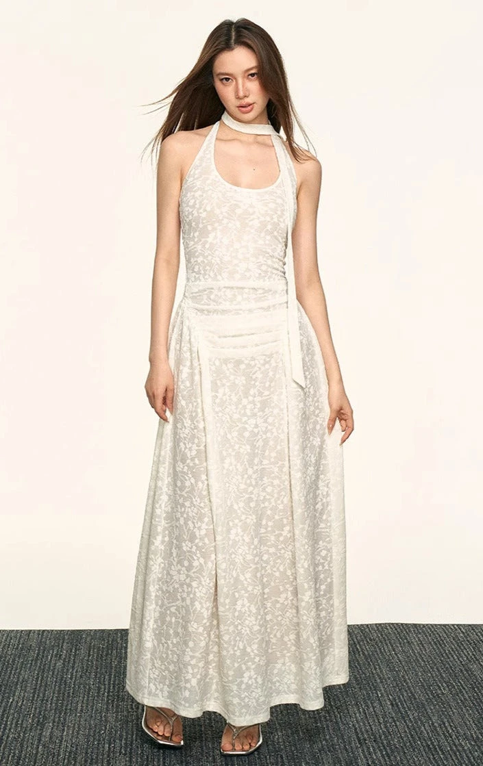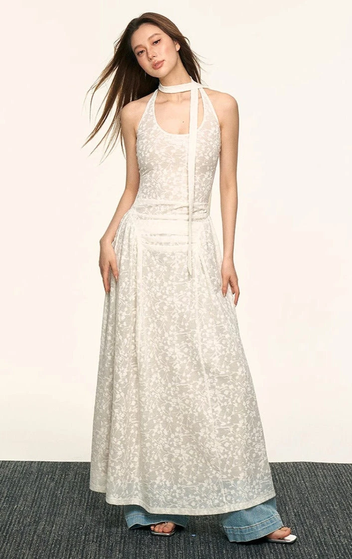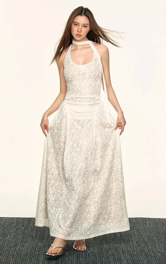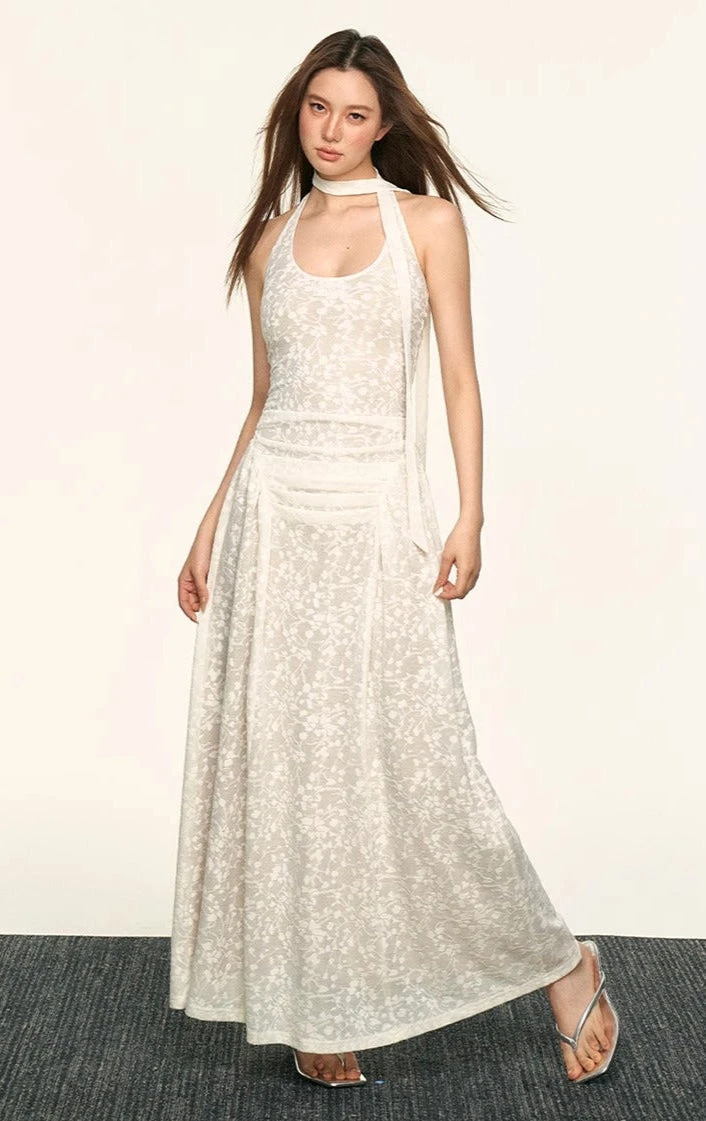 A barely-there feel with subtle drama—this sheer floral halter maxi dress is all about texture, shape, and flow.