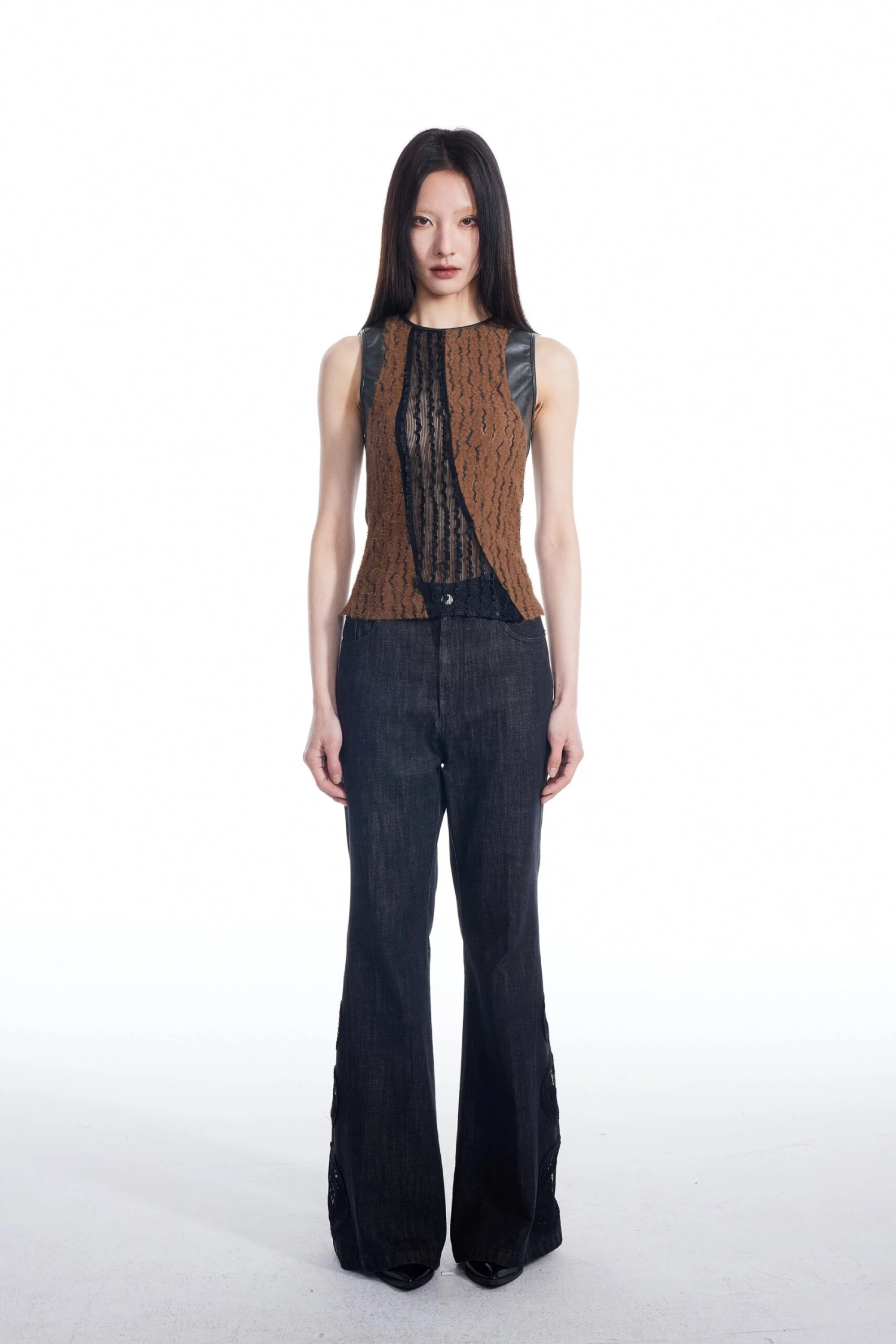 Unleash a bold statement in our Sheer Lace Leather Patchwork Sleeveless Top, where edgy meets elegance.