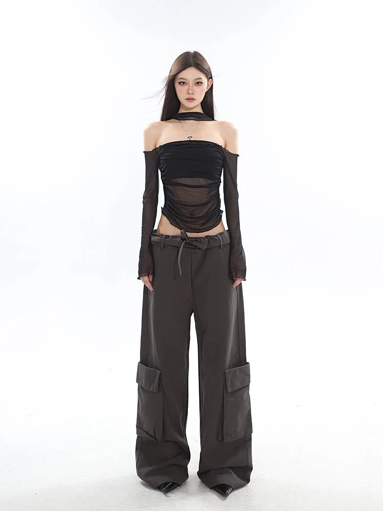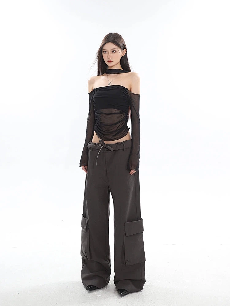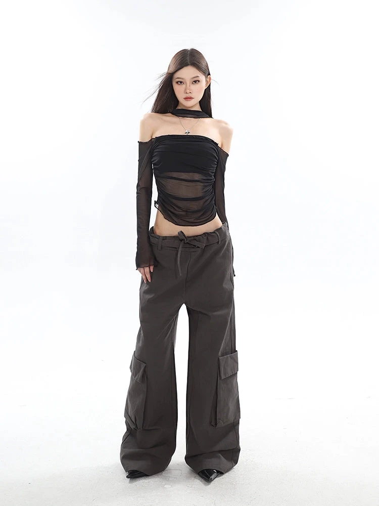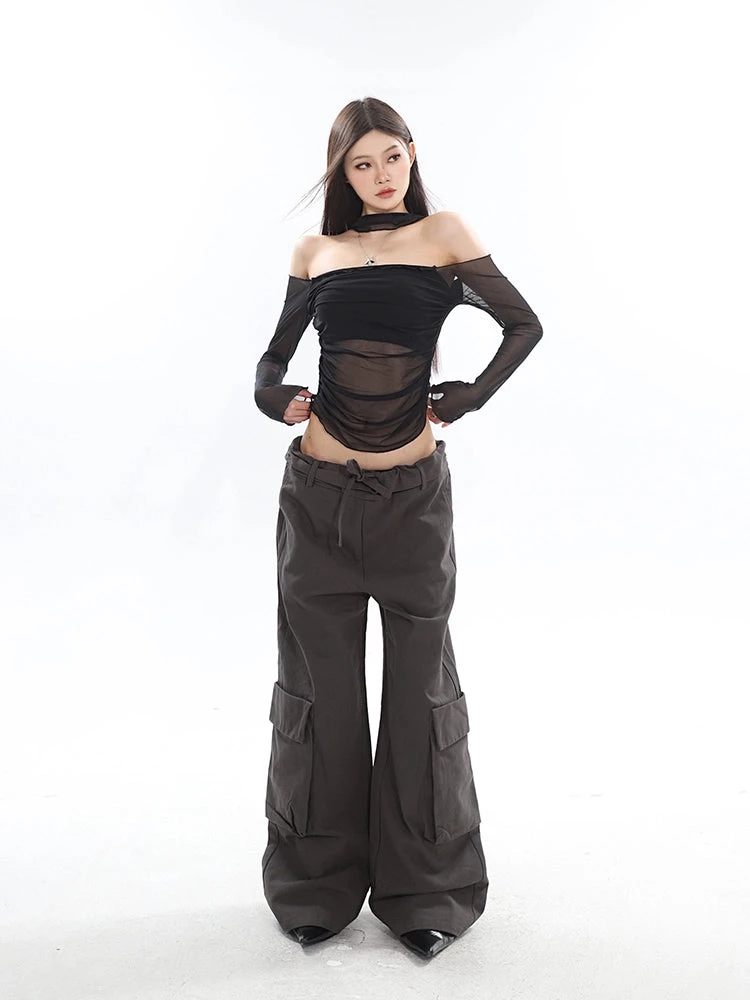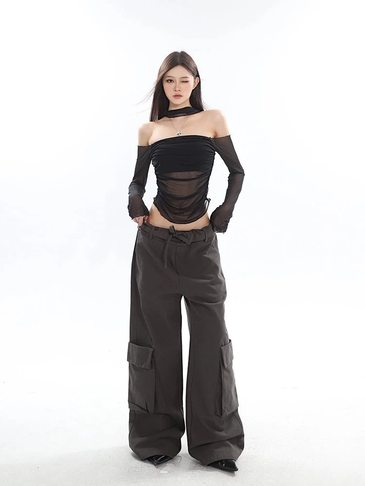 Make a statement with our Sheer Off-Shoulder Long Sleeve Crop Top, a silhouette that combines allure with a touch of drama.