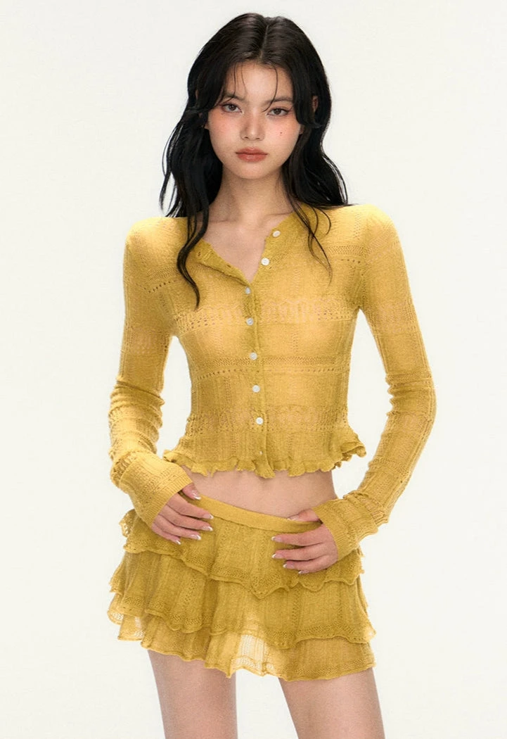 The breathable open-knit design subtly shows skin, offering a soft contrast between playful and refined. Crafted from a lightweight blend with a touch of wool, the fabric feels soft while holding its shape. The cardigan top features a flattering cropped cut, delicate button closure, and scalloped hem, while the layered mini skirt adds volume without bulk.