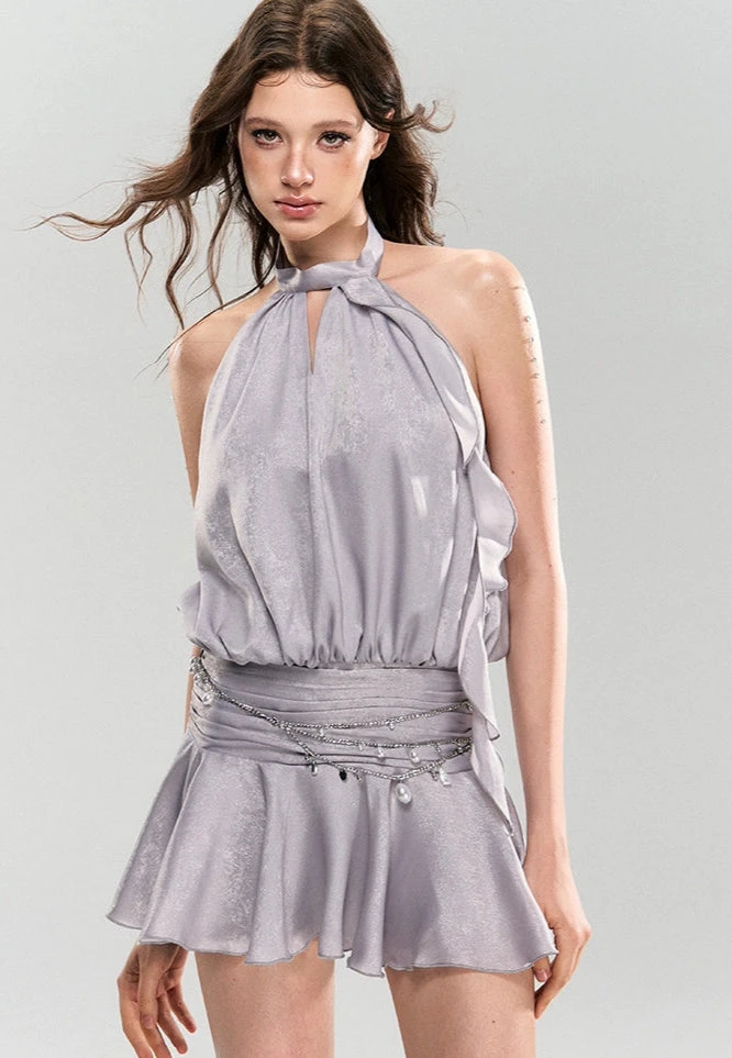 A modern statement piece with a touch of shimmer, this halter neck mini dress features a ruffled flared hem and a fluid satin finish that catches the light effortlessly.