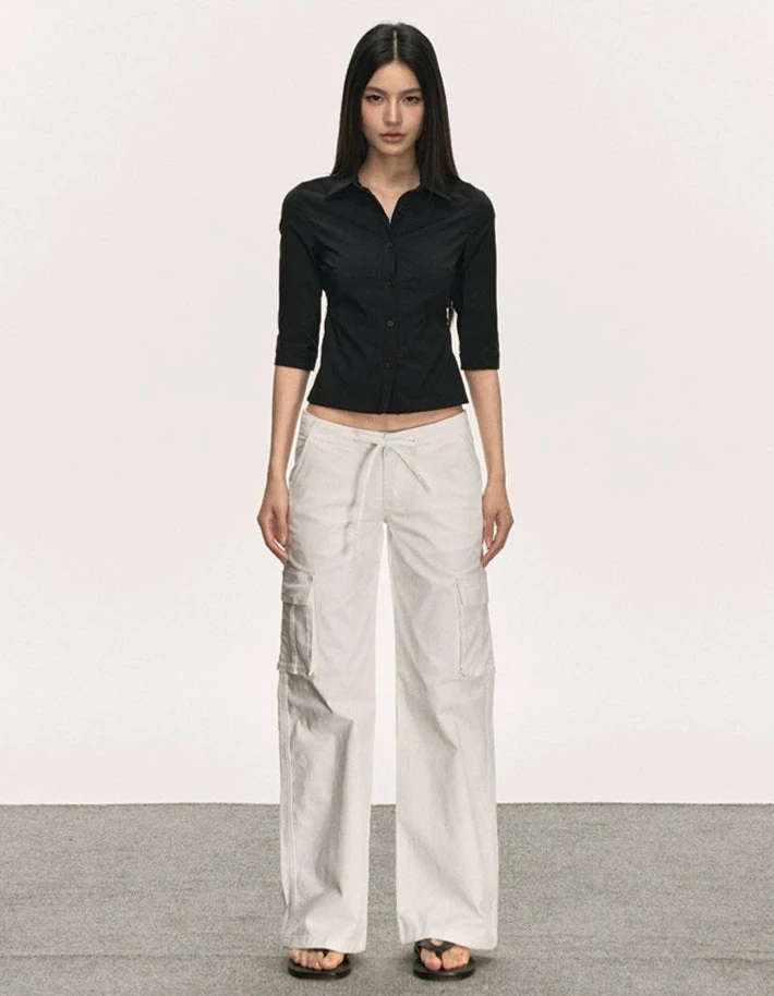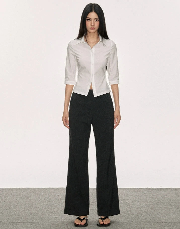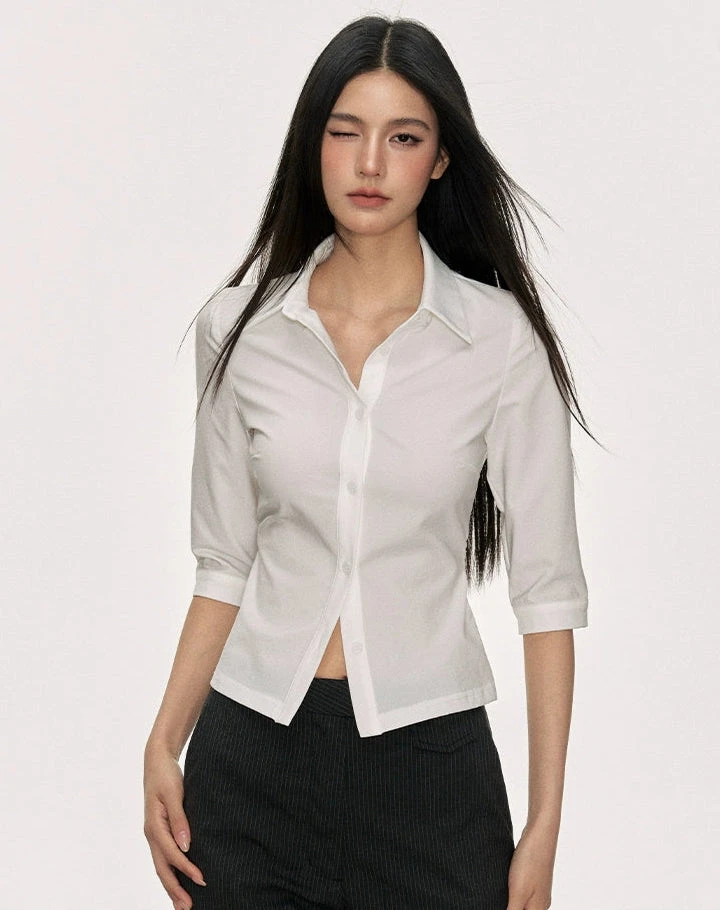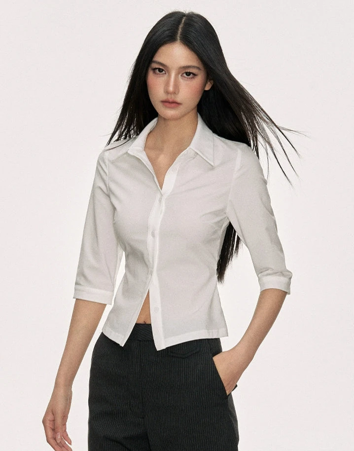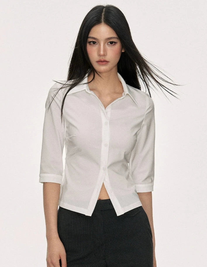 Made from a breathable woven blend with subtle stretch, it’s cut to follow the lines of the body without clinging. The minimalist, solid color design and pointed collar detail create a refined silhouette, while the button closure keeps it classic and easy to wear. Whether layered under a blazer, tucked into tailored pants, or worn loose with wide-leg trousers, it’s built to adapt to whatever mood you’re in that day.