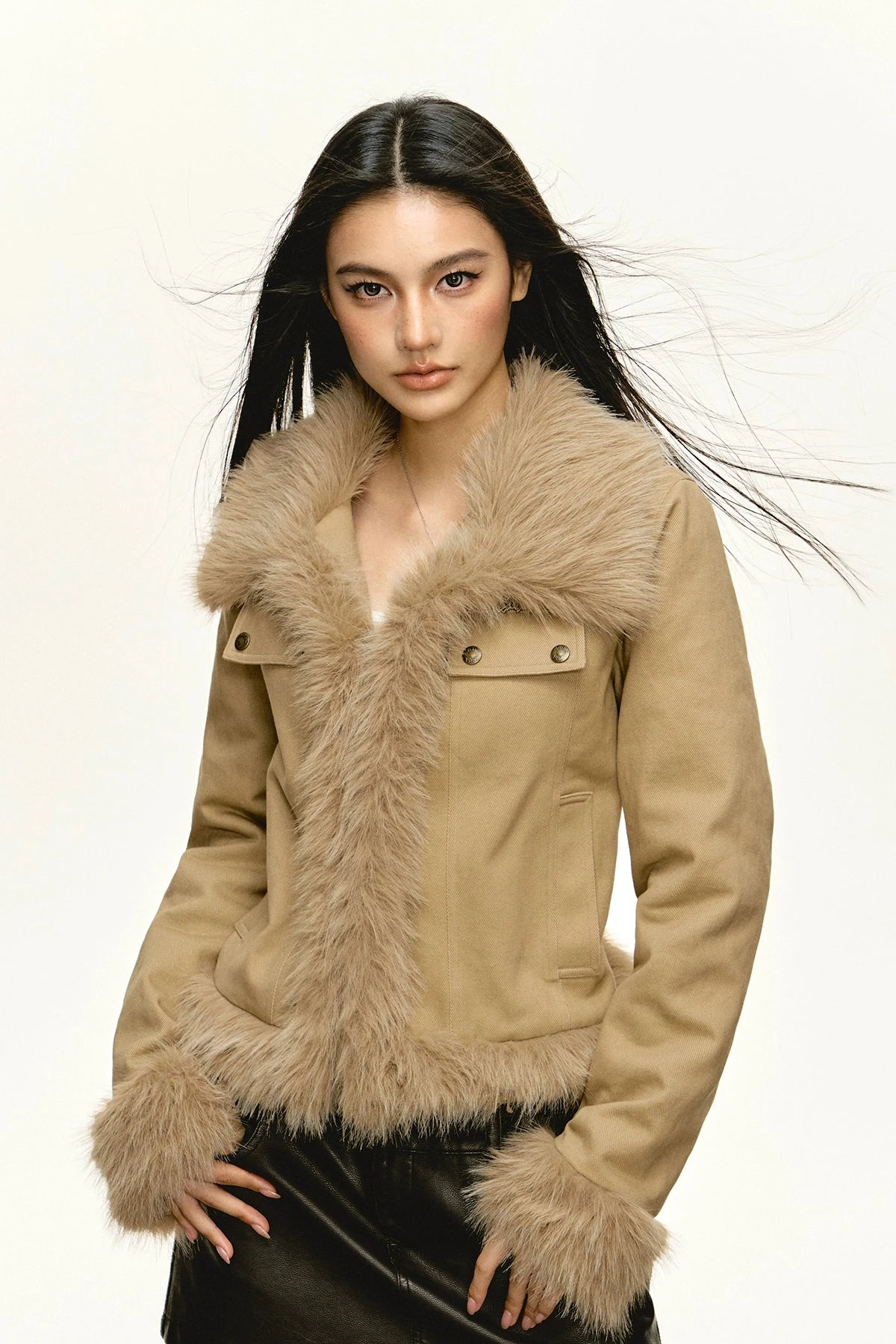 Made from 100% cotton, this jacket fuses comfort with a dash of elegance, thanks to its plush faux fur trim. Its conventional long sleeves and straight type cut demonstrate a dedication to timeless style, while its solid color and subtle detailing offer a nod to contemporary aesthetics. Outfitted with a lapel collar and zip closure, it embodies a fusion of casual sophistication.