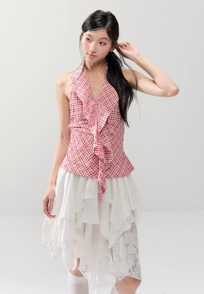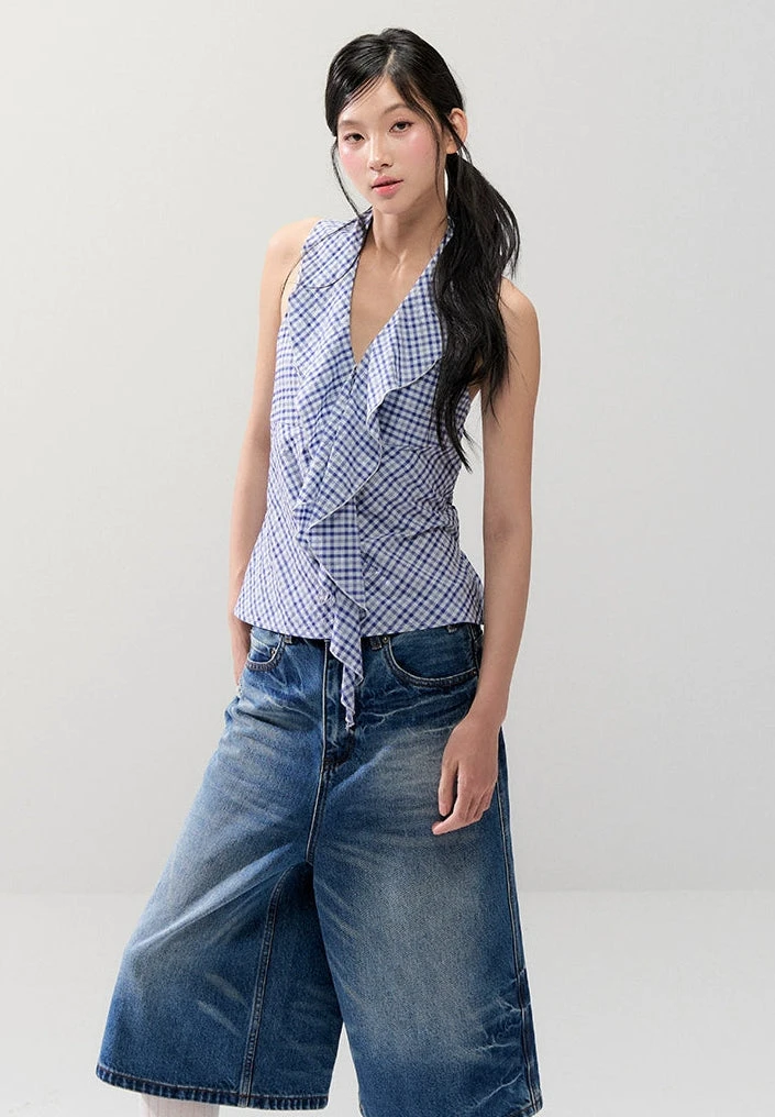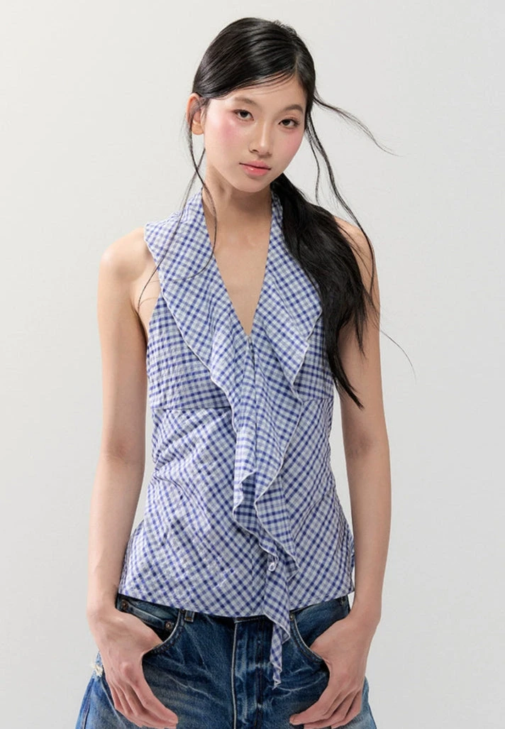 This halter top makes an impact with its ruffled V-neckline and timeless checker pattern, blending structure and softness in a way that feels both laid-back and intentional.