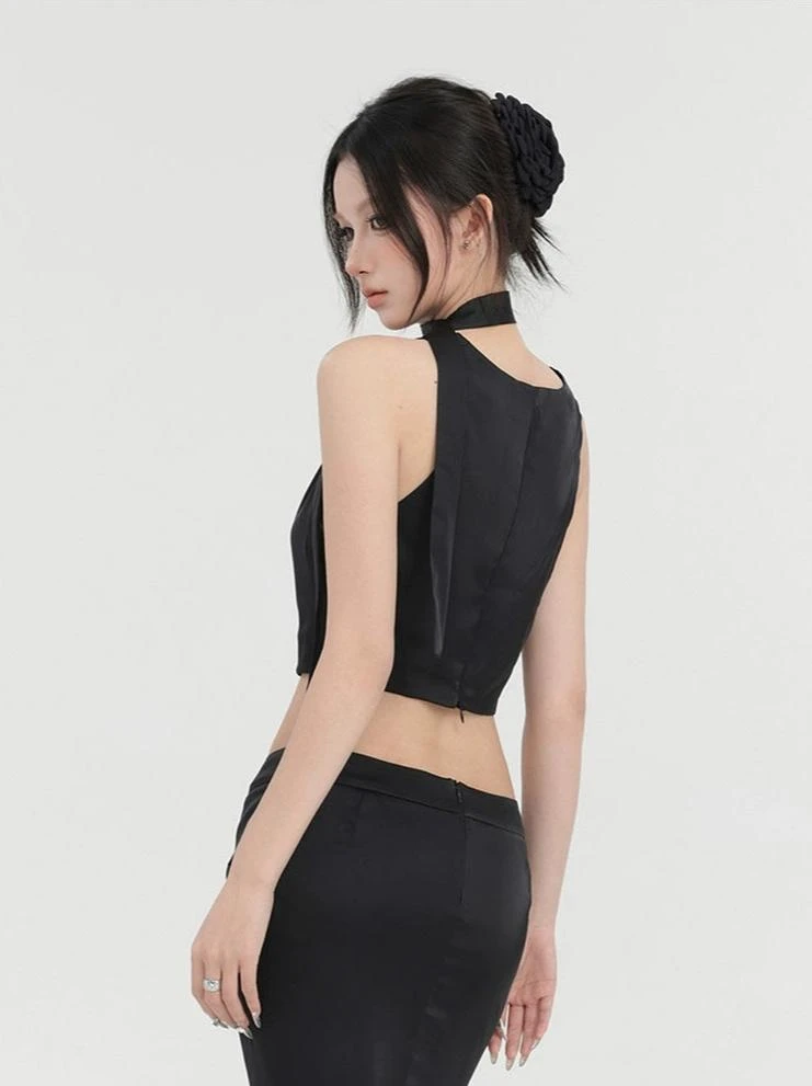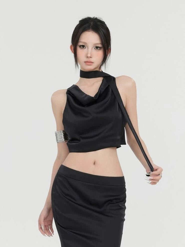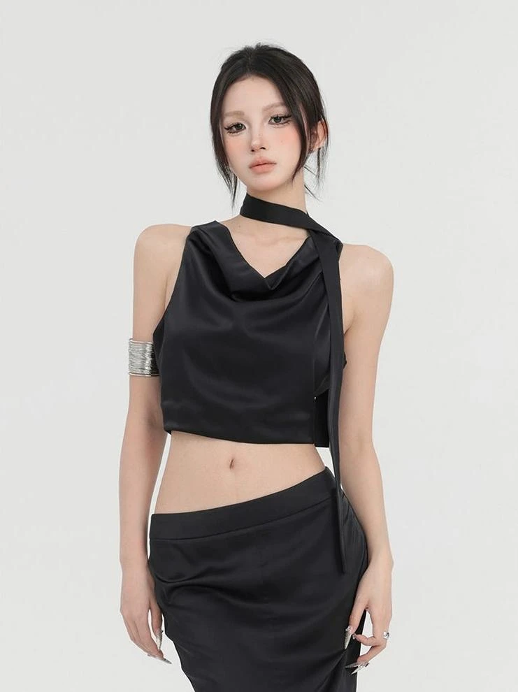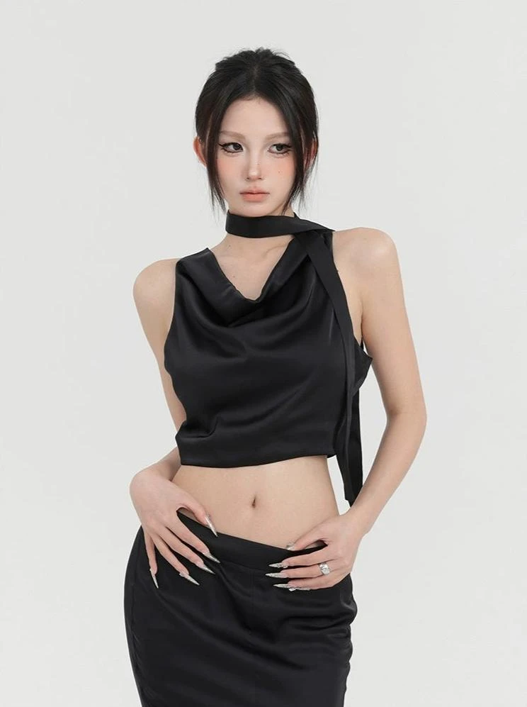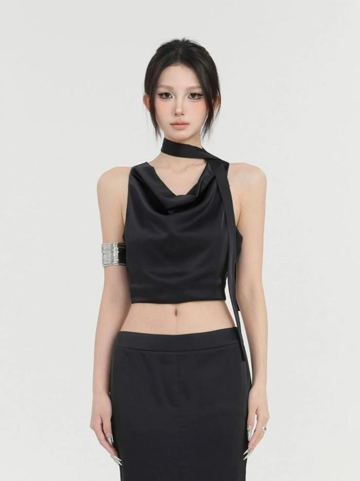 Embrace the bold edge with our Sleeveless Cowl Neck Short Top with Scarf – a top designed to make a statement.
