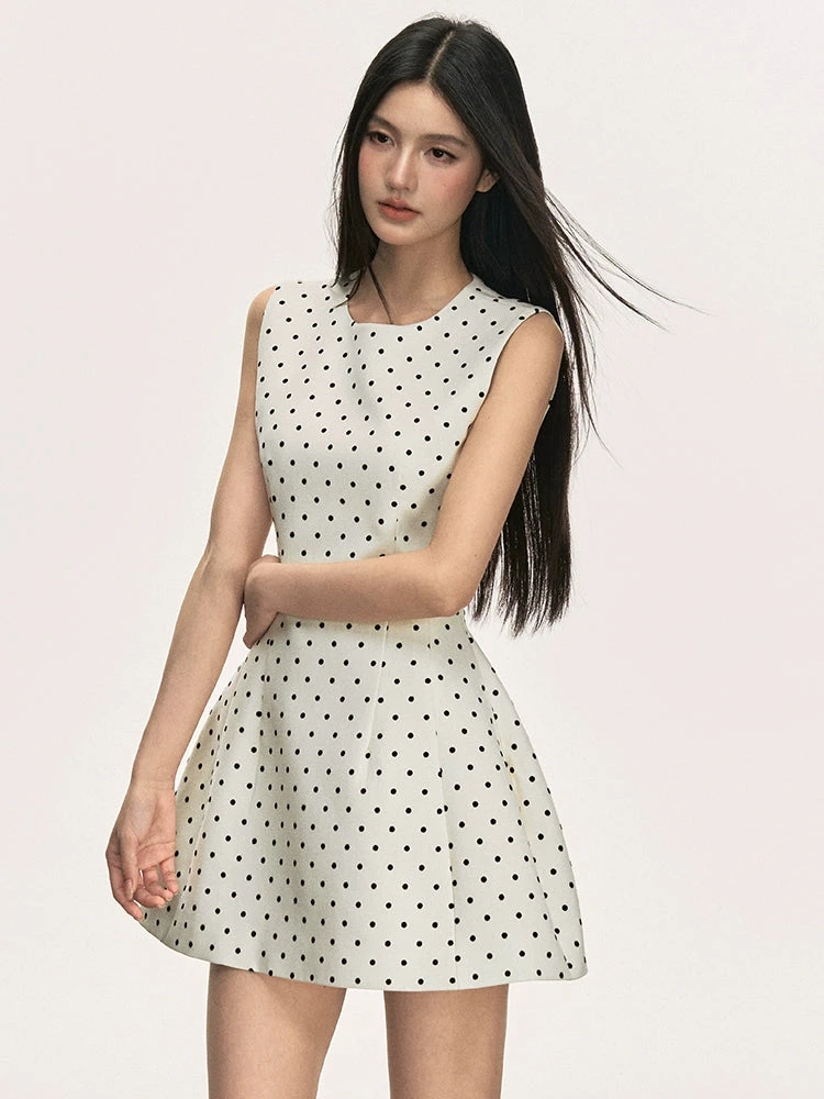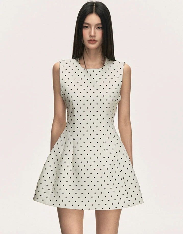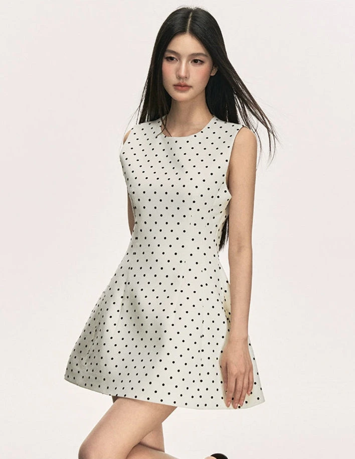 There’s something effortless about the Sleeveless Polka Dot Mini Dress—a clean silhouette that still makes a statement with subtle charm.