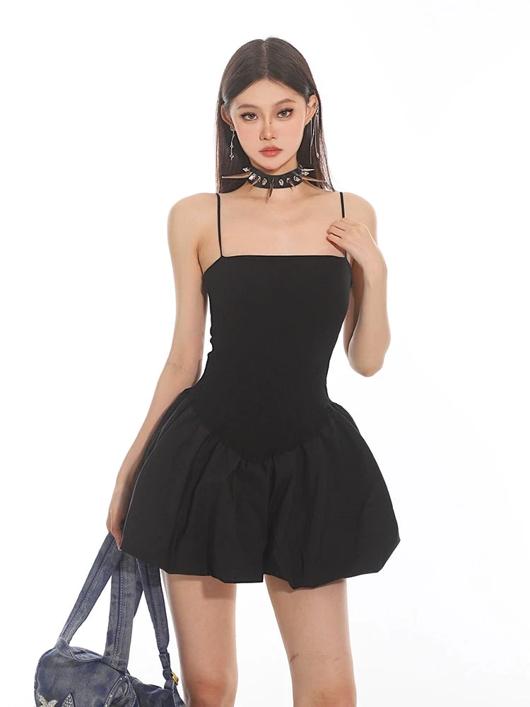 Crafted with a soft material that gently hugs your figure, the dress boasts a flattering fitted bodice that transitions into a voluminous bubble skirt, adding a touch of whimsy to your wardrobe. The minimalistic yet edgy design complements its functionality, making it a seamless addition for those who covet a balance of style and comfort.