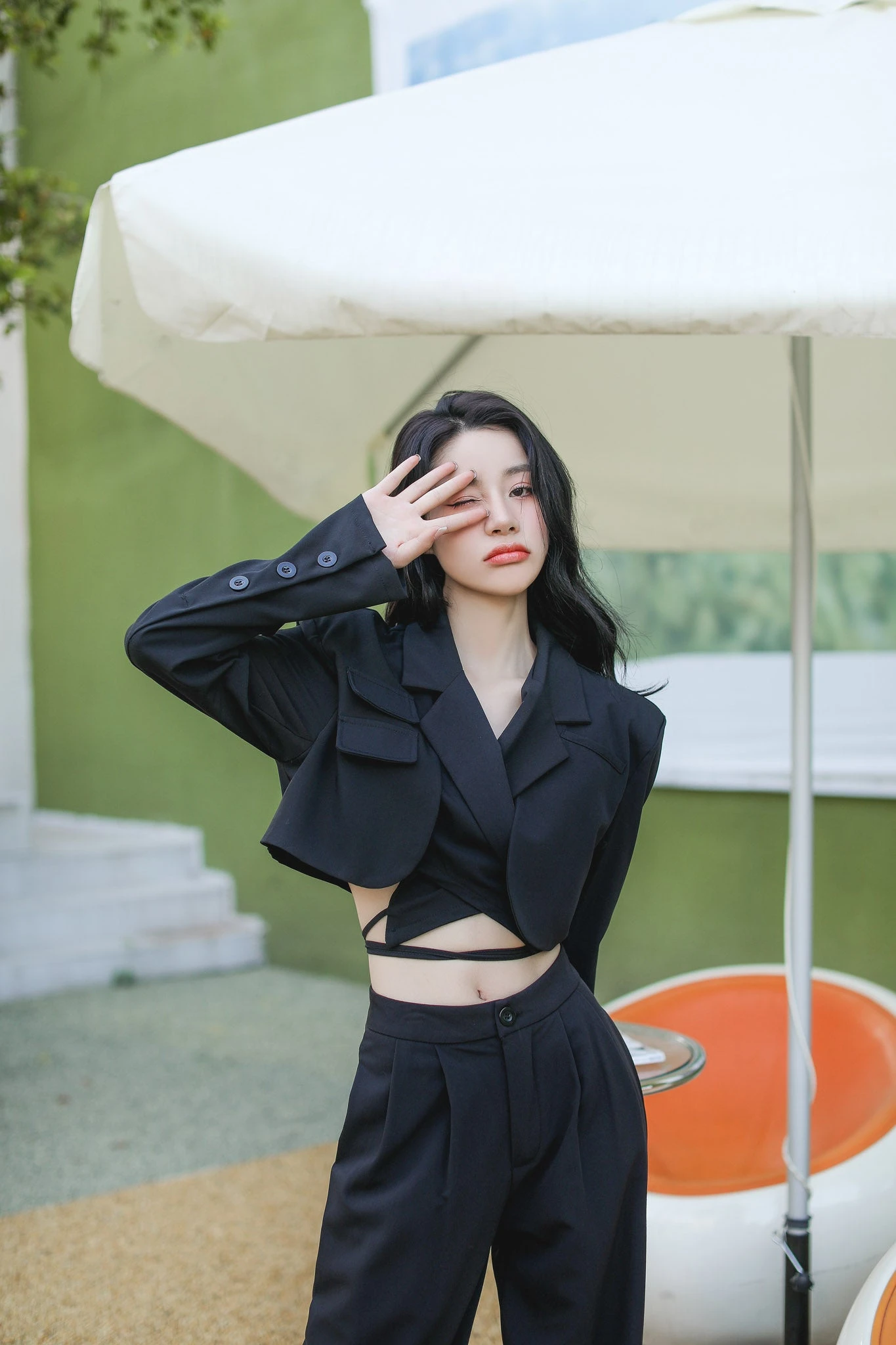 Slim, stylish cropped blazer with a mock-lapel shirt and wide-leg pleated pants, available as a two-piece, which can also be worn separately to dress up a casual outfit for an added sophisticated flair.