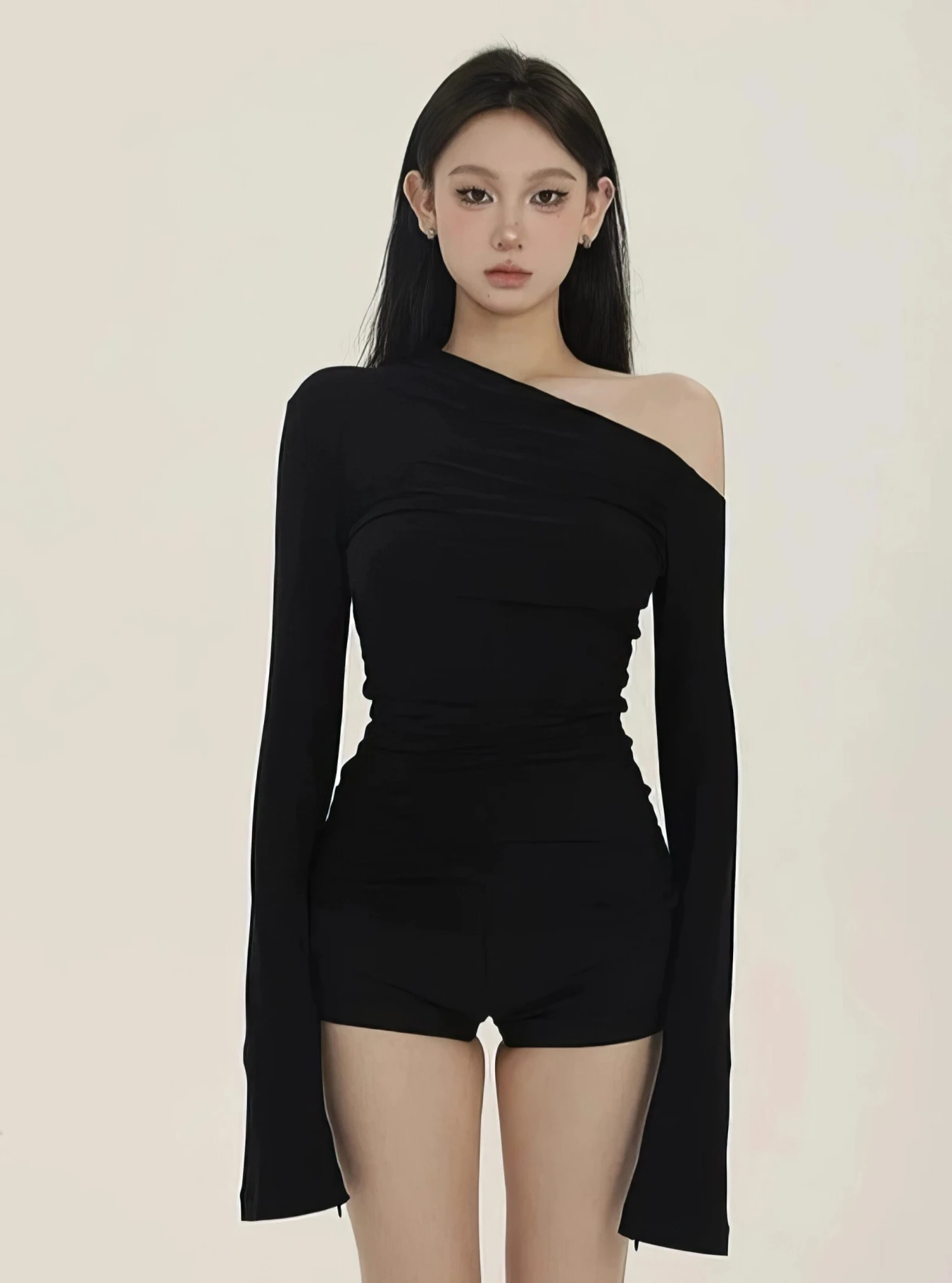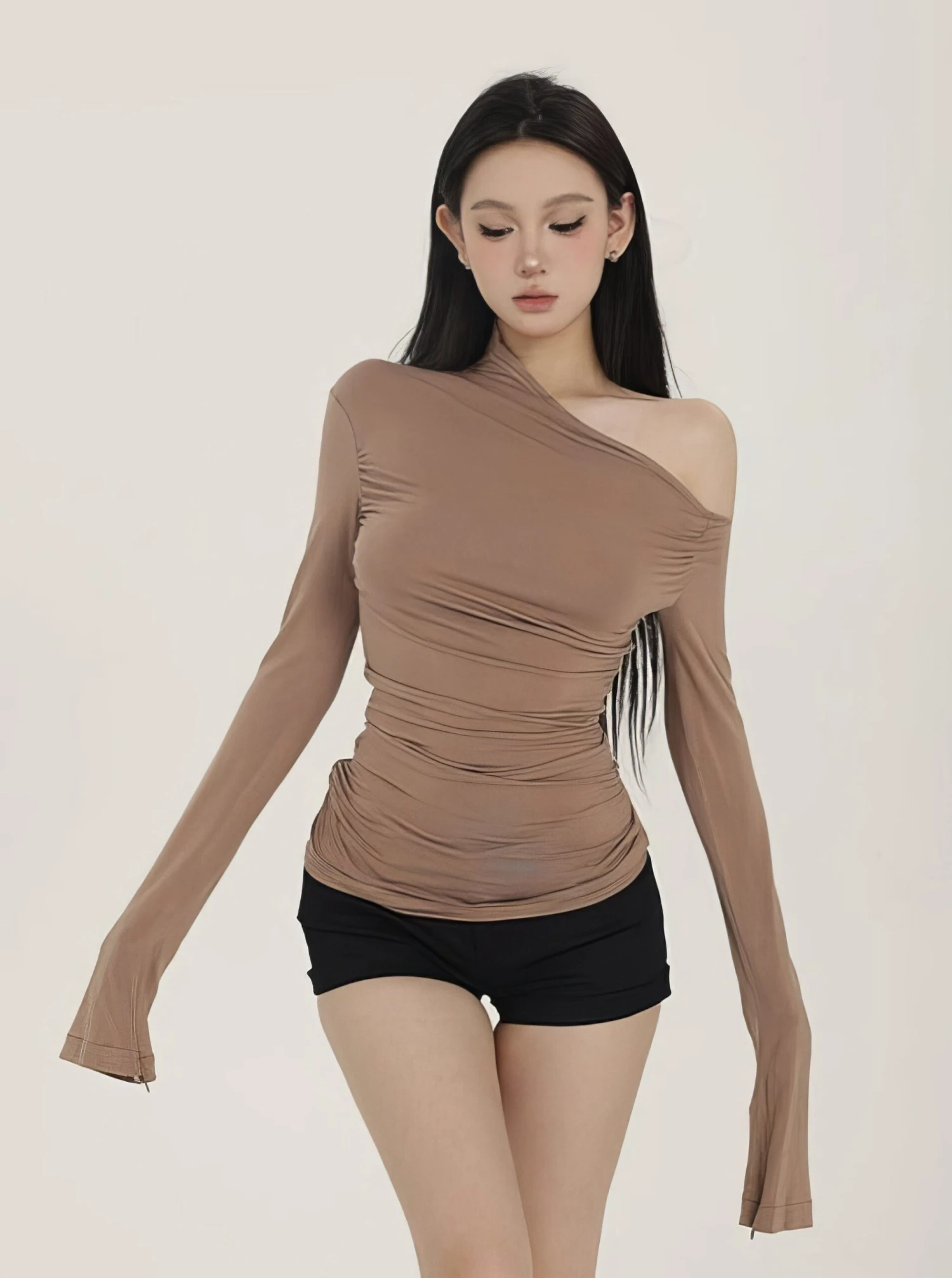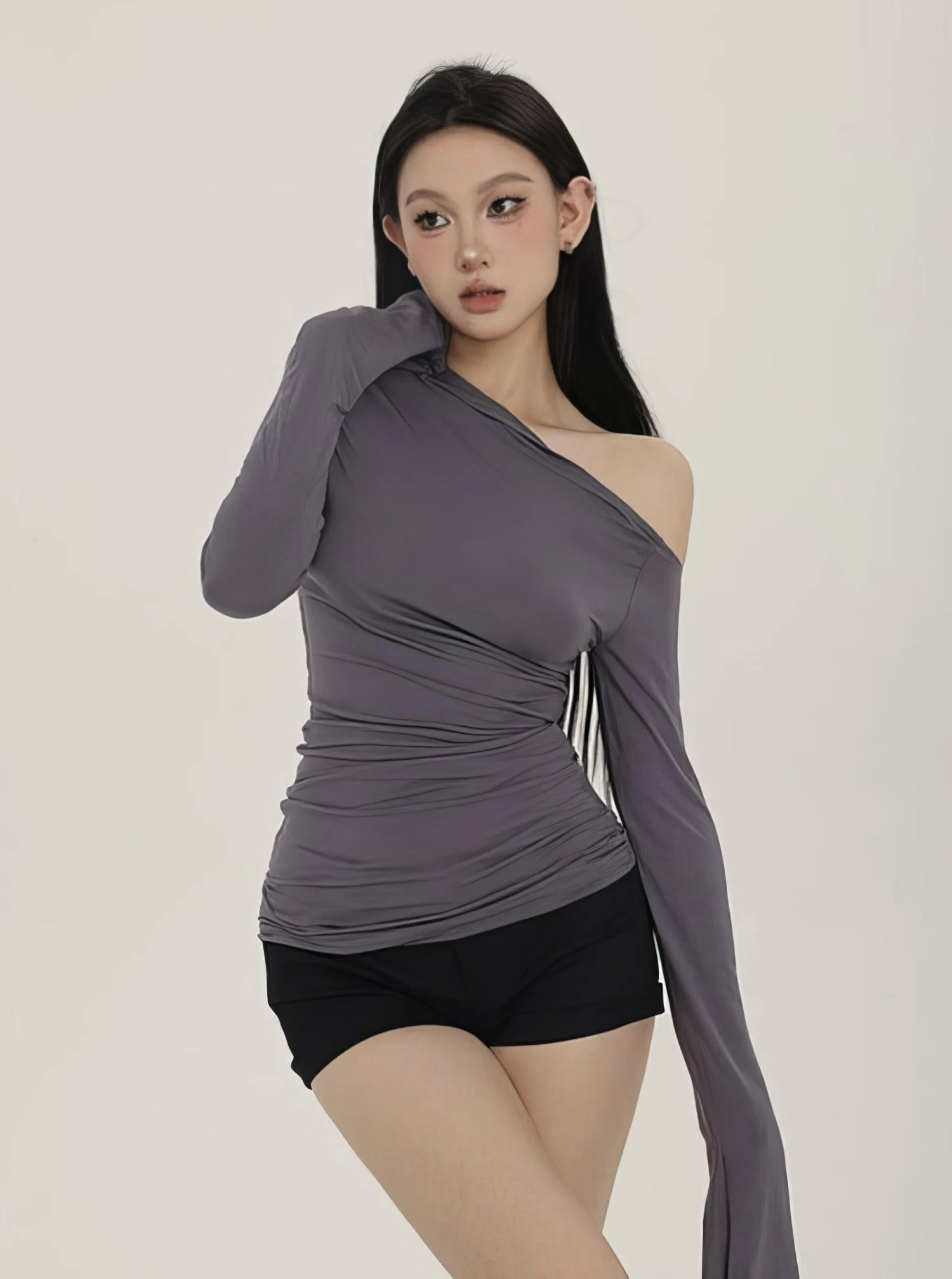 Crafted for the contemporary silhouette, the Slim One-Shoulder Ruched Long Sleeve Top offers a blend of sophistication and asymmetrical allure.