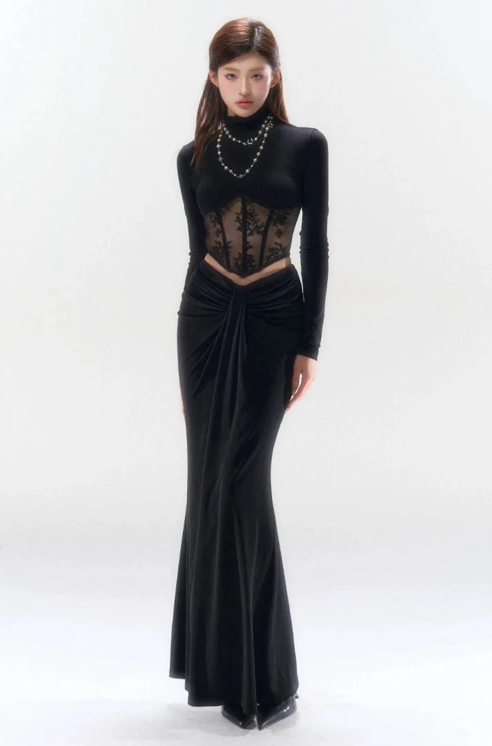 This high-waist, fishtail cut skirt embodies streamlined elegance. Crafted from a blend of adhesive fiber and cotton with a touch of spandex, this skirt offers a snug yet comfortable fit. Showcasing a unique ruched design and a street-style edge, it is perfect for making a subtle statement.