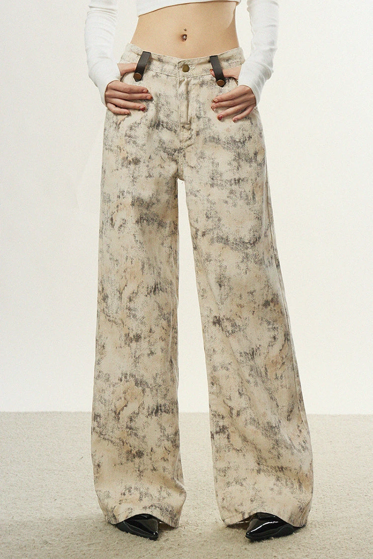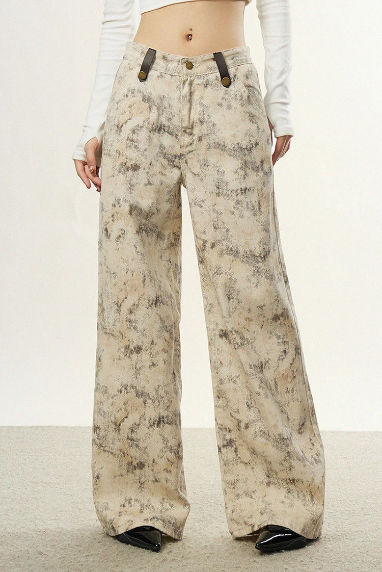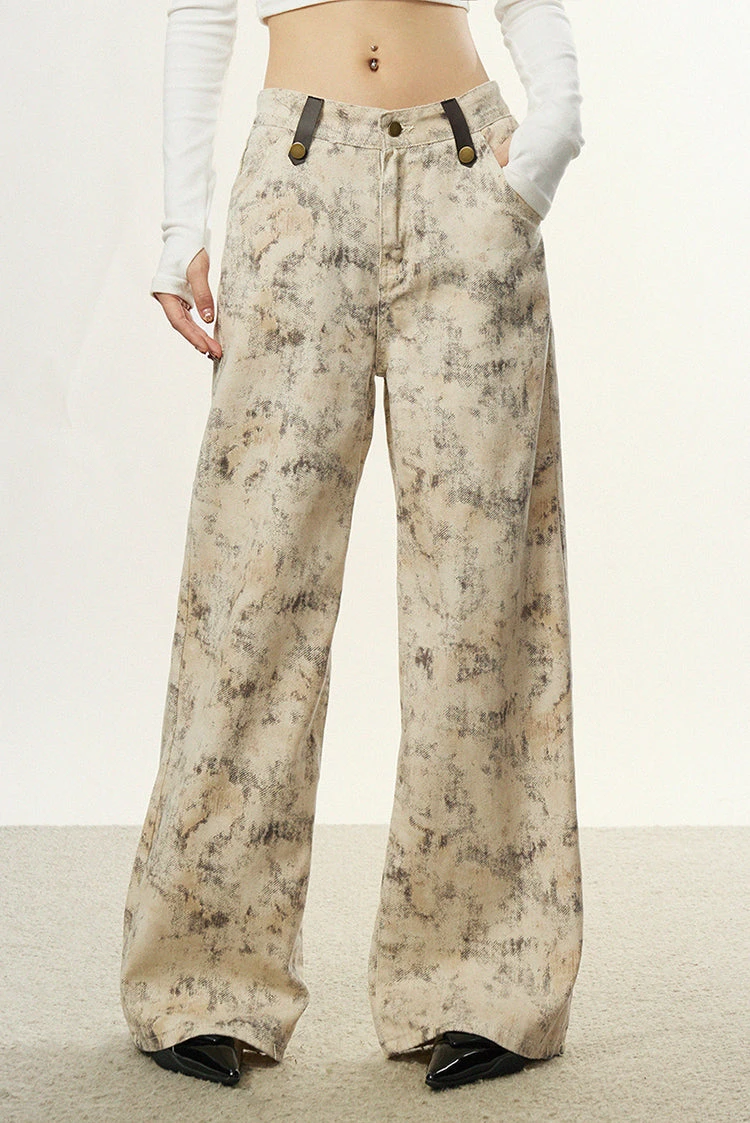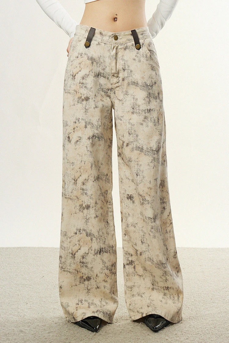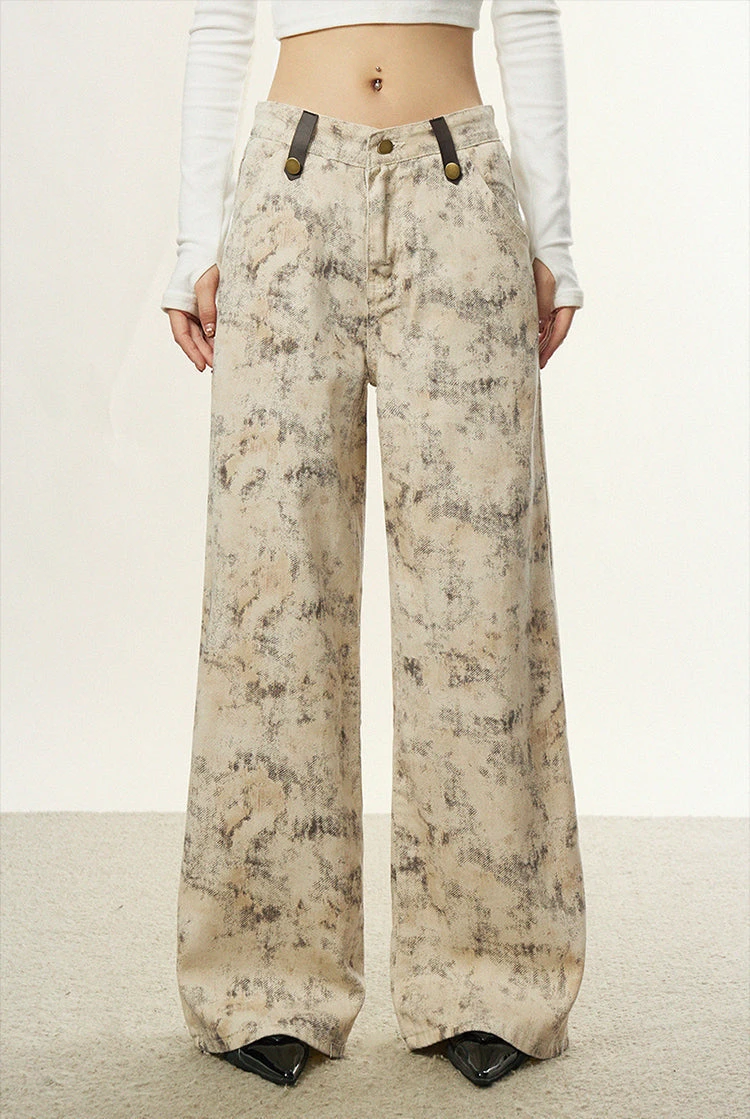 The relaxed silhouette and mid-wast fit offer both comfort and an easy edge, making them the perfect addition to a wardrobe built on attitude and versatility. Crafted from durable fabric with a subtle texture, the pants feature a tie-dye-inspired snake print that gives them a distressed, lived-in aesthetic. The wide-leg cut flows naturally, creating movement with every step while maintaining a structured feel. Thoughtful details like belt loops and a classic button-and-zip closure keep the look grounded.