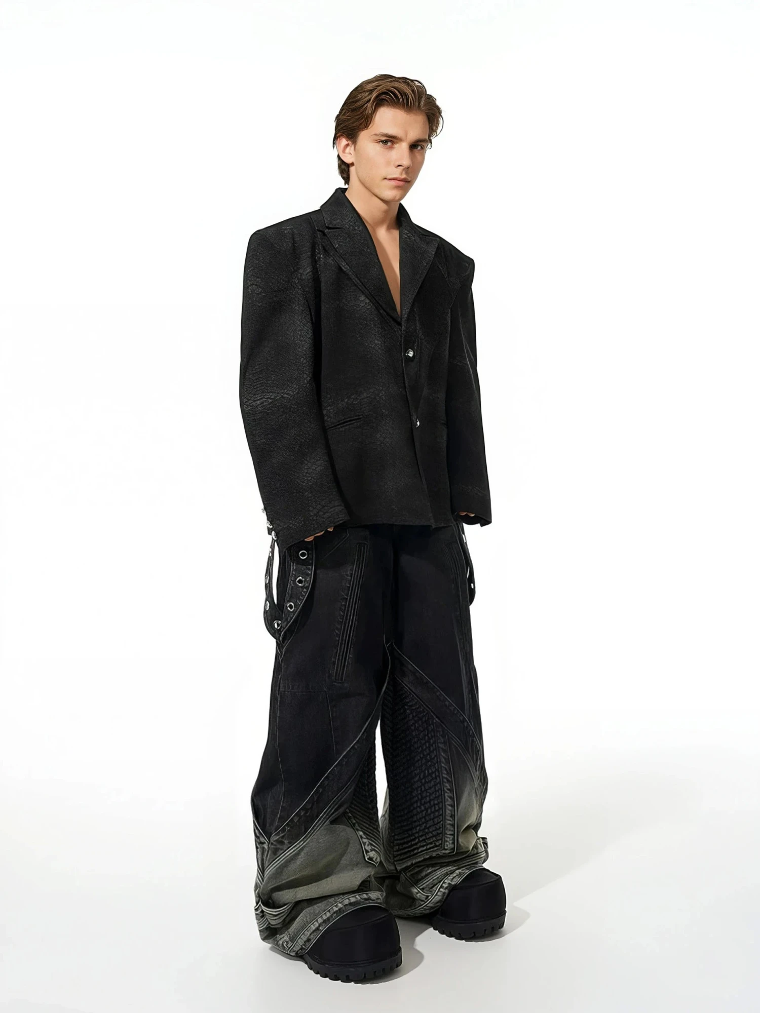 With an oversized fit and sharp shoulders, it makes a statement that’s confident but never overdone. Crafted from a subtly textured faux snakeskin fabric, this double-breasted blazer features clean cut lines, padded shoulders, and polished metallic buttons at the front and cuffs. The asymmetrical lapel adds a slightly offbeat edge, balancing professionalism with personality for a look that doesn’t follow the rules—just upgrades them.