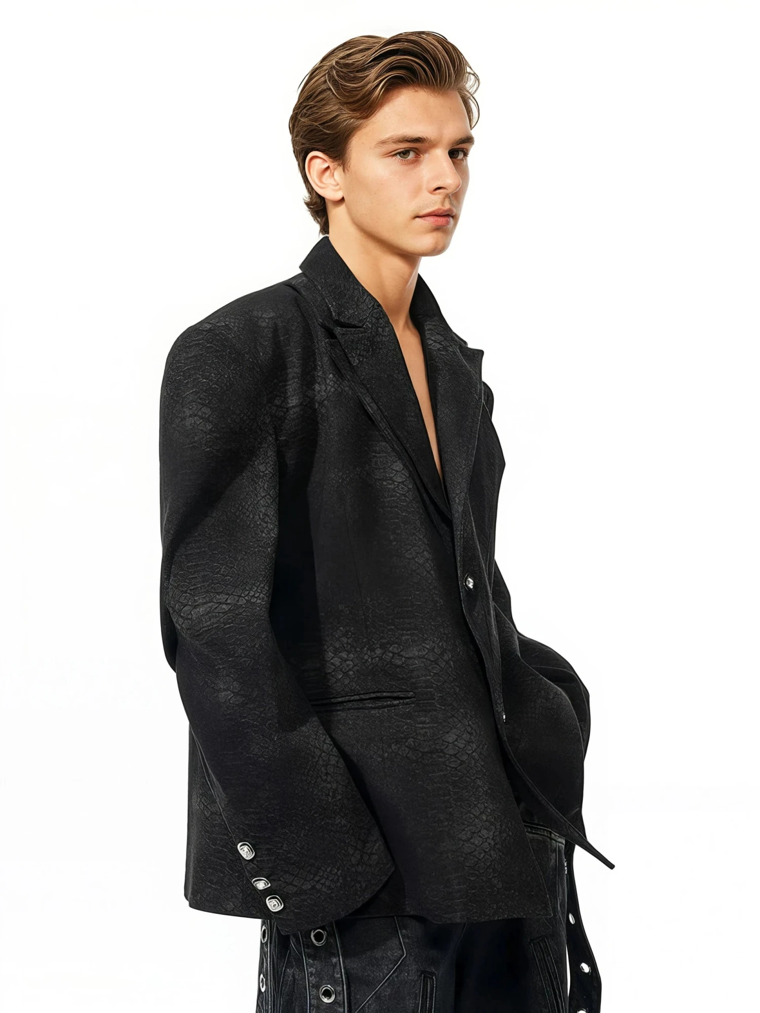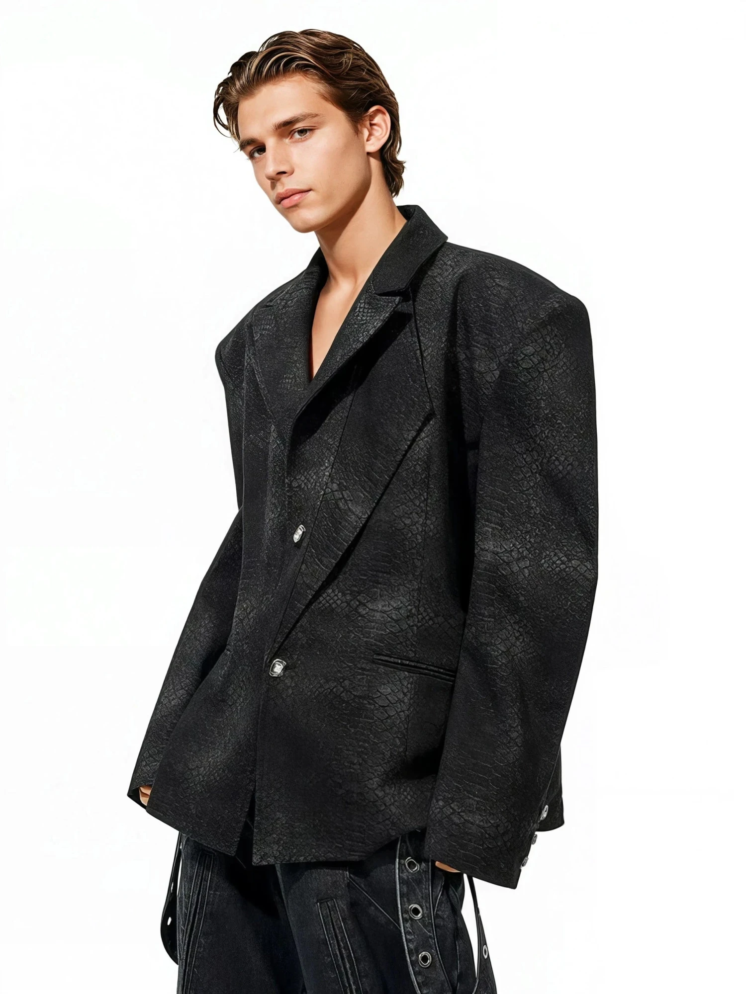 Own the moment without saying a word in this snake skin pattern textured blazer, where bold structure meets modern minimalism.