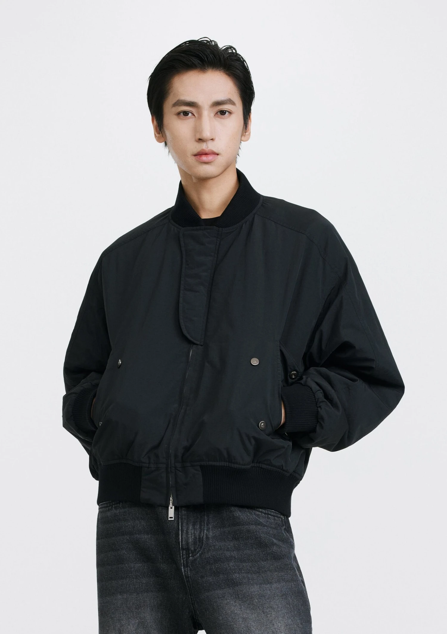 A clean, structured silhouette and snap-pocket detailing make this bomber jacket hard to overlook.