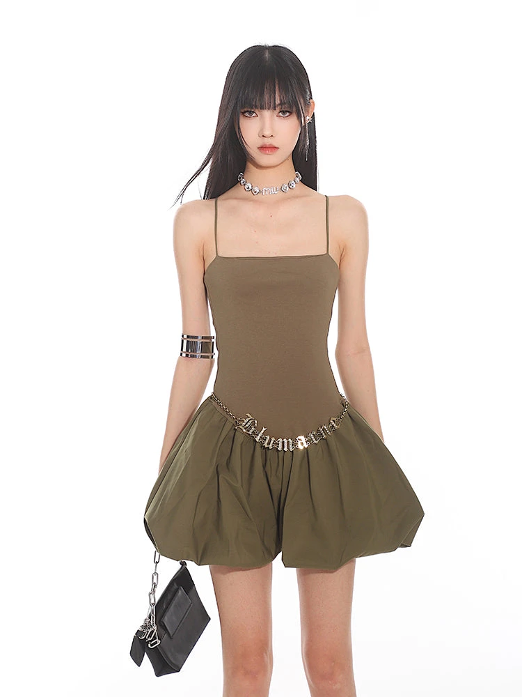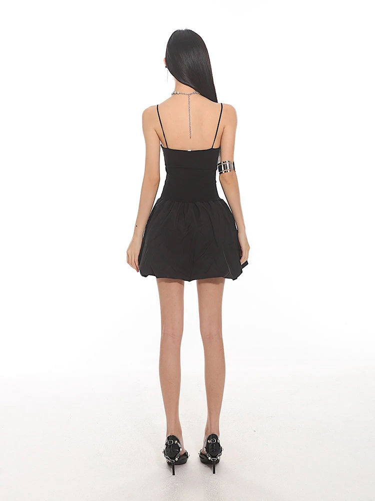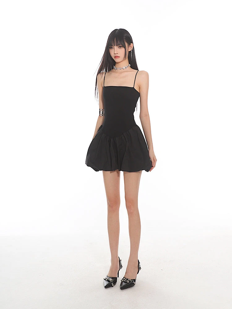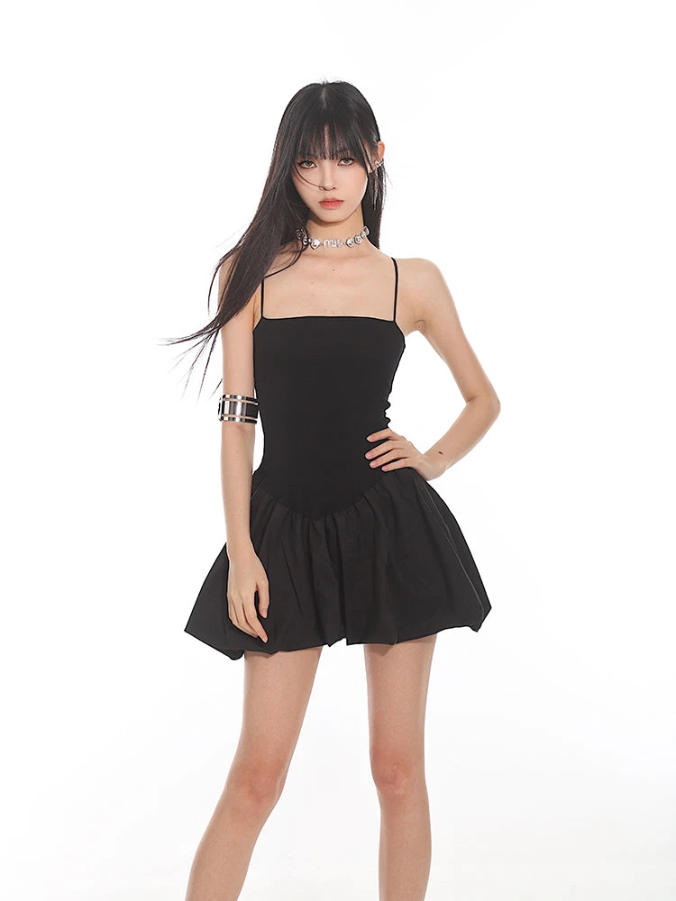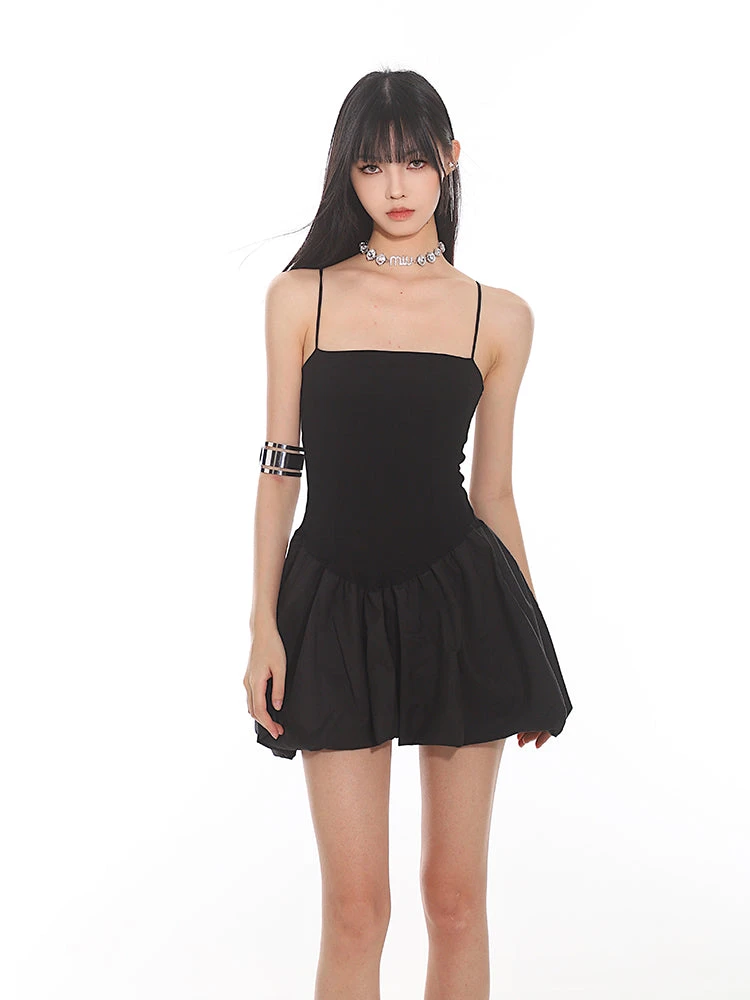 Constructed for comfort and style, this dress features a fitted bodice with slender spaghetti straps leading to a playful, pleated bubble skirt that exudes a sense of edgy, nonchalant elegance. The sleek and stretchy material ensures a figure-flattering silhouette, while the dress’s versatile cut makes it suitable for both daytime adventures and evening escapades.
