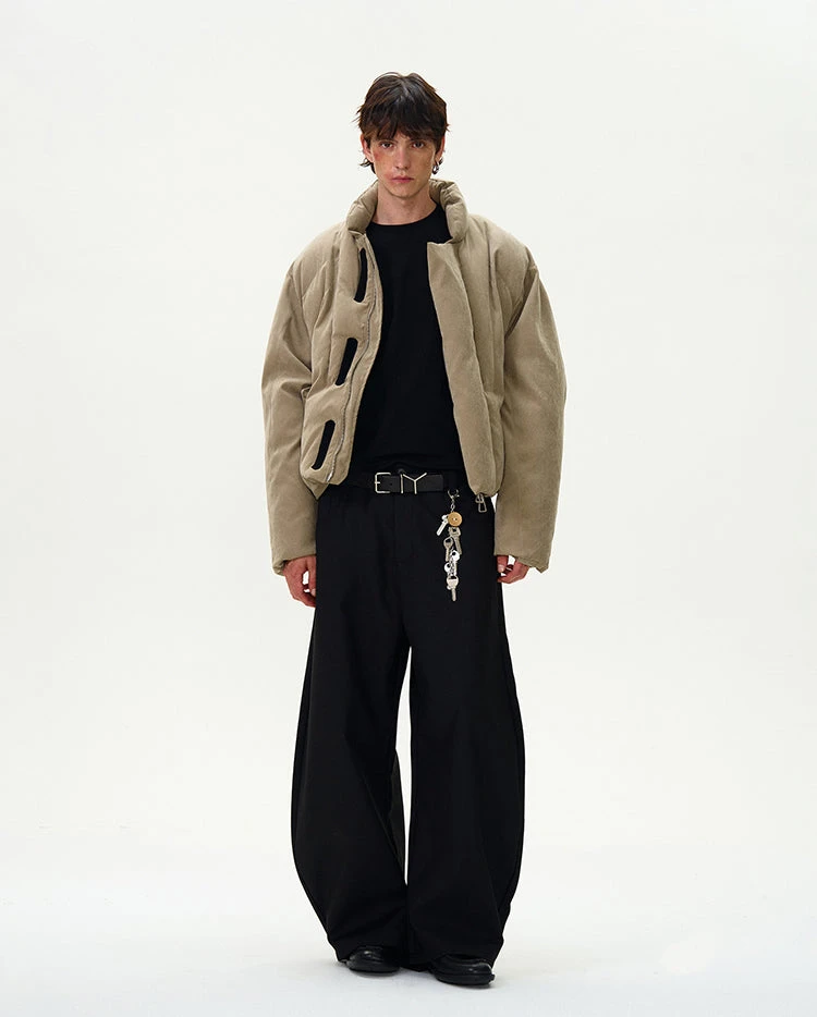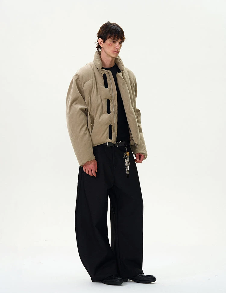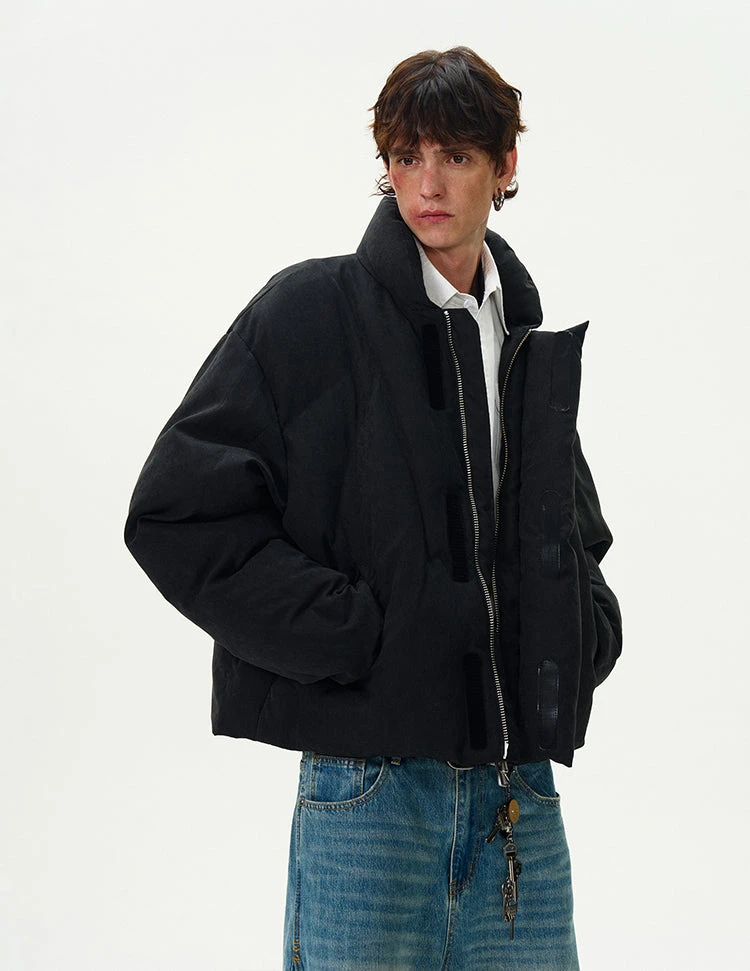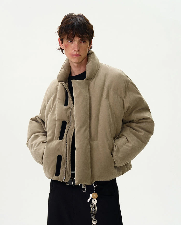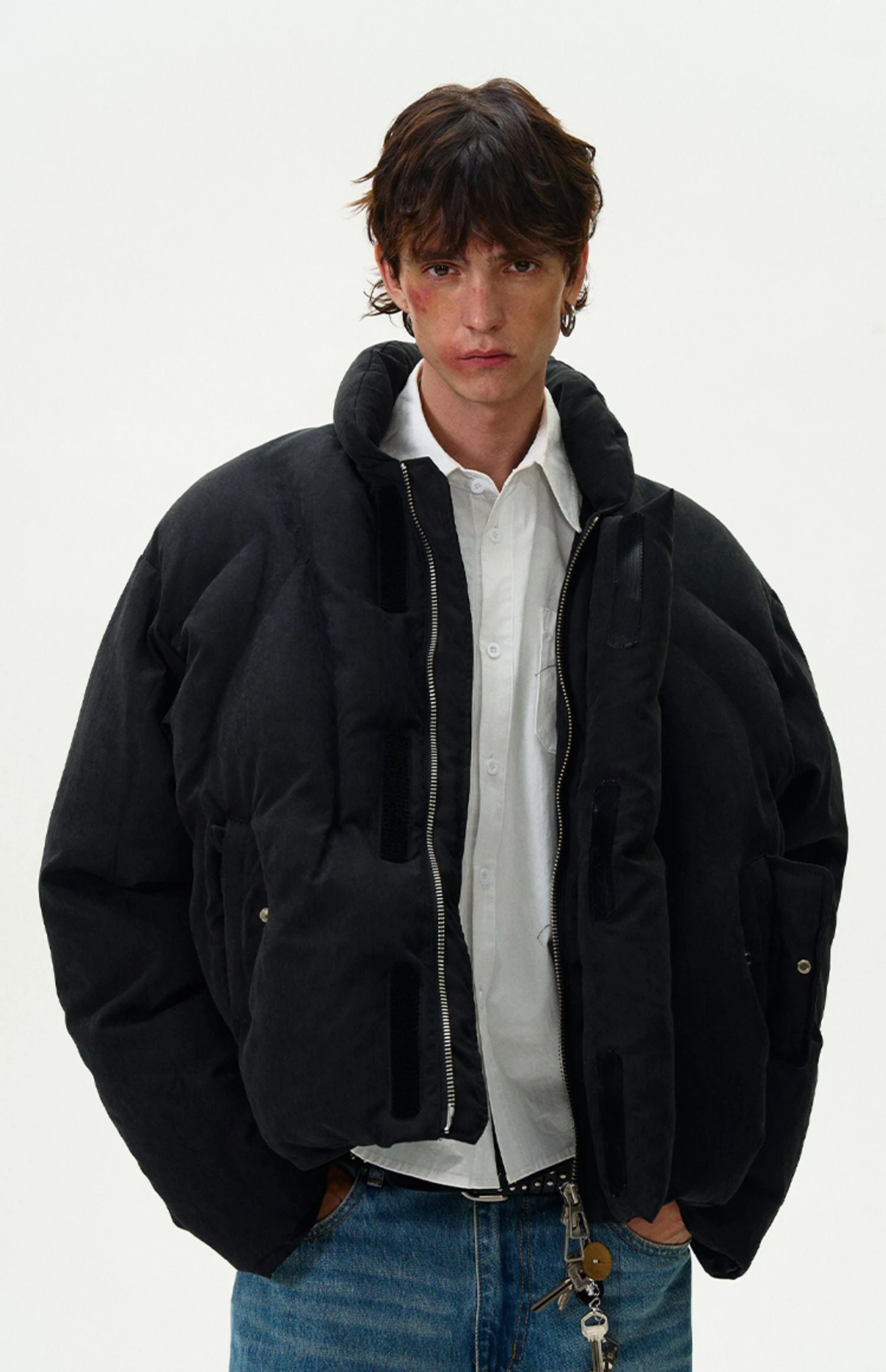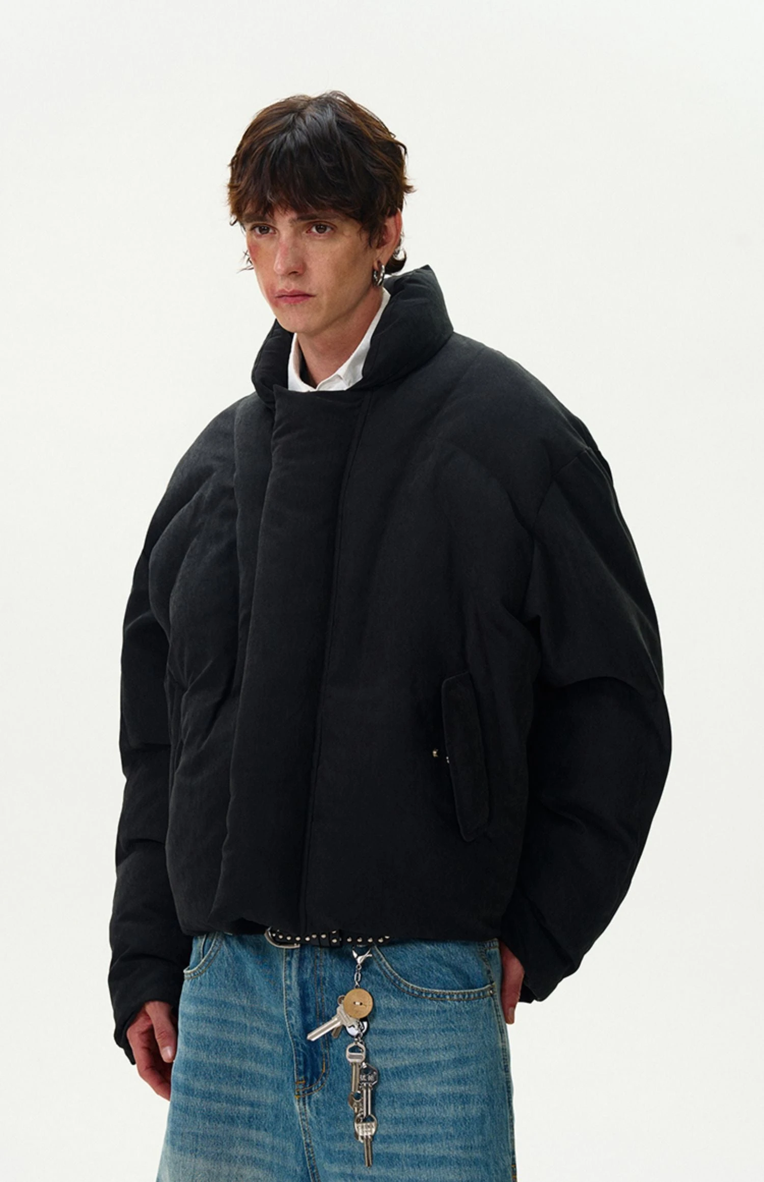 Designed with a stand collar and an exaggerated silhouette, it effortlessly blends functionality with a bold, statement-making look. Crafted from soft yet durable fabric with a subtly worn-in texture, this piece feels lived-in while maintaining a strong, structured shape. Its plush padding provides notable insulation without excessive bulk, making it easy to throw on over any outfit. The distinct closure detailing adds an edgy, utilitarian feel, perfect for layering over both casual and elevated streetwear looks.