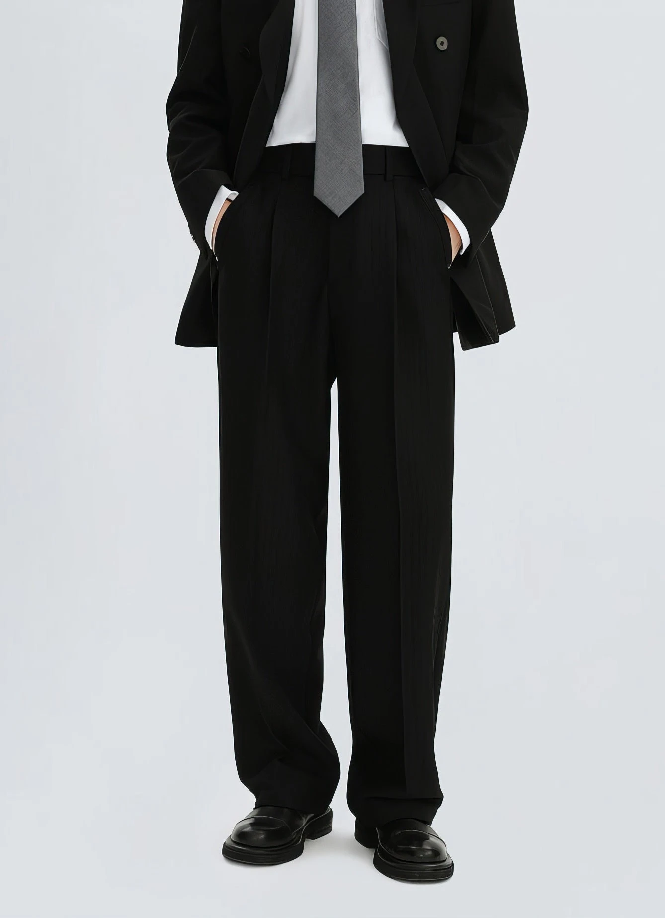 Effortlessly put together yet intentionally undone, these textured wide leg pleated trousers bring a sharp, relaxed energy to any wardrobe.