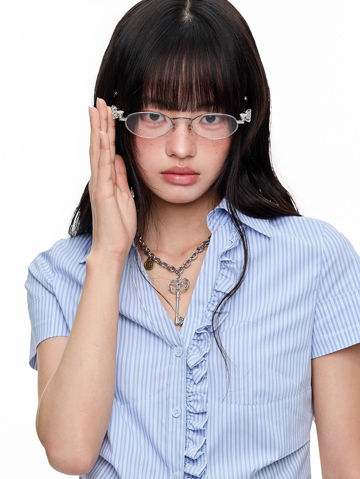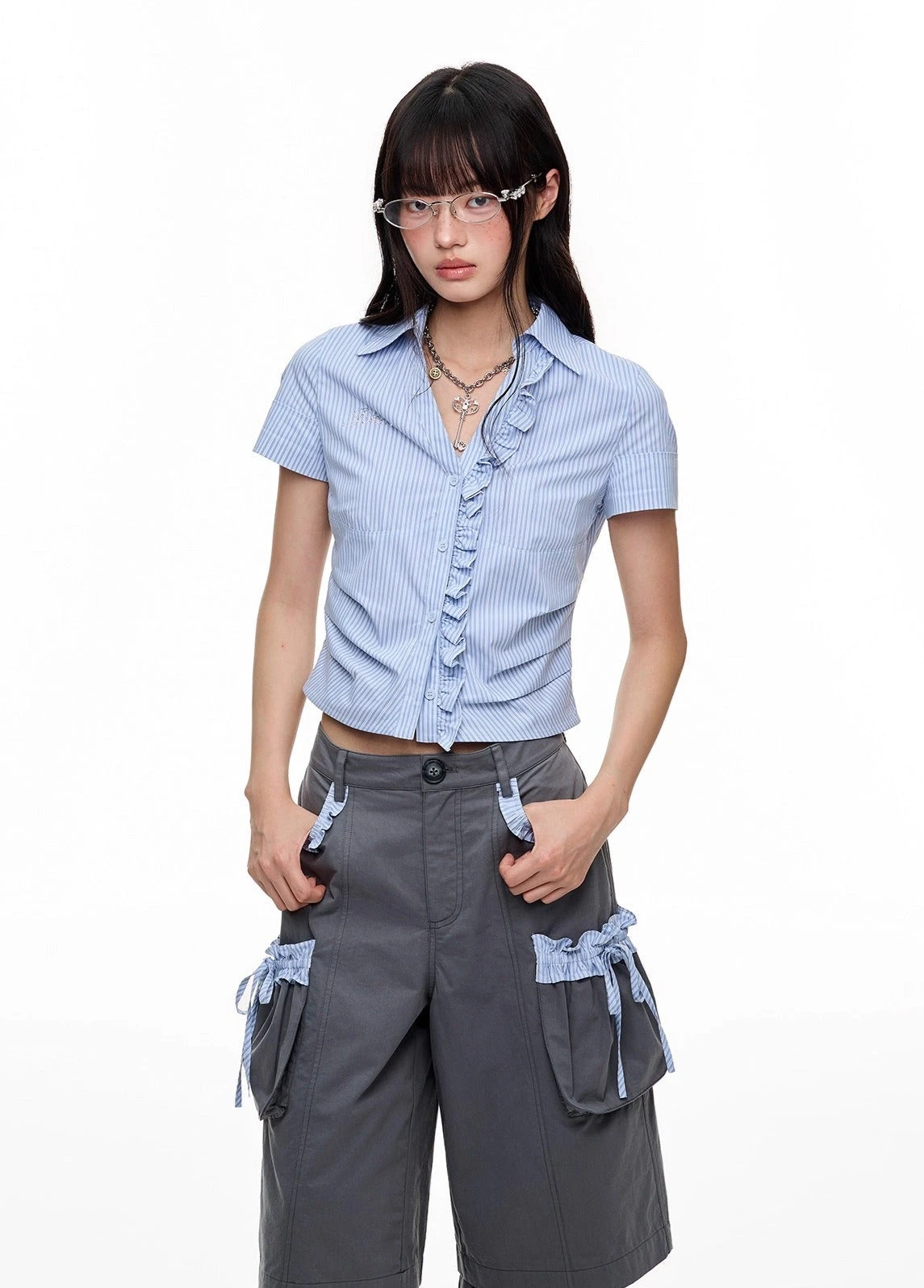 A crisp stripe detail meets soft structure in the Stripe Ruffle Trim Button-Up Shirt—designed for a sharp look without trying too hard.