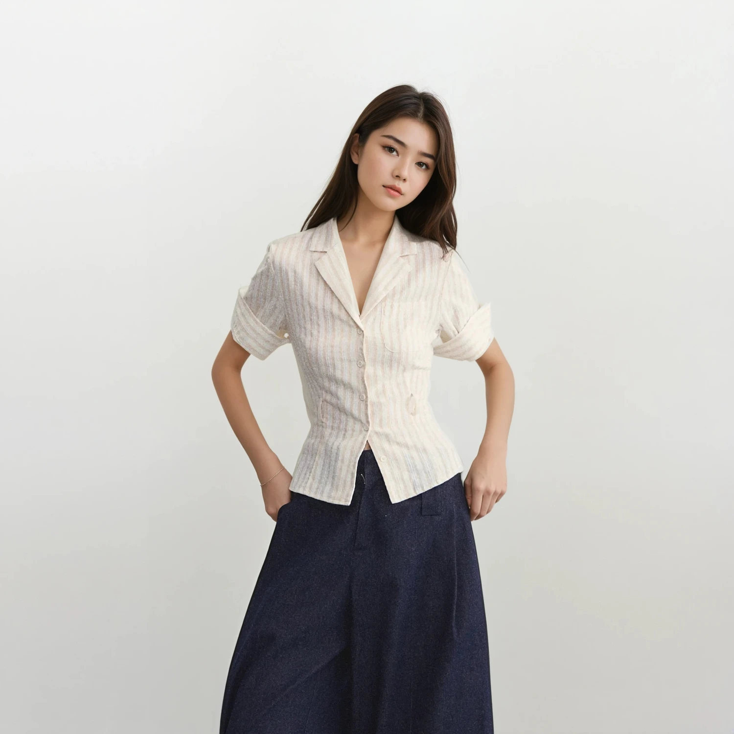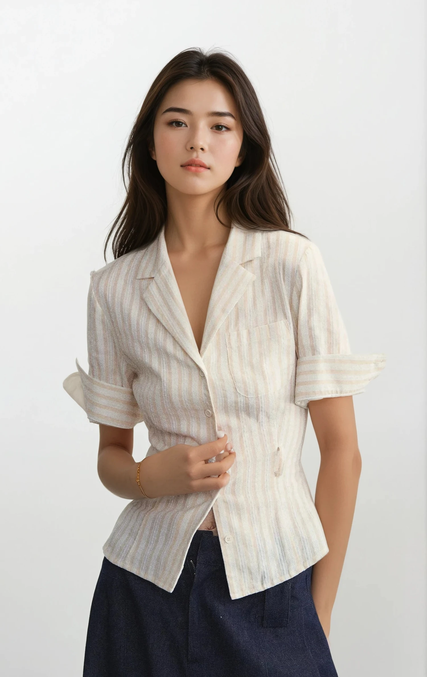 Designed with subtle pinstripes and a cinched waistline, it blends tailored polish with effortless edge. The lightweight cotton-blend fabric features a soft texture and smooth drape, while the rolled sleeves and chest pocket add understated detail without trying too hard.