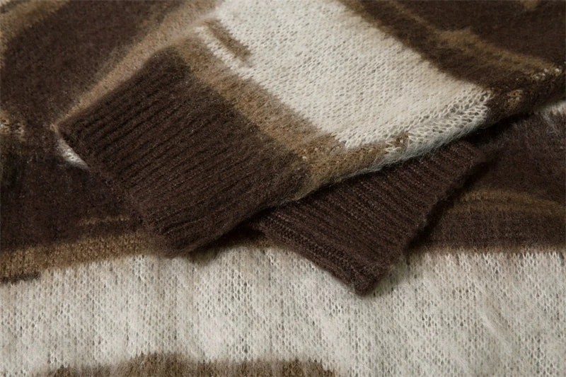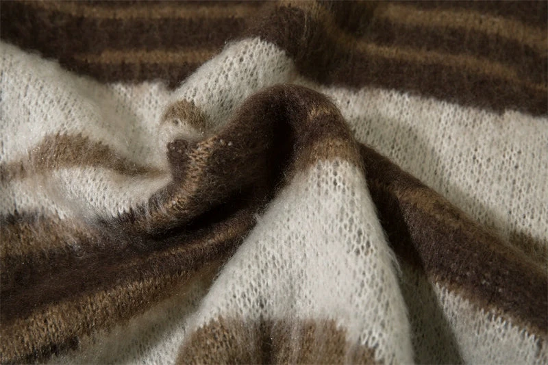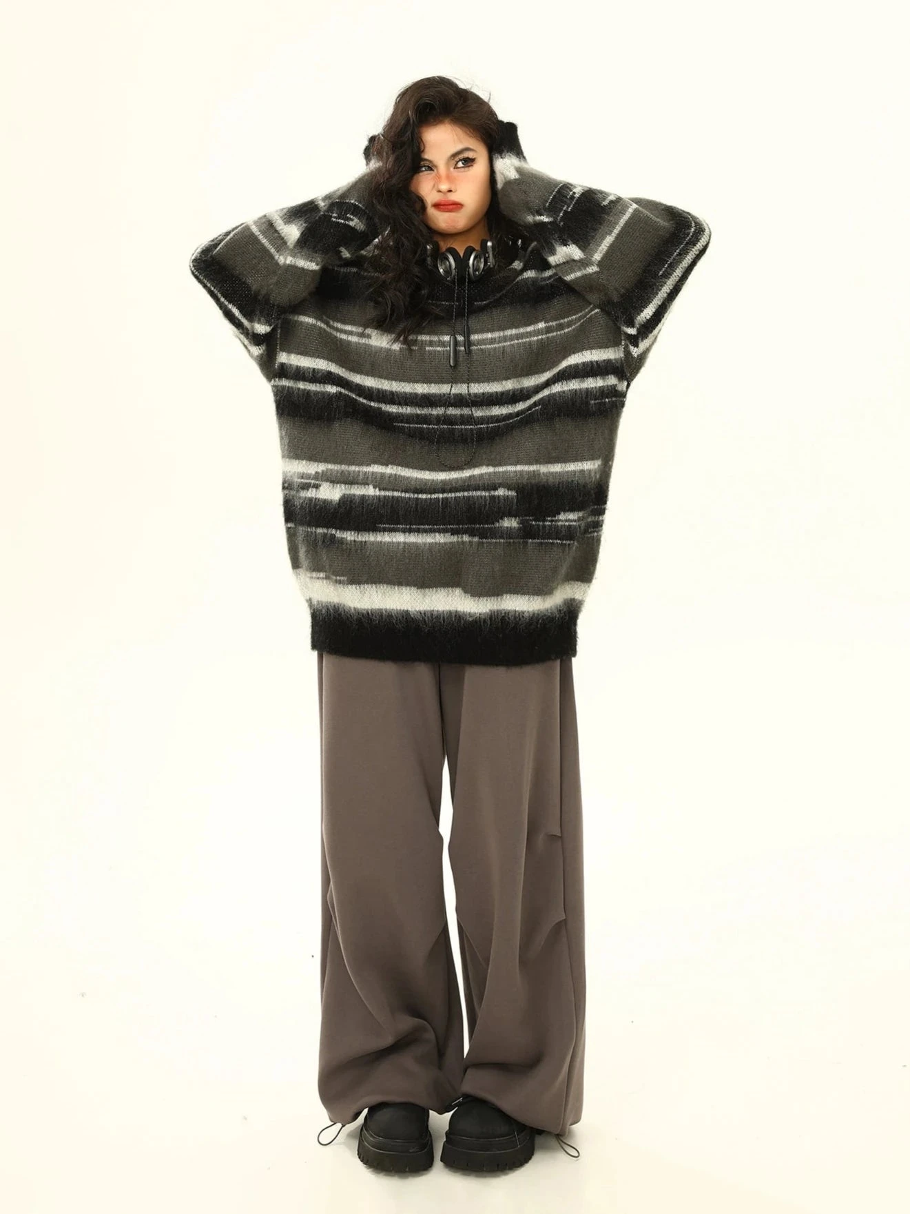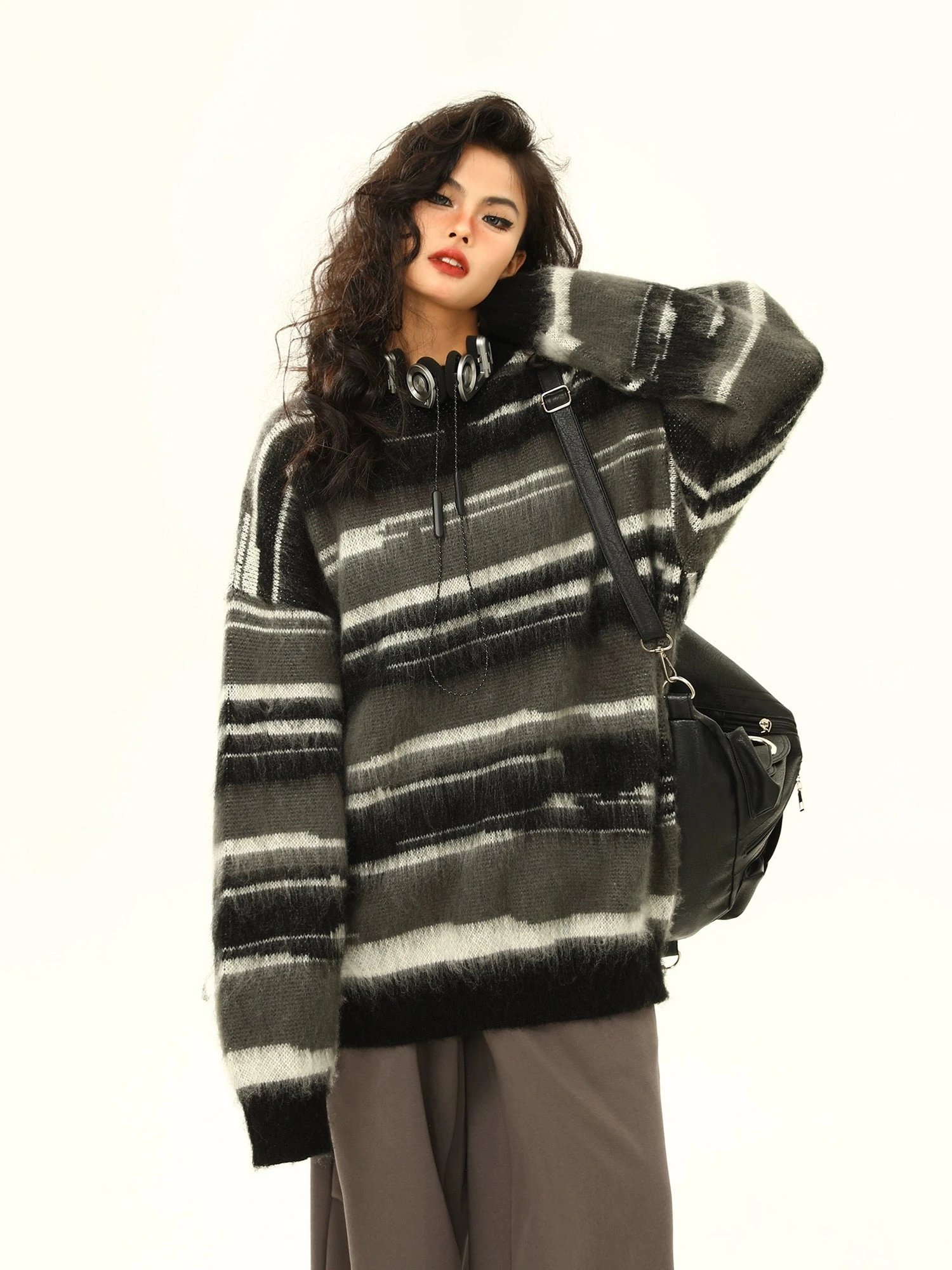 This cozy knitwear piece features a bold striped pattern, lending a graphic punch to the fuzzy texture that promises warmth and comfort. The oversized fit with drop shoulders adds a contemporary twist to this classic silhouette, ensuring you stay both stylish and snug.