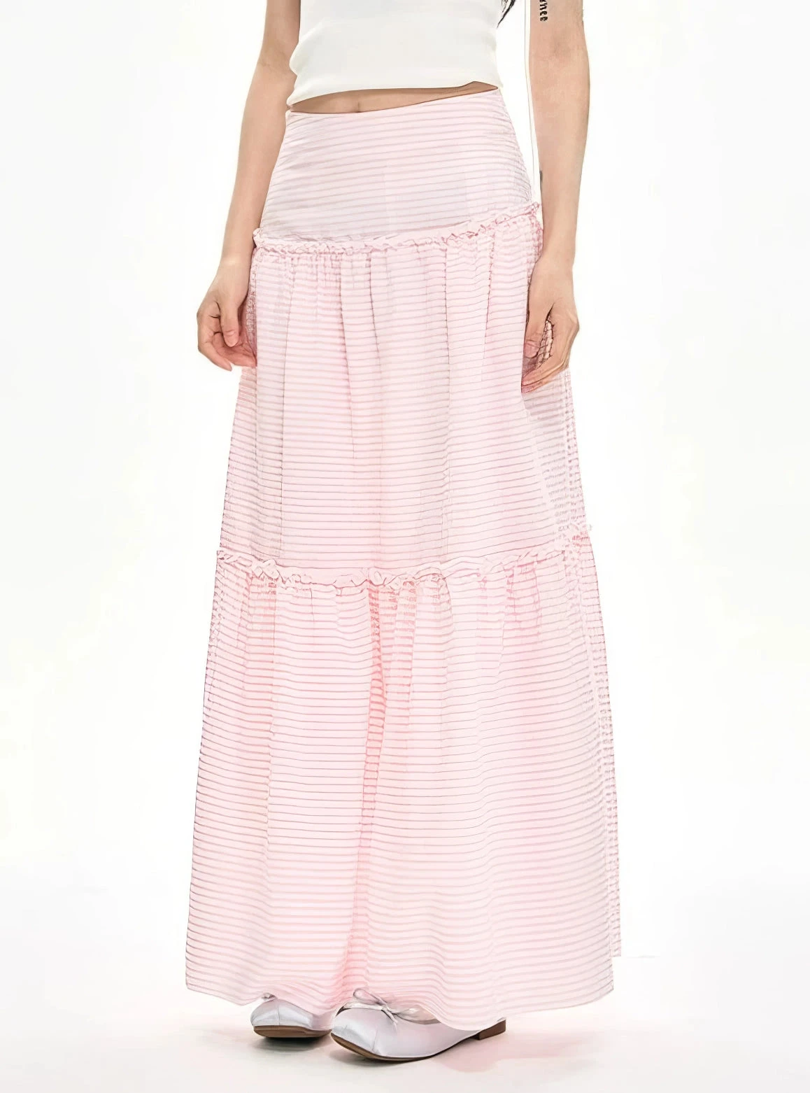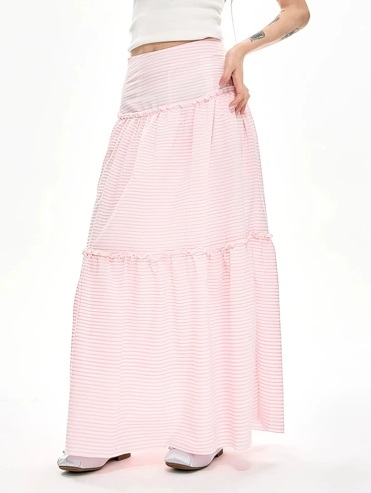 Embrace the whimsical allure of the Striped Ruffle Hem Maxi Skirt, a perfect blend of charm and versatility.