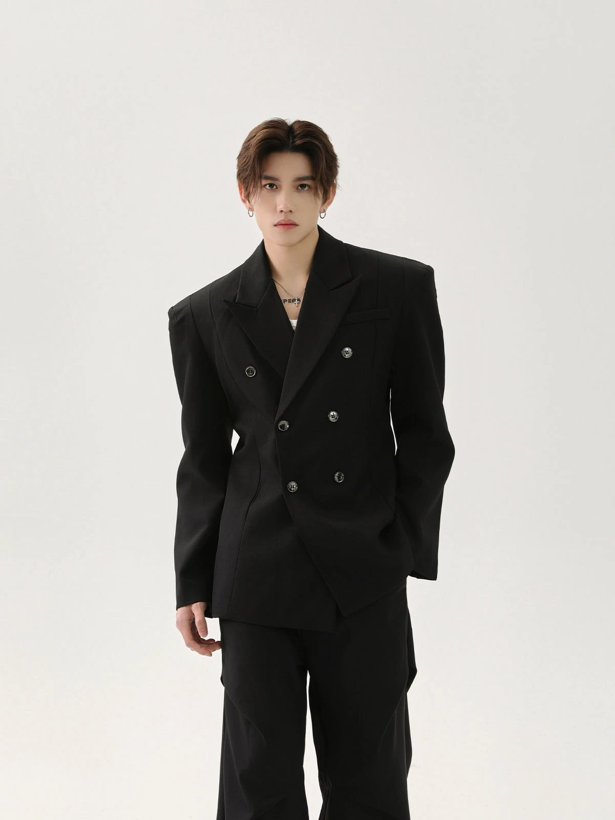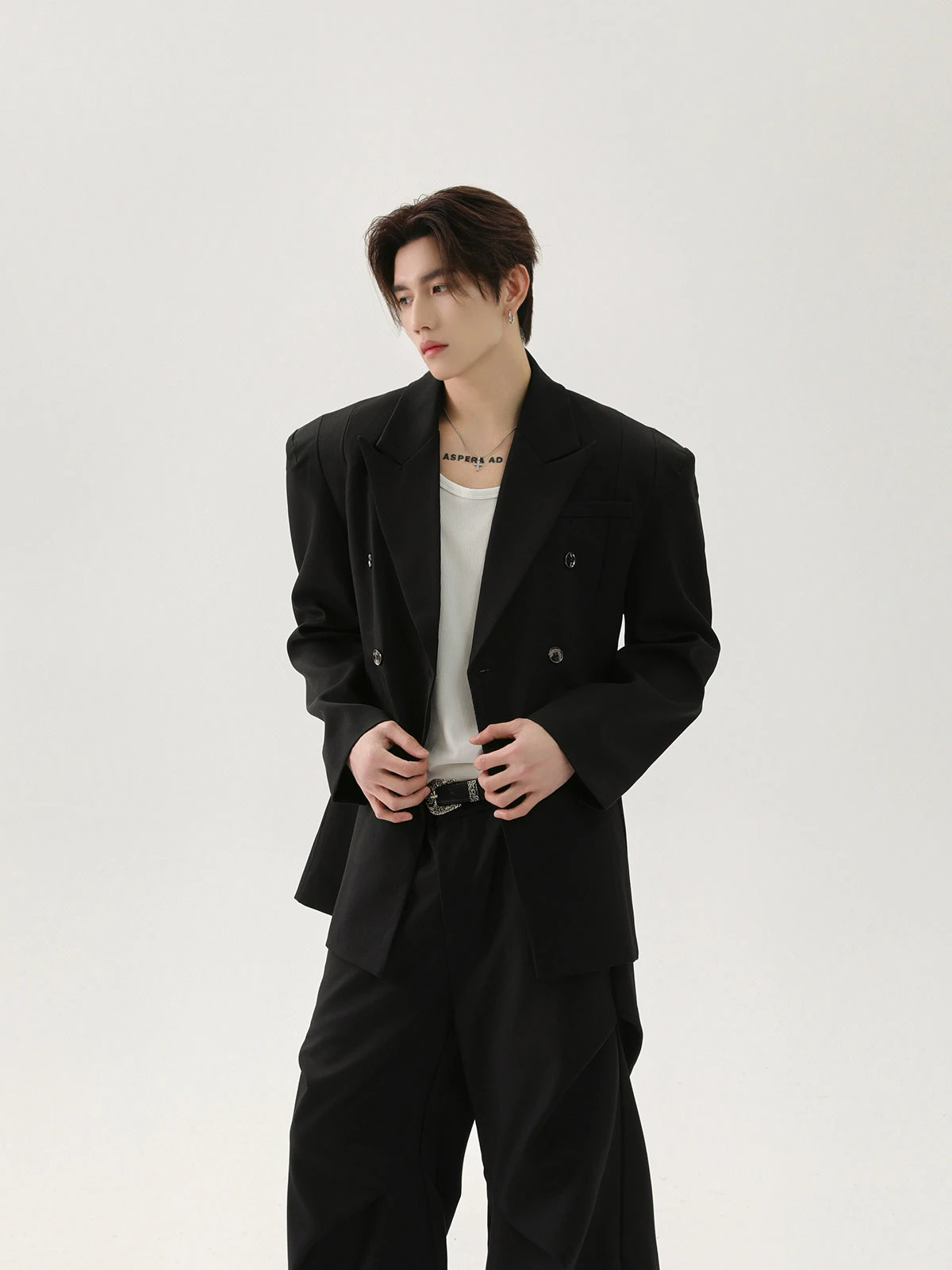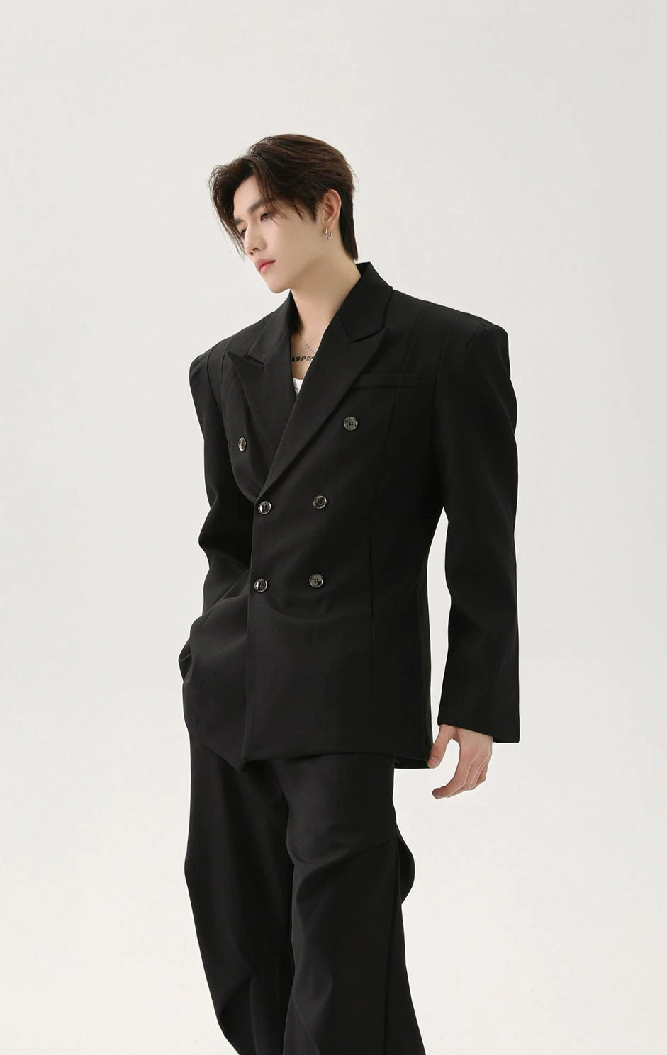 Structured and sharp, this double-breasted blazer with bold shoulder pads brings a defined silhouette that stands out without trying too hard.