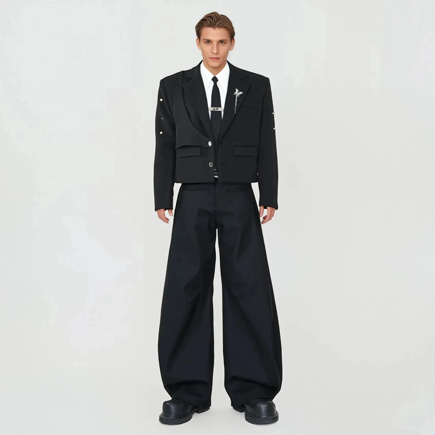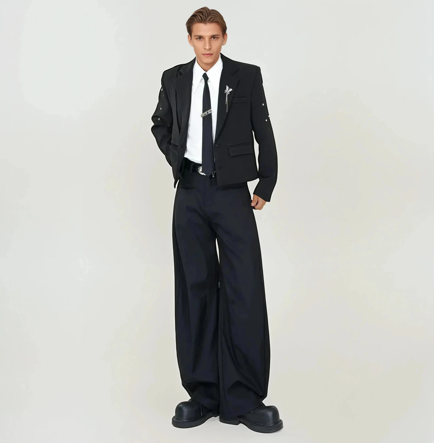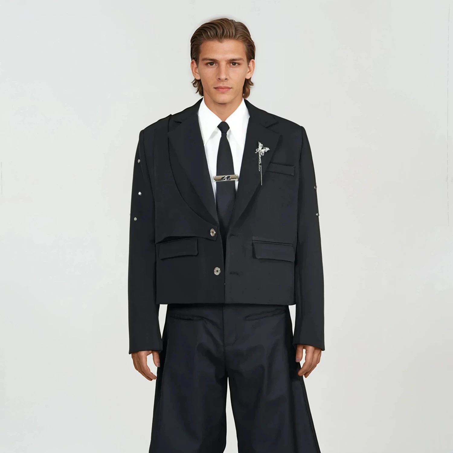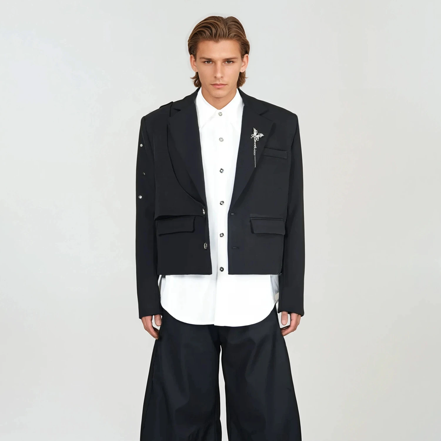 Designed for those who move between professional and casual settings without switching personas, it delivers polish with an unapologetic attitude. Crafted from smooth, wrinkle-resistant polyester, the tailored fit features subtle shoulder padding for structure and a cropped hem that updates the classic blazer shape. Its clean lines are elevated with stud detailing across the sleeves and a solid black finish, keeping the look streamlined and versatile without losing its character.