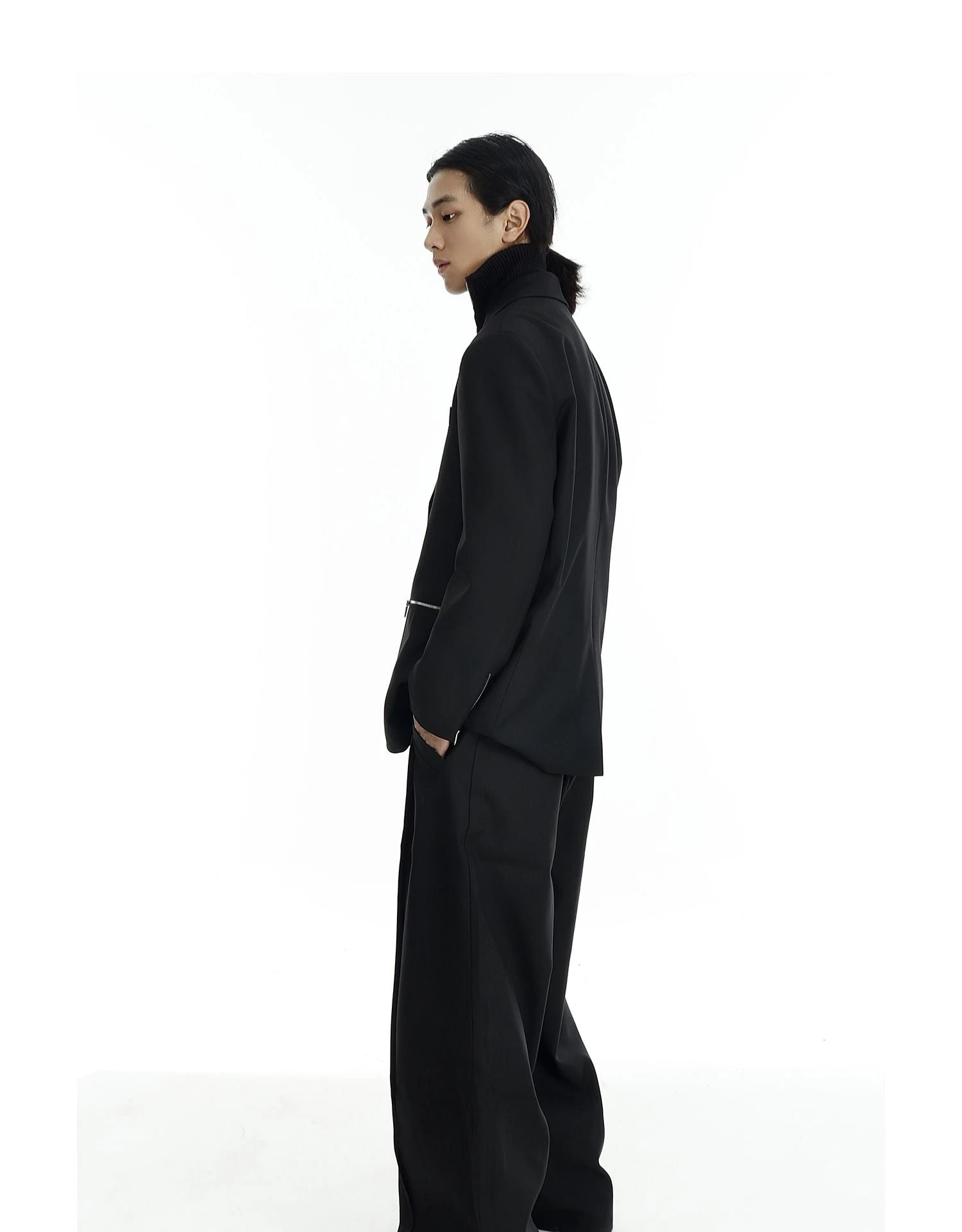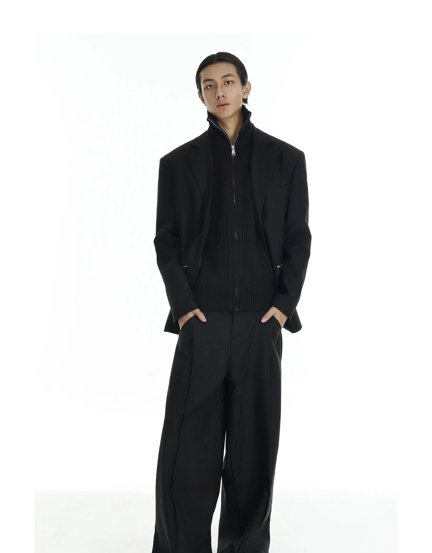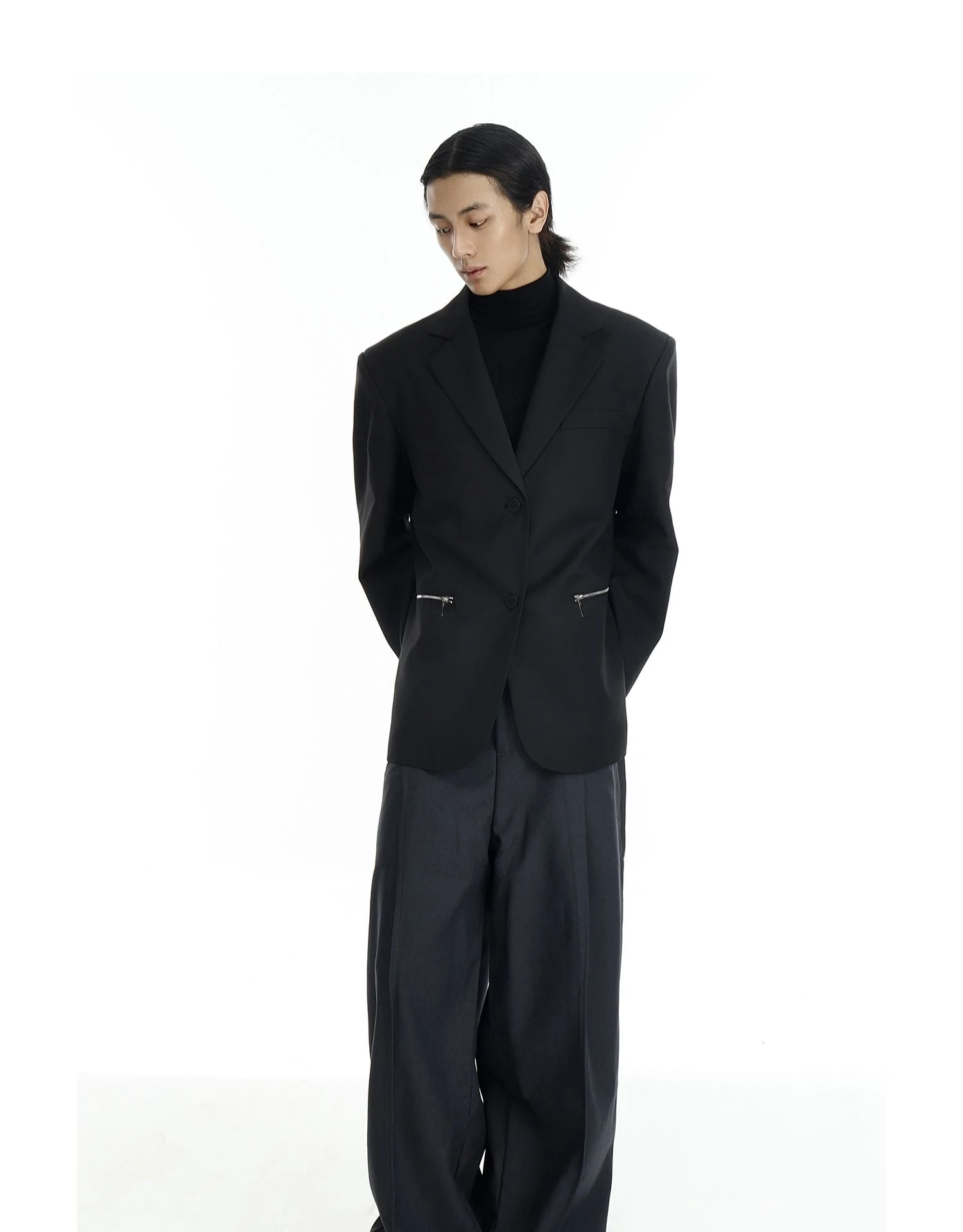 Crafted from a durable yet comfortable blend of polyester and cotton, this blazer balances a loose silhouette with sharp tailoring. The smooth finish, zippered pockets, and custom-molded buttons reflect expert construction while breaking away from traditional formality. It’s a look that doesn’t try too hard, but still turns heads.