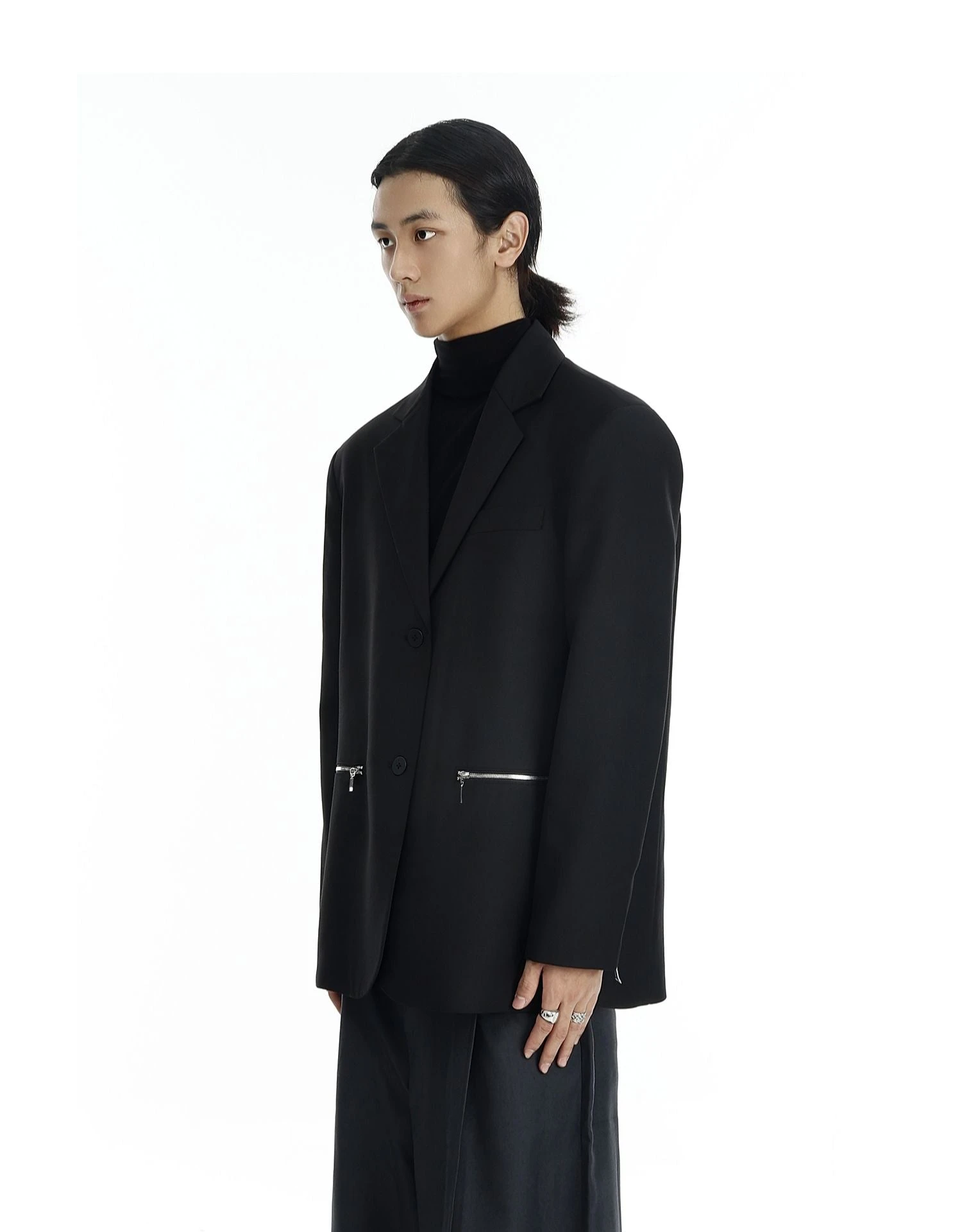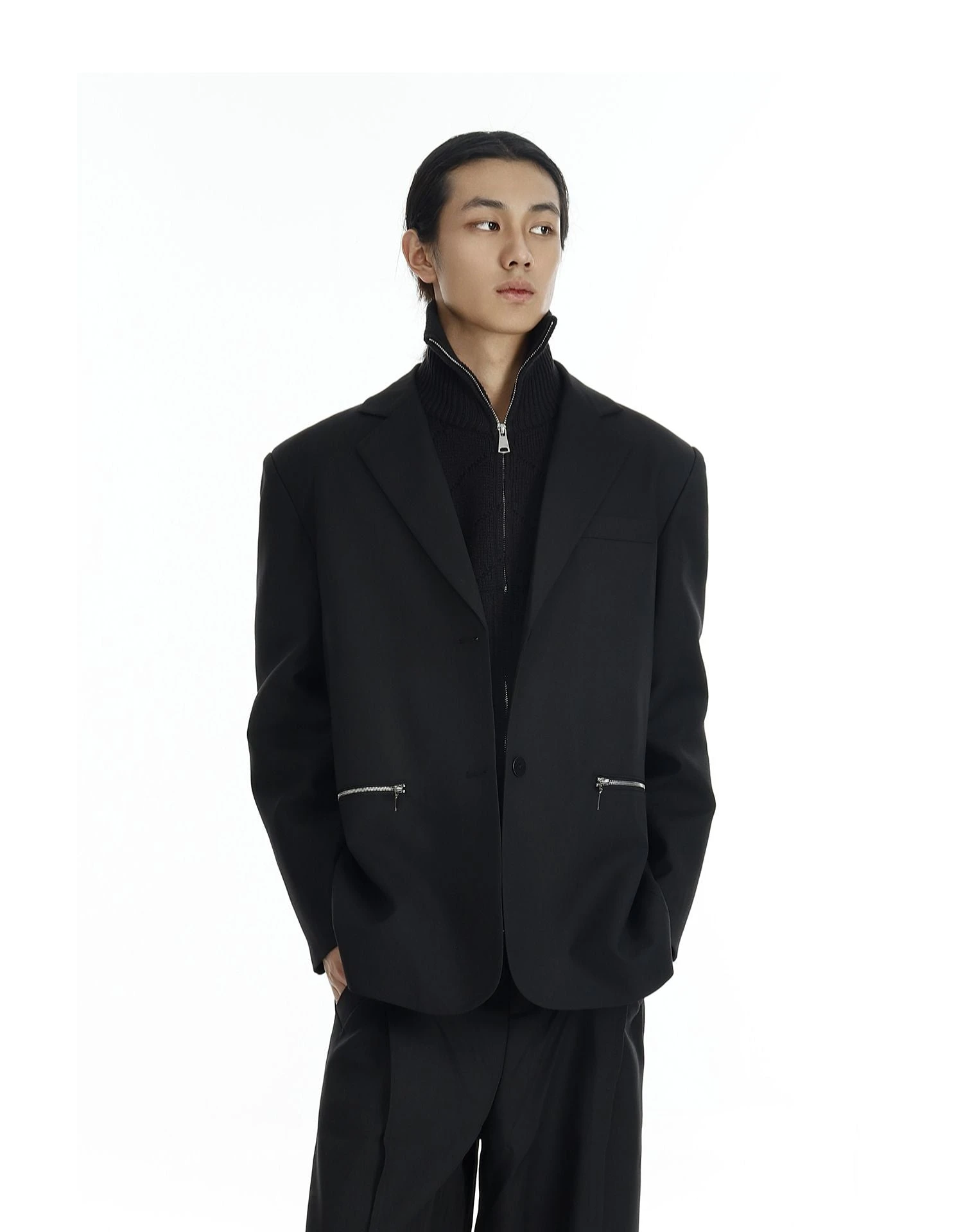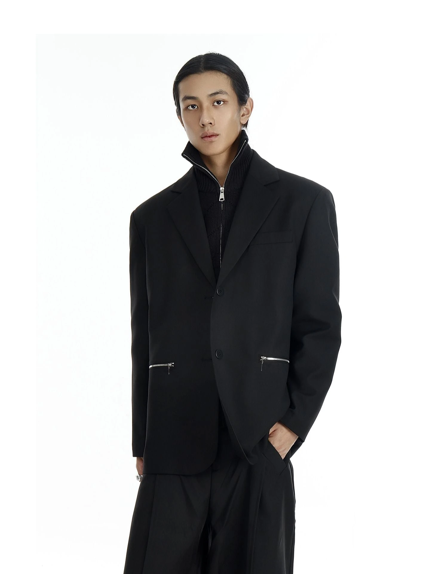 Design details: Silver zipper pockets, notch lapel, functional sleeve zippers