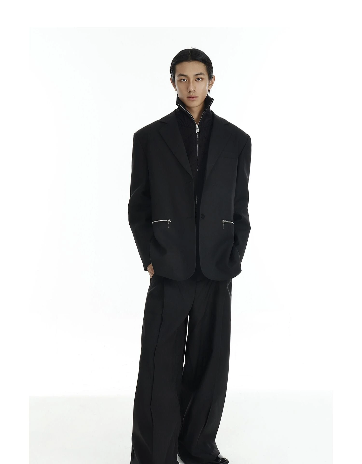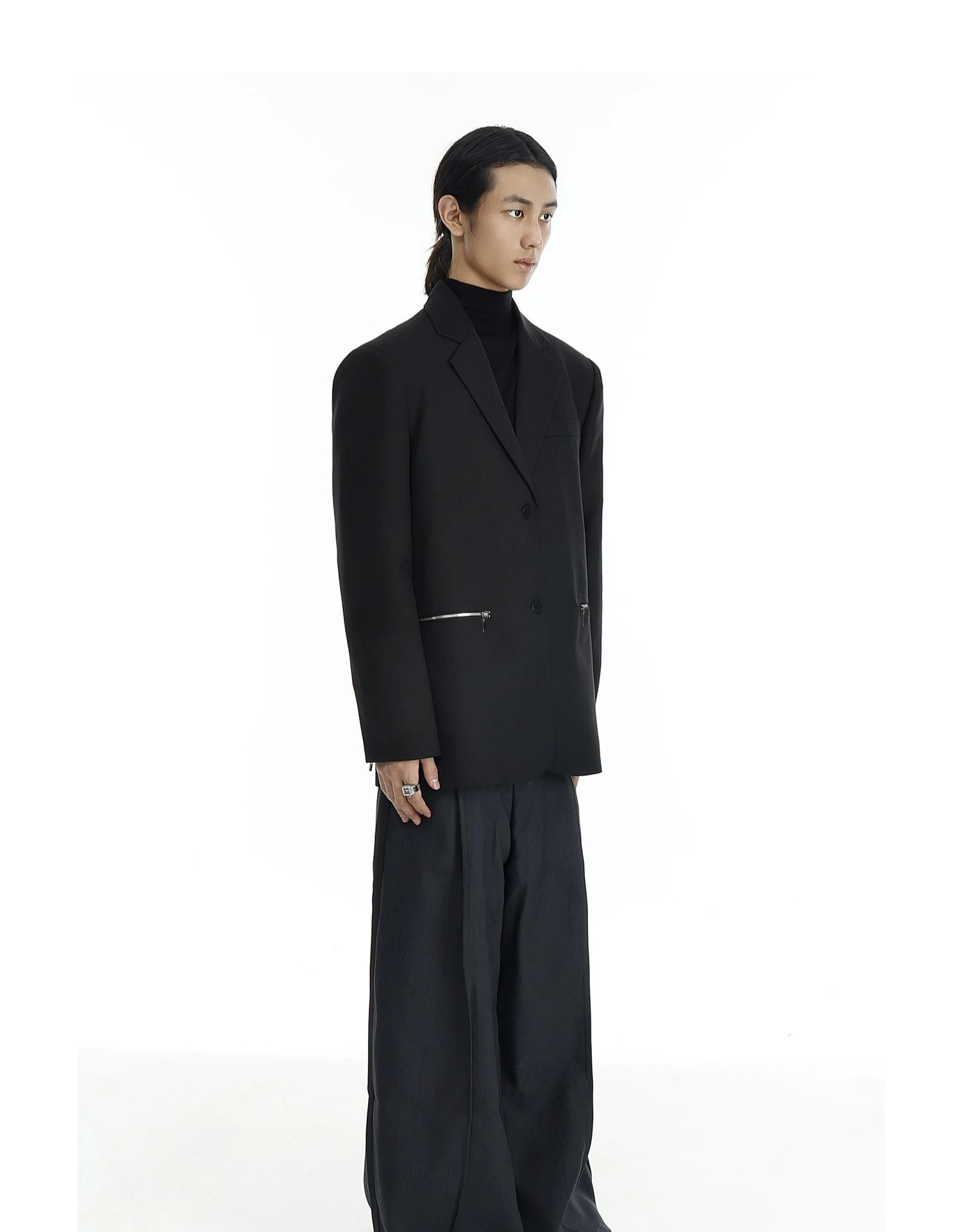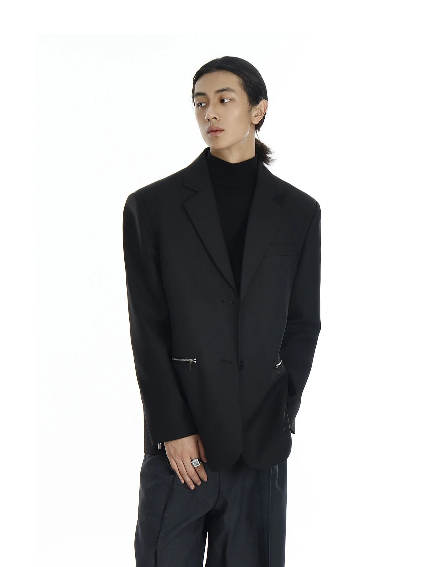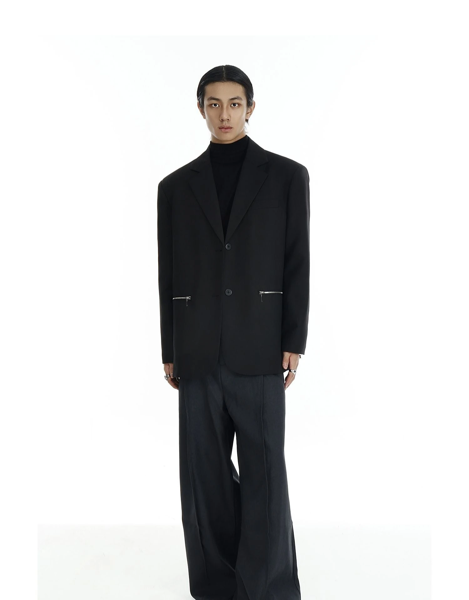 Design details: Silver zipper pockets, notch lapel, functional sleeve zippers