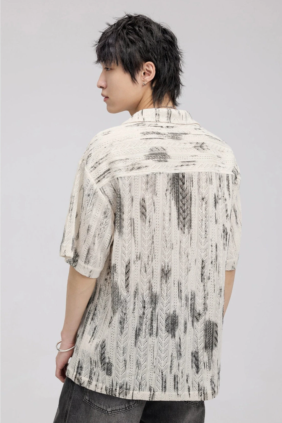The unique paint-wash effect adds depth without overwhelming, making it a piece you can keep on rotation. Crafted from soft, lightly structured knitted fabric, it features a loose fit for added comfort and movement, while the openwork texture subtly plays with light and shadow for a layered look.
