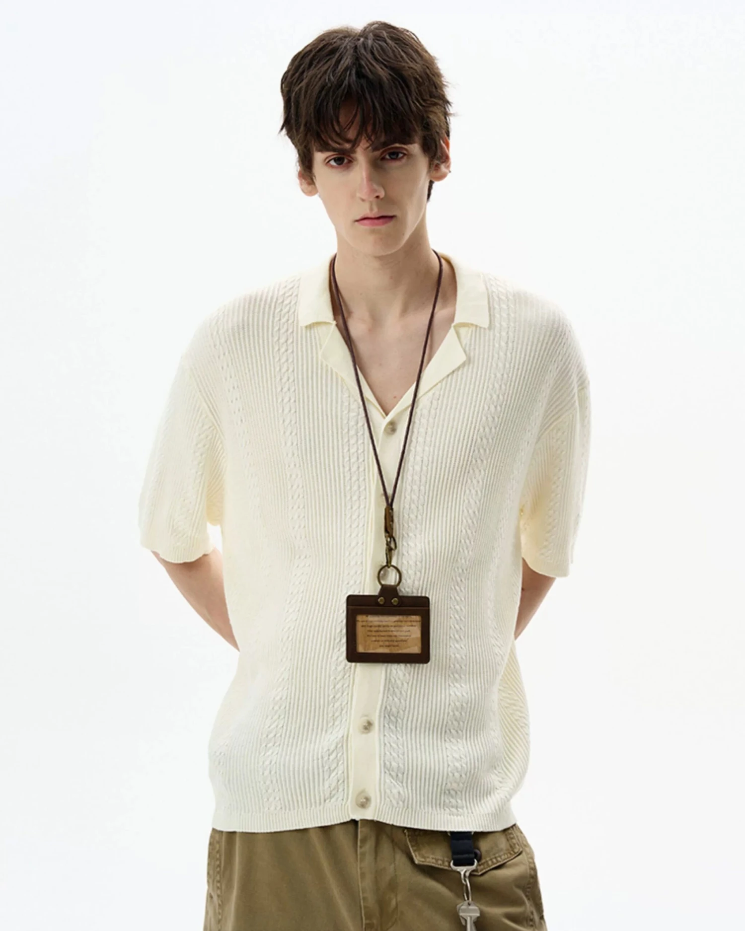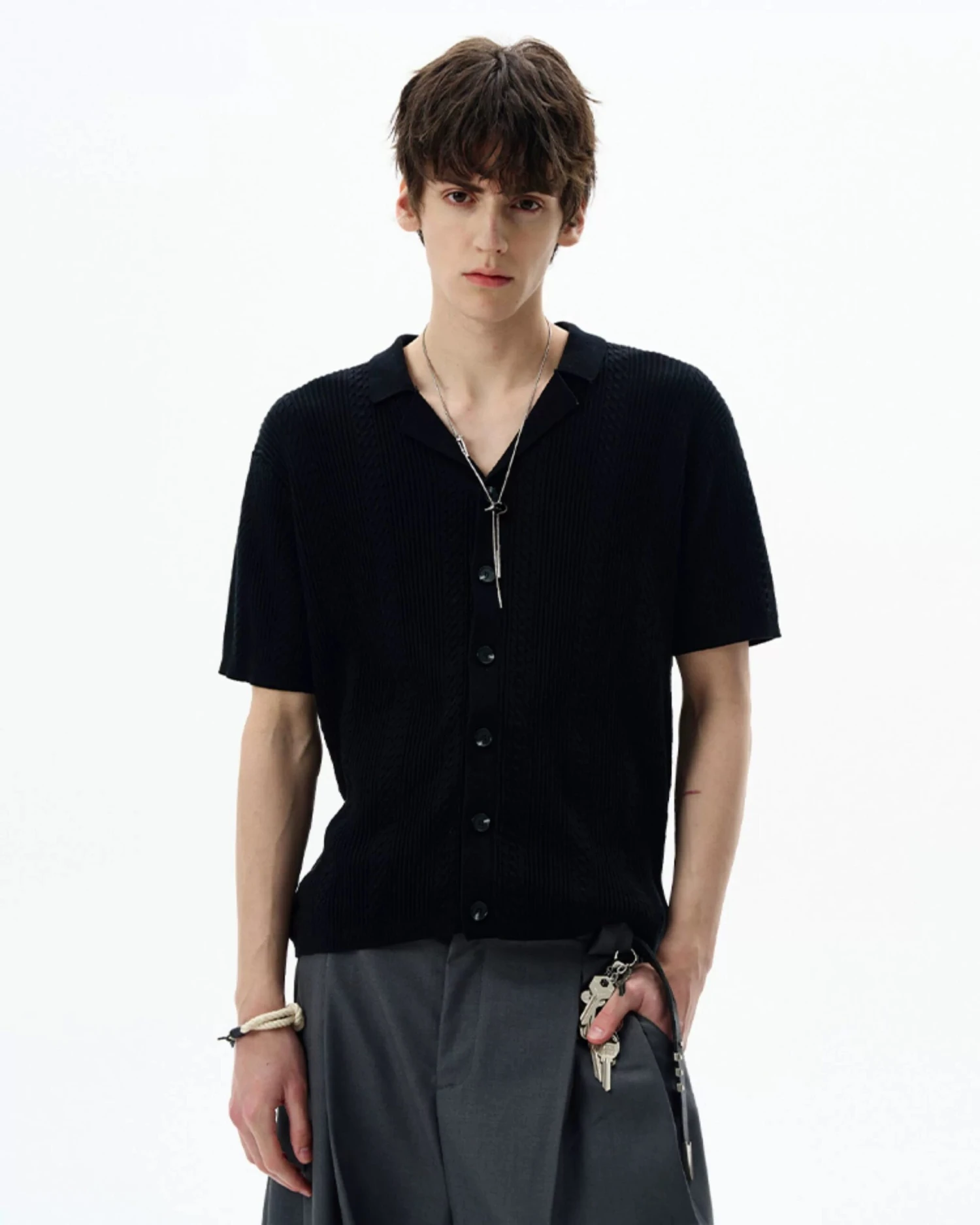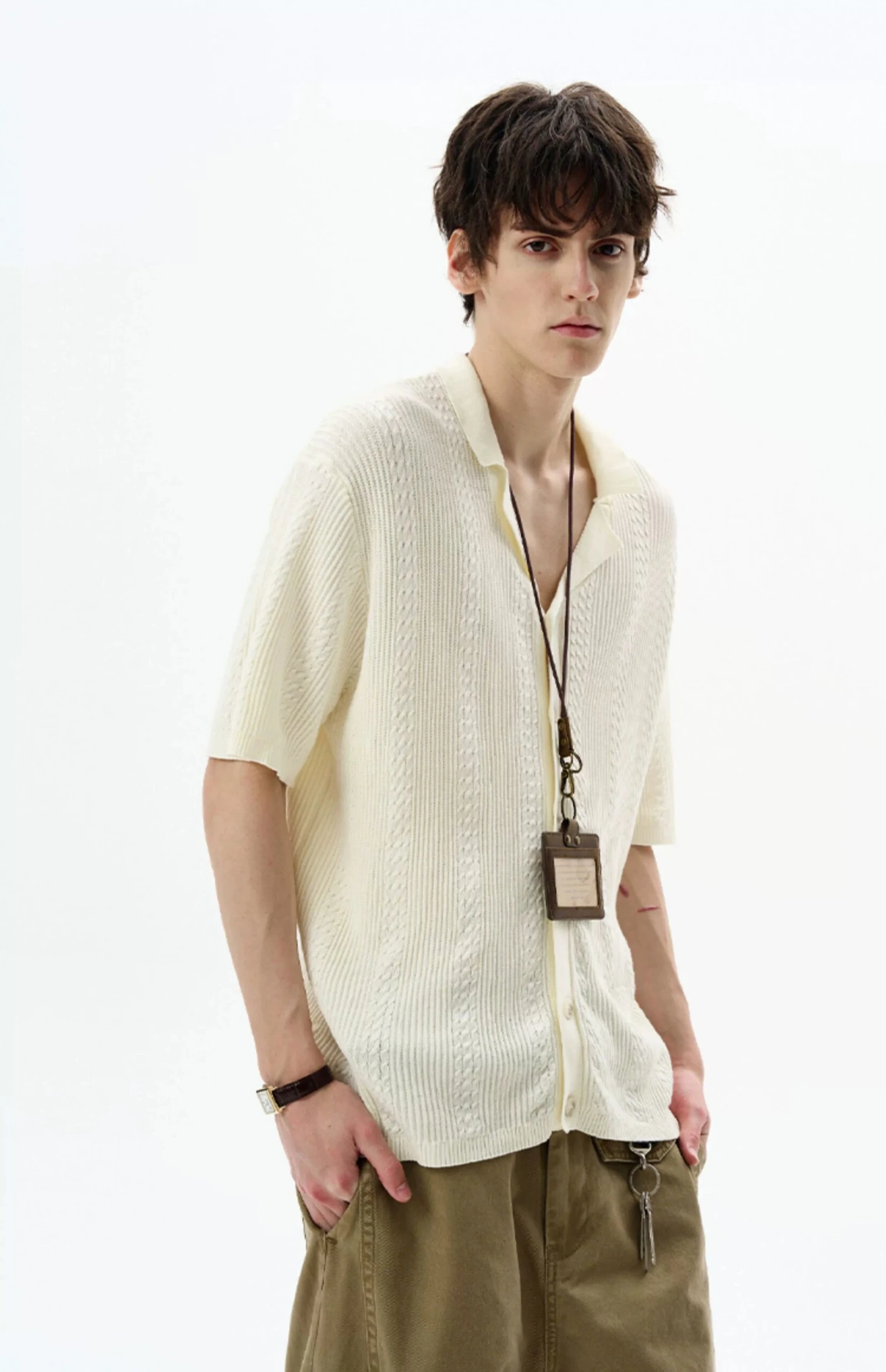 Crafted from soft, breathable knit fabric, it features a spread collar, short sleeves, and a vertical cable pattern that adds depth without feeling too heavy. The button-front closure keeps it classic, while the relaxed fit makes it easy to layer or wear solo. It rides that line between polished and laid-back—wear it open over a tank, or buttoned with wide-leg trousers for a more curated vibe.