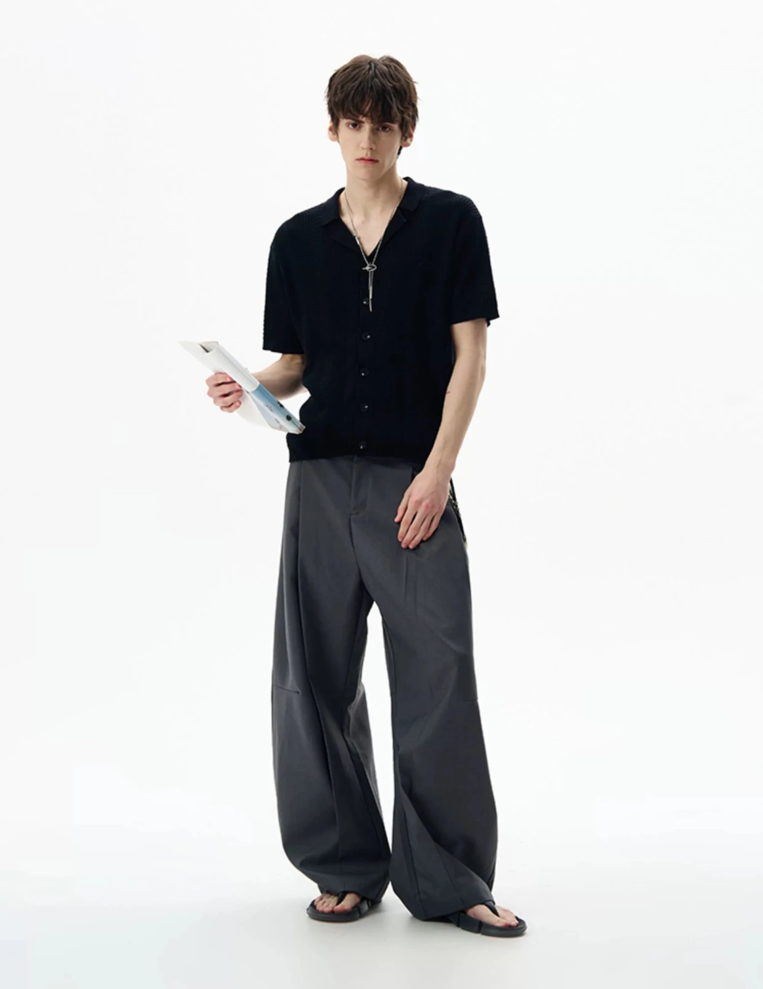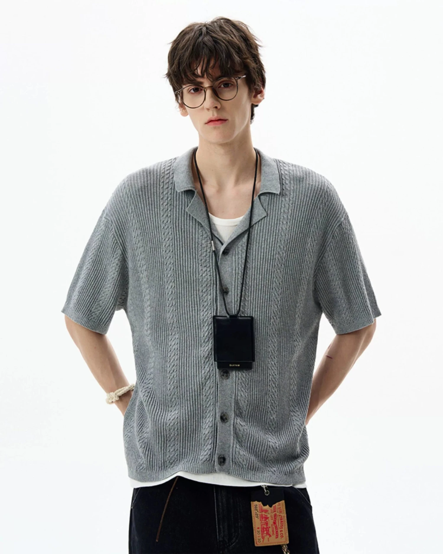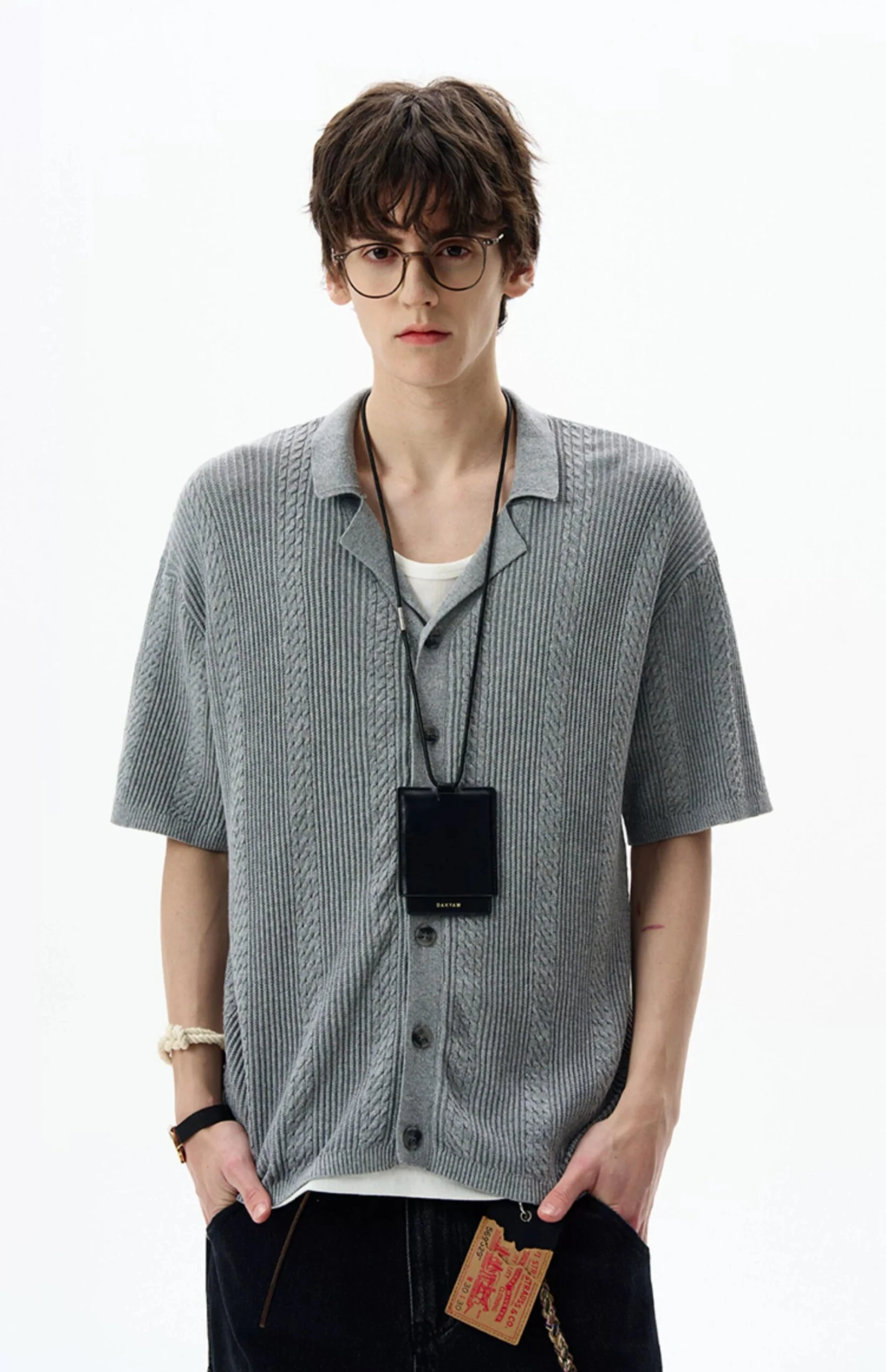 Crafted from soft, breathable knit fabric, it features a spread collar, short sleeves, and a vertical cable pattern that adds depth without feeling too heavy. The button-front closure keeps it classic, while the relaxed fit makes it easy to layer or wear solo. It rides that line between polished and laid-back—wear it open over a tank, or buttoned with wide-leg trousers for a more curated vibe.