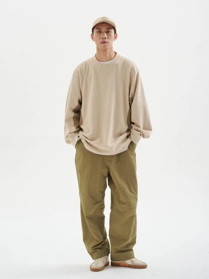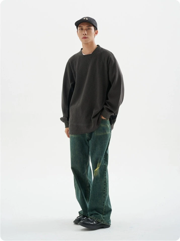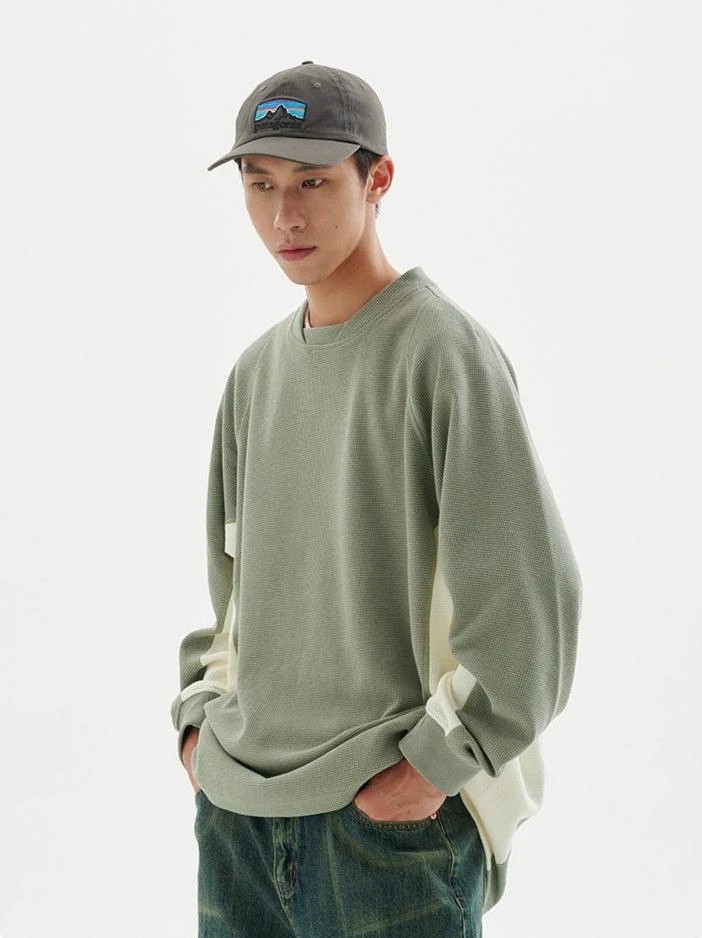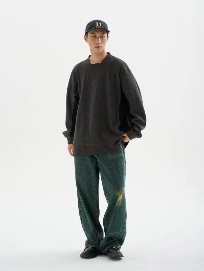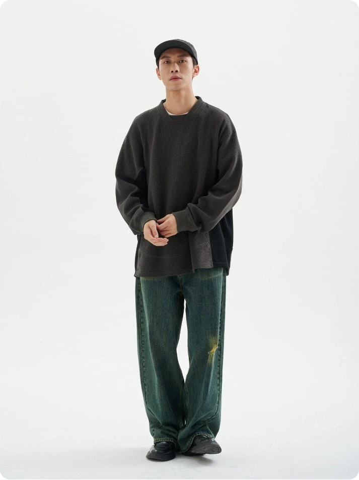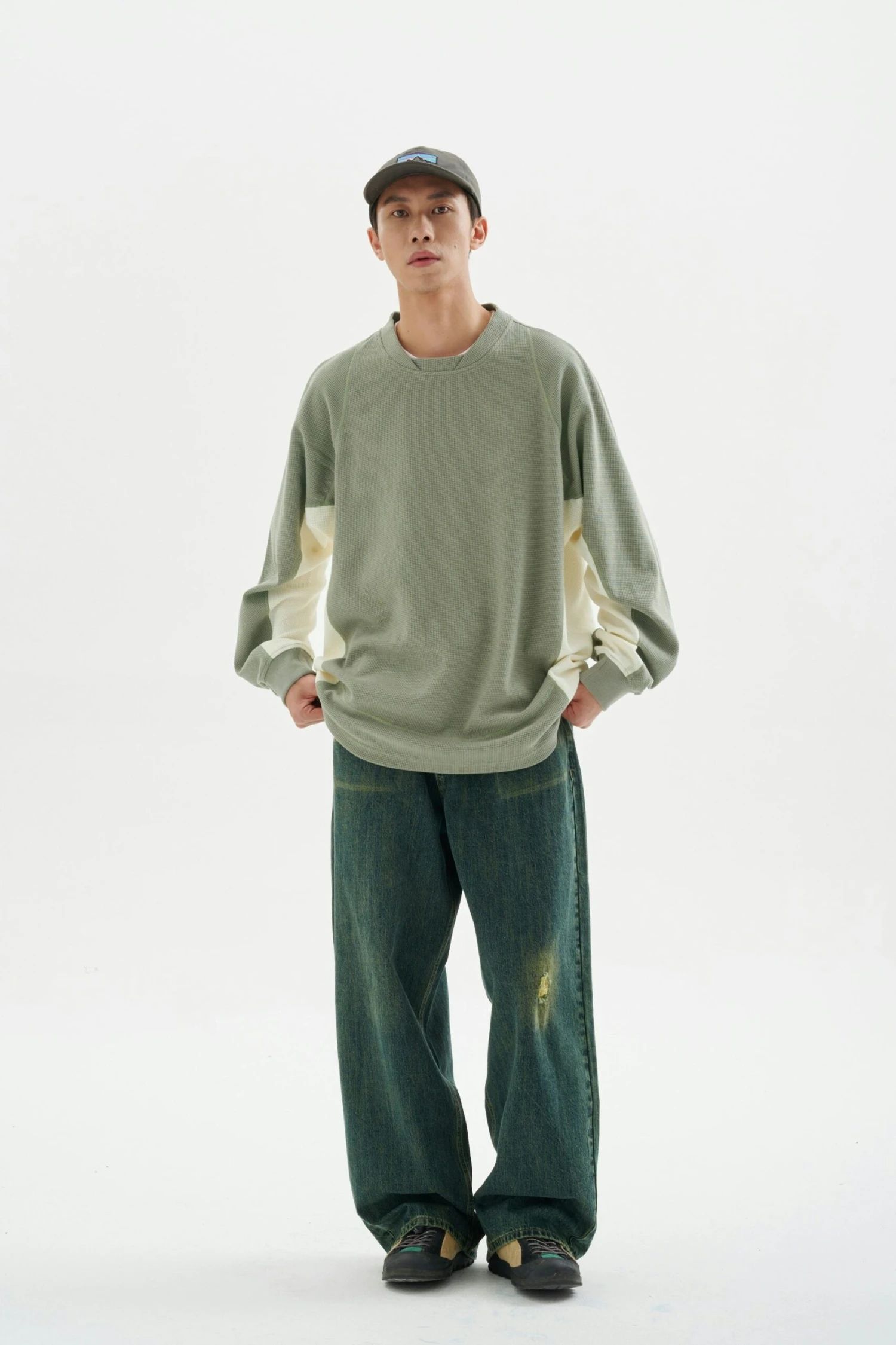 Its loose fit and ribbed detailing on the collar and cuffs add a touch of sophistication to the casual silhouette, while the contrasting color blocks introduce dynamism to your wardrobe without overwhelming it. This crewneck sweatshirt is a versatile piece that can be styled for a casual day out or a relaxed evening in. It pairs effortlessly with jeans or joggers, and its lightweight yet sturdy construction makes it a go-to choice for an understated, stylish look that resonates with the effortlessly cool aesthetic of the shop.